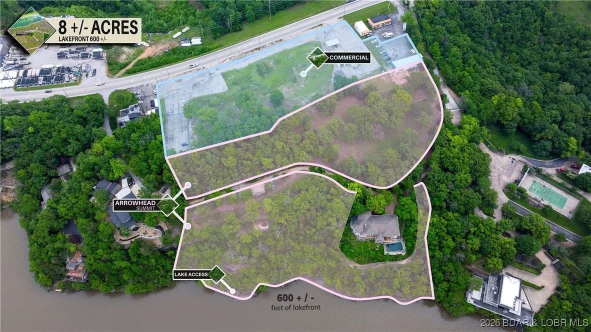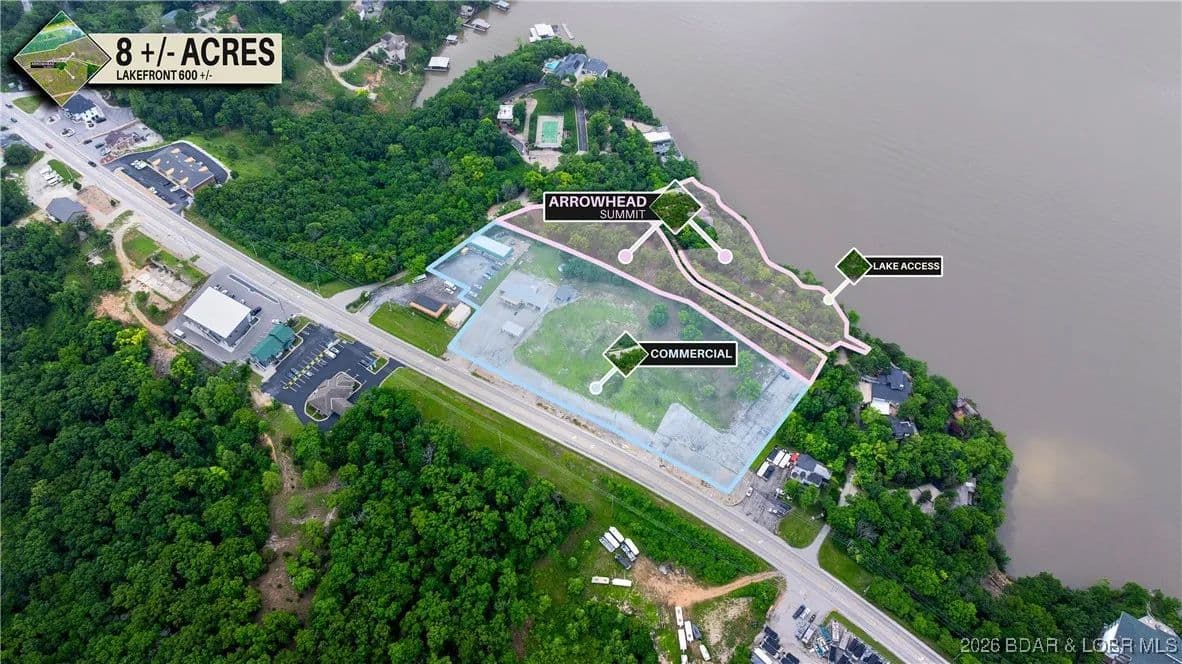 Discover an extraordinary opportunity with this expansive 8+/- acre property that caters to both commercial and residential aspirations. Boasting approximately 596+/- feet of pristine lake frontage, complete with a concrete golf cart path/boardwalk to access the waterfront, and 550+/- feet along Bagnell Dam Blvd, this property offers both high visibility and secluded waterfront privacy. The topography features stunning bluffs and mature trees, creating a backdrop that is as functional as it is breathtaking. Positioned to maximize the spectacular lake views with its unique and unconventional characteristics, it stands ready for the visionary to develop it into a residential paradise and/or a thriving business hub. This is the final prime lakefront mixed-use property available in Lake Ozark. Whether your aspirations involve the development of luxury villas, condominiums, or a boutique hotel, this property's distinctive mixed-use zoning impeccably accommodates such endeavors. Experience the perfect blend of accessibility and solitude in one of the most coveted locations at the Lake of the Ozarks.