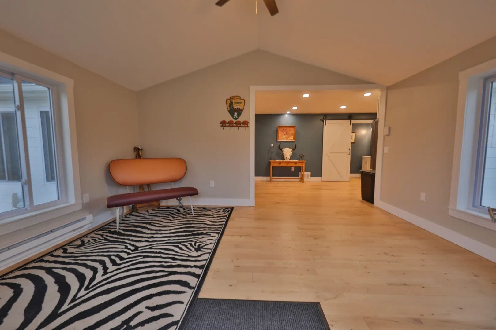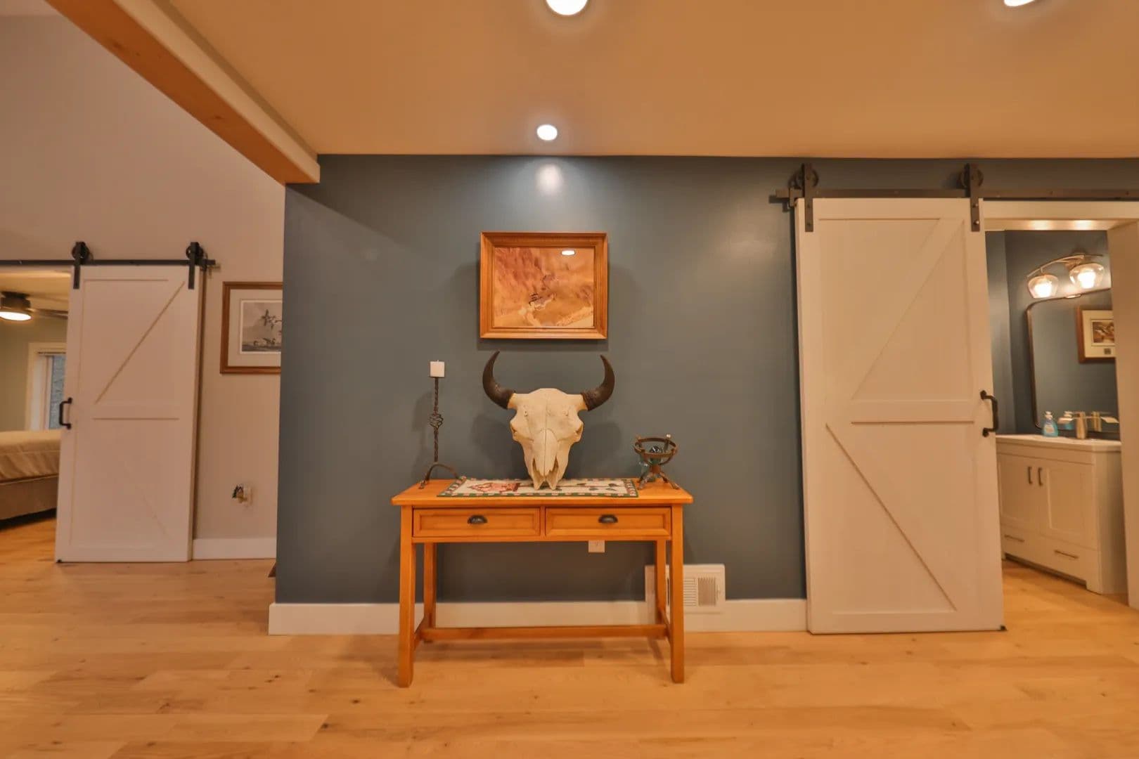 Located just off Highway 14 at the base of a towering ridge. Today, it stands as a refined rural estate — equal parts permanent residence, hunting camp, and legacy investment. The 3-bedroom, 3.5-bath home spans approx. +/- 1,922 square feet with 1-car under garage and has been renovated with contemporary finishes and modern touches. The main level offers a thoughtful layout with private bedroom suites positioned on opposite wings for comfort and convenience. The lower level includes an additional bedroom, office space, bath, and — ideal for guests, family, or outfitter-style lodging.