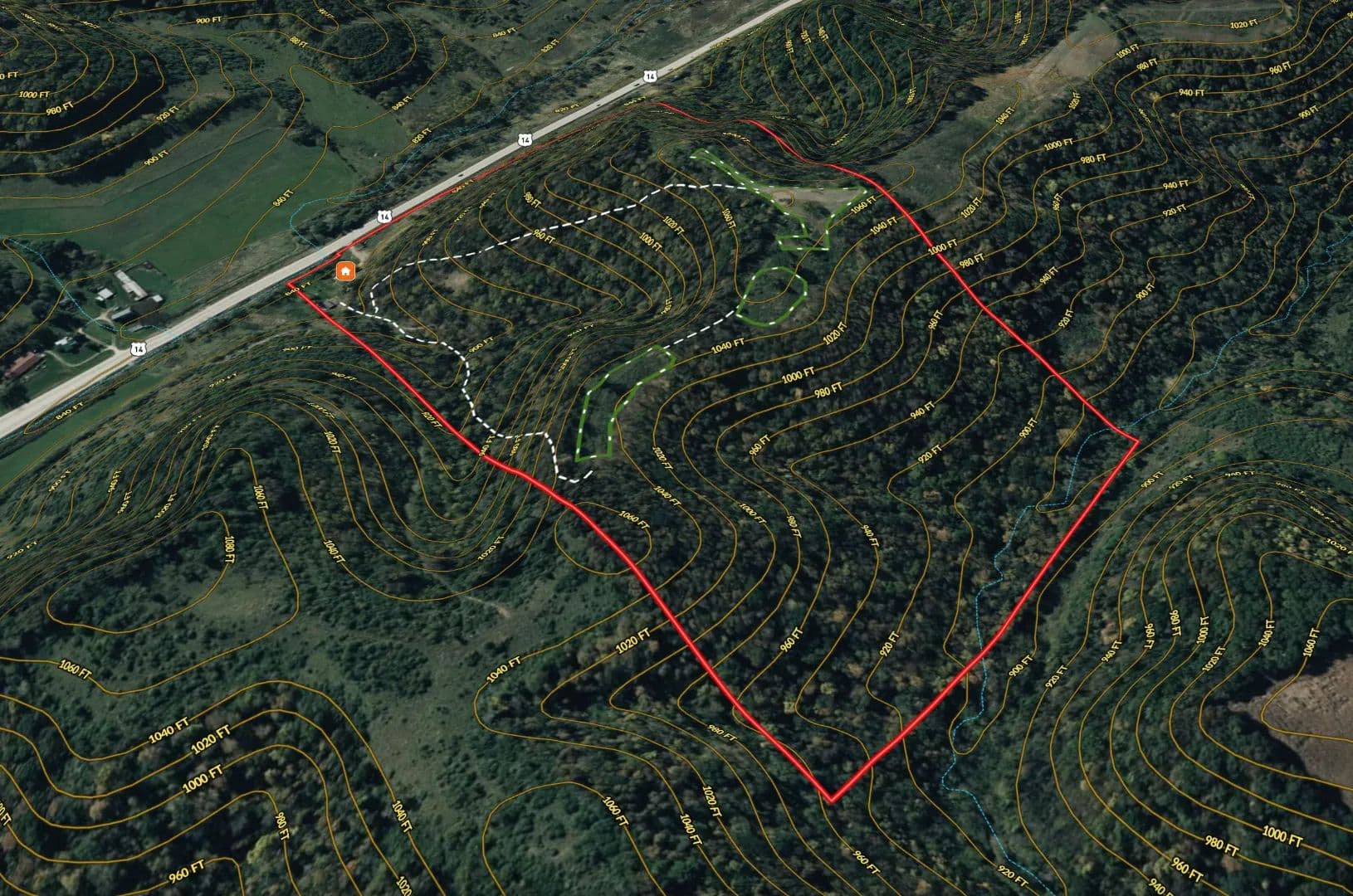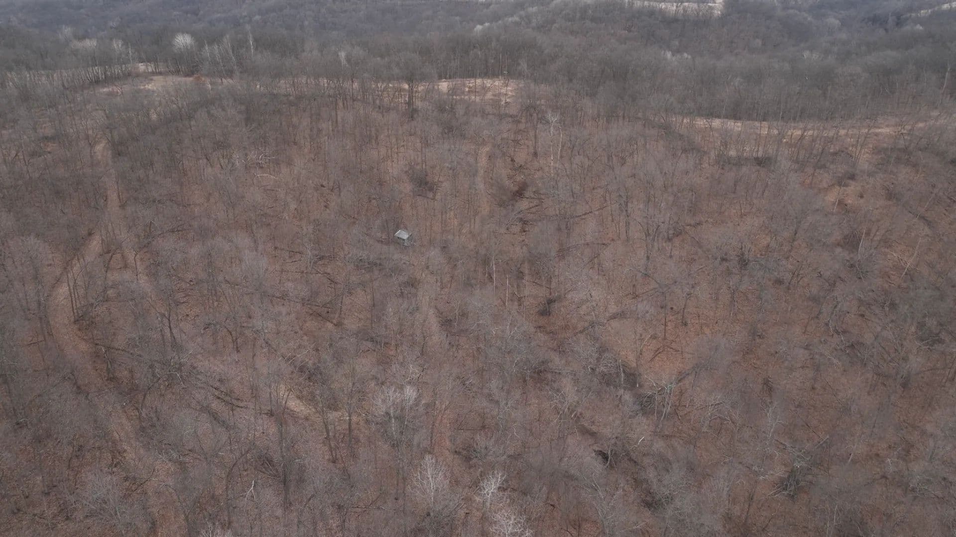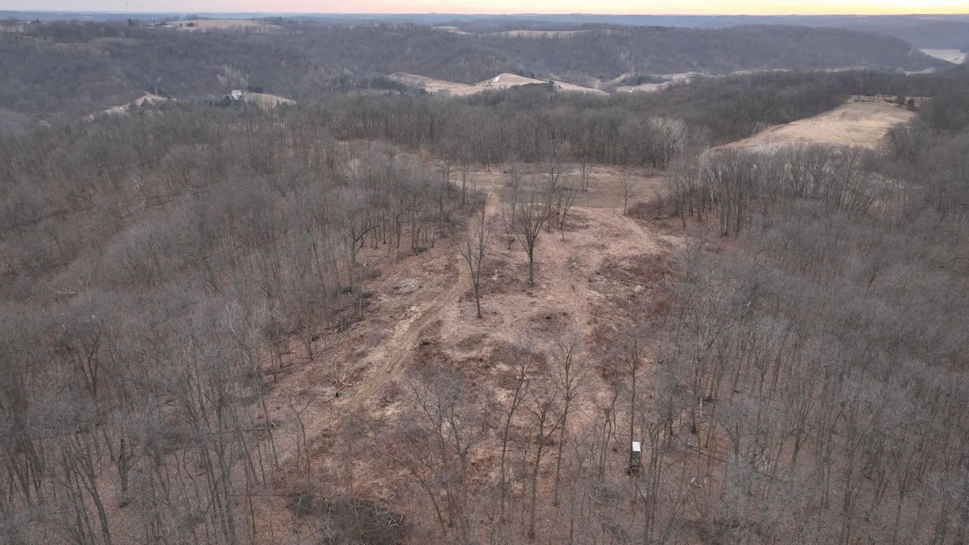 The trail system is extensive allowing access to stand locations regardless of wind direction. Some treestands and two older box blinds are positioned around natural benches, saddles, ridge points, and bedding knobs that naturally concentrate deer movement. This is textbook Driftless topography — the kind that funnels rutting bucks through predictable travel corridors year after year.