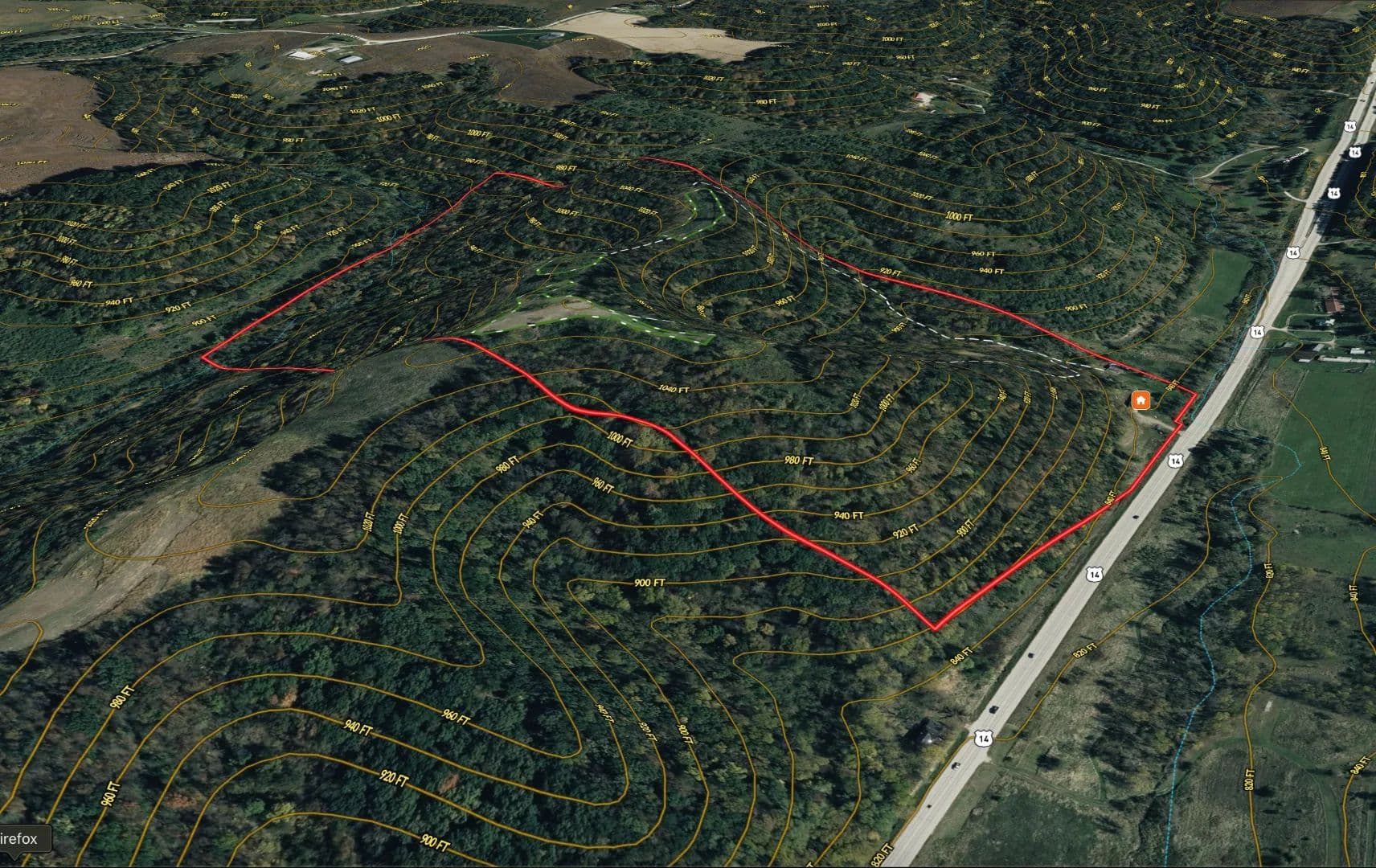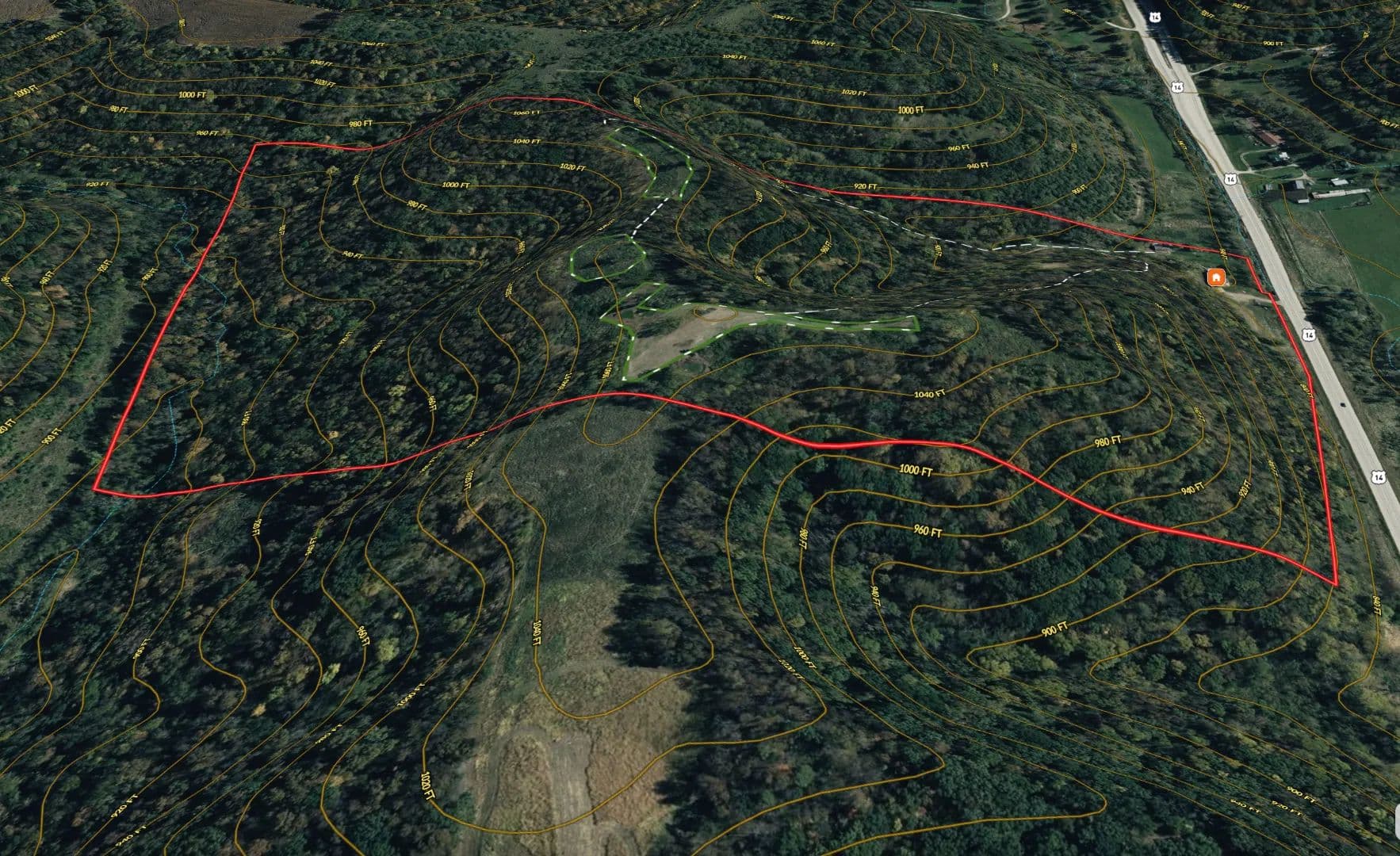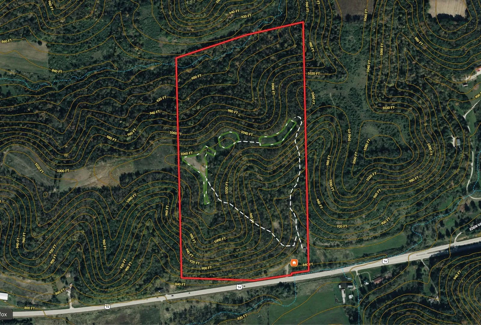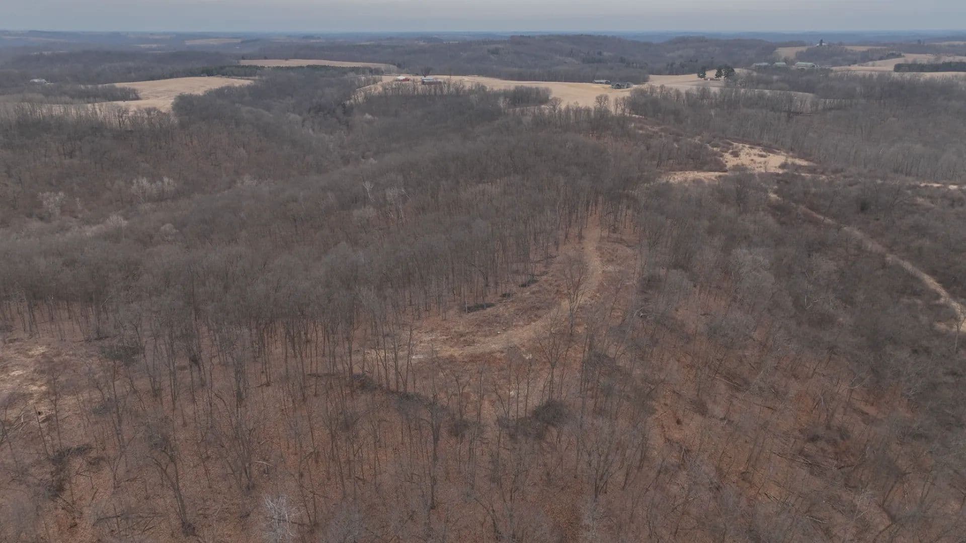 The trail system is extensive allowing access to stand locations regardless of wind direction. Some treestands and two older box blinds are positioned around natural benches, saddles, ridge points, and bedding knobs that naturally concentrate deer movement. This is textbook Driftless topography — the kind that funnels rutting bucks through predictable travel corridors year after year.