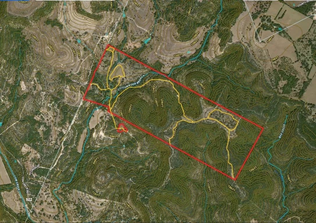 Wet weather Cottonwood Branch Creek runs through the property and drains into the well-known live water Cow Creek not far away. Elevations range over 320 feet on the ranch from a low of 1,020 feet at the bottom of Cottonwood Branch on the south side of the property to a high elevation of 1,340 feet on the northeast part of the property. These elevations allow for panoramic views of the surrounding Hill Country with multiple high locations and multiple canyons. The terrain is rough, rocky and dramatic and includes some very interesting limestone shelfs and outcrops. The soil supports native oak, elm, juniper, and mesquite trees as well as native grasses and other vegetation. Wildlife includes whitetail deer, coyotes, turkeys, mourning dove, and many other native wildlife species. The property is currently used for grazing and recreation.