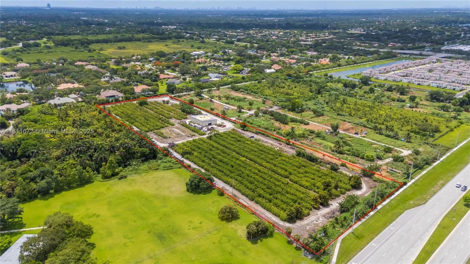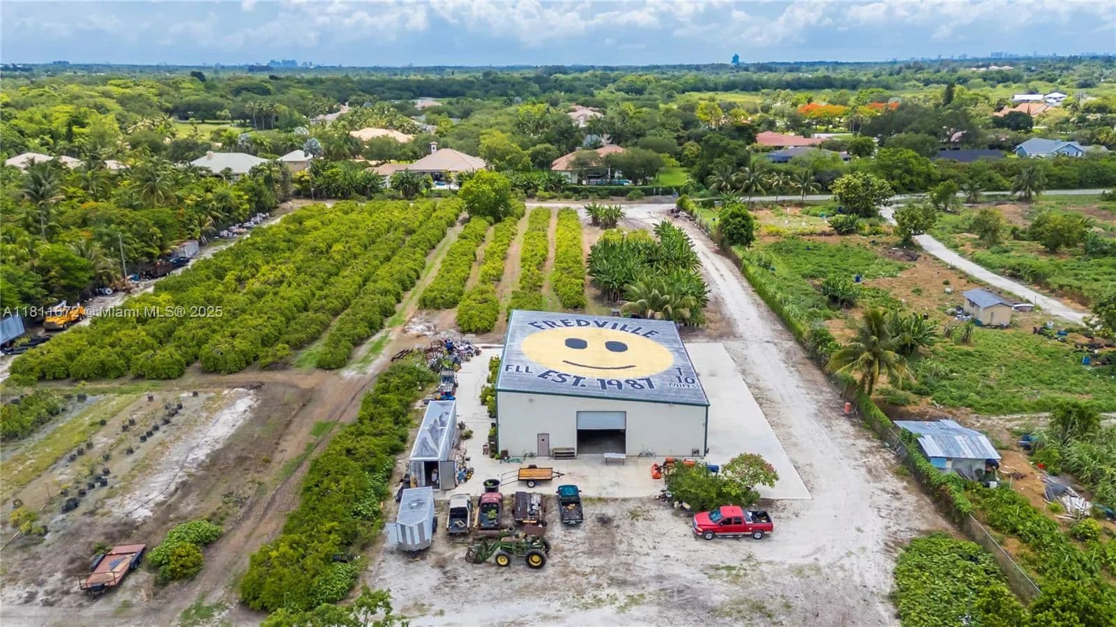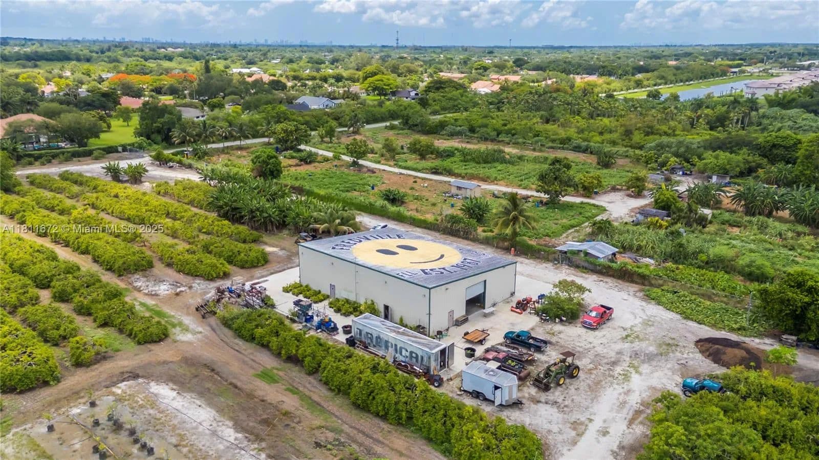 8.9 Acres! Unique property in Davie surrounded by million-dollar homes in a fast-growing, family-friendly area with "A" rated schools. Fronts Flamingo Rd, backs Flamingo Gardens, and borders the gated Ridge at Laurel Oaks. Fully fenced with gated access. Operating tropical fruit grove since 1987 with ~1,000 starfruit trees and other varieties (macadamia, avocado, banana, etc.). Features include a 5" well, advanced irrigation, very low ag taxes, and a 4,800 sf insulated steel building (Cat 5+ rated) with 1,140 sf A/C space, 2 kitchens, 2 baths, and 3 offices. Industrial features: mezzanine, 800A power, racking, security system. Includes prepped 1-acre homesite for a 4,000 sf home. Ideal for family compound, agribusiness, or investment. Agriculturally assessed, very low taxes.