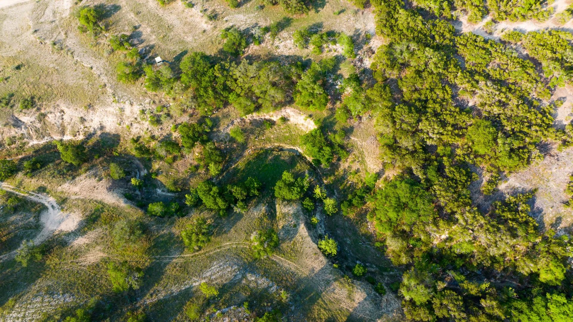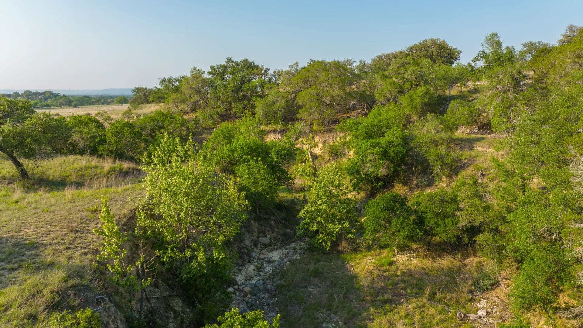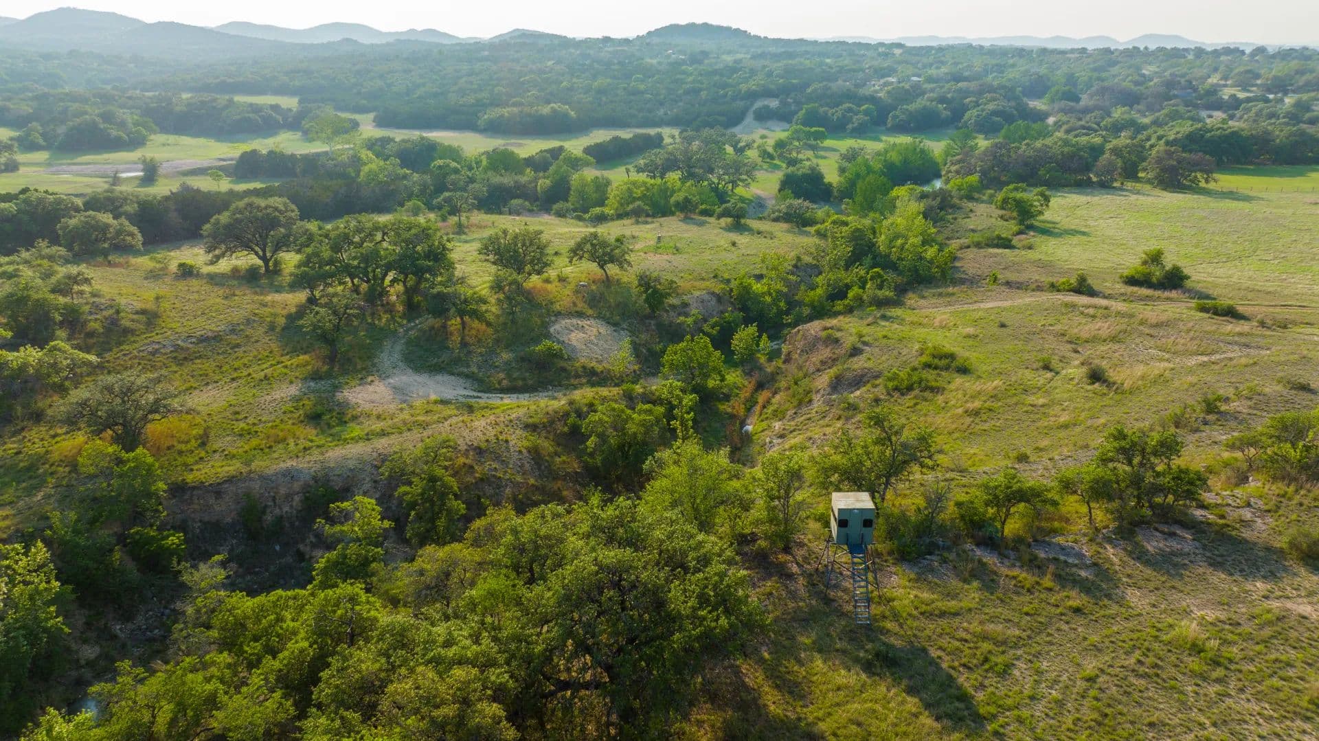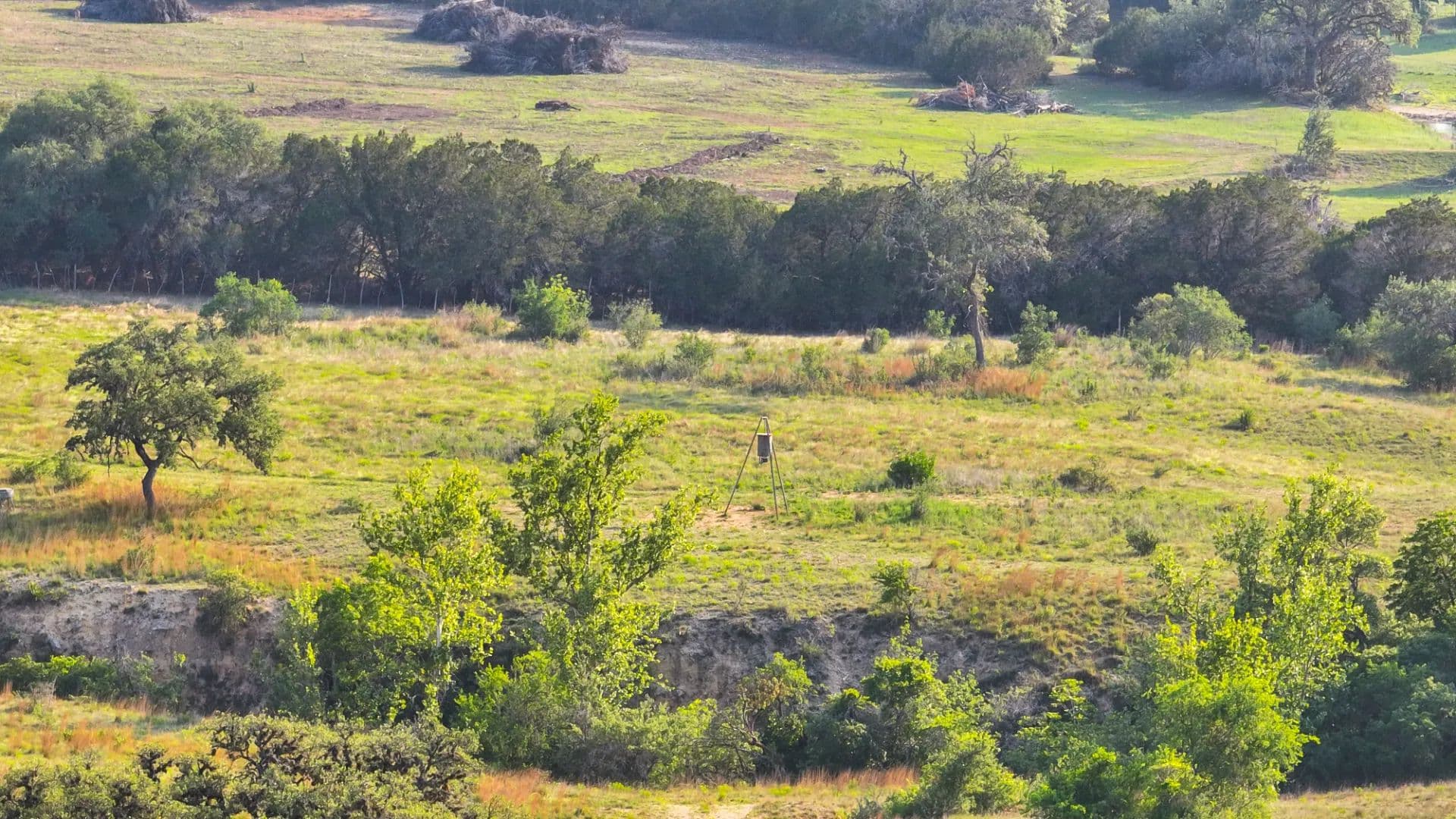 On the southeast side of the property, a scenic ridge stretches toward the back of the ranch, covered in mature trees and offering excellent building sites. The southwest portion features a draw that meanders through the property and leads down to Cypress Springs Creek, a favorite area for roaming wildlife. Elevations range from approximately 1,380 feet to the highest point at 1,450 feet.