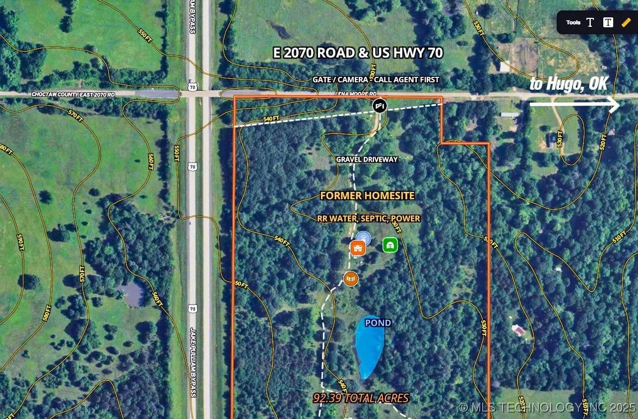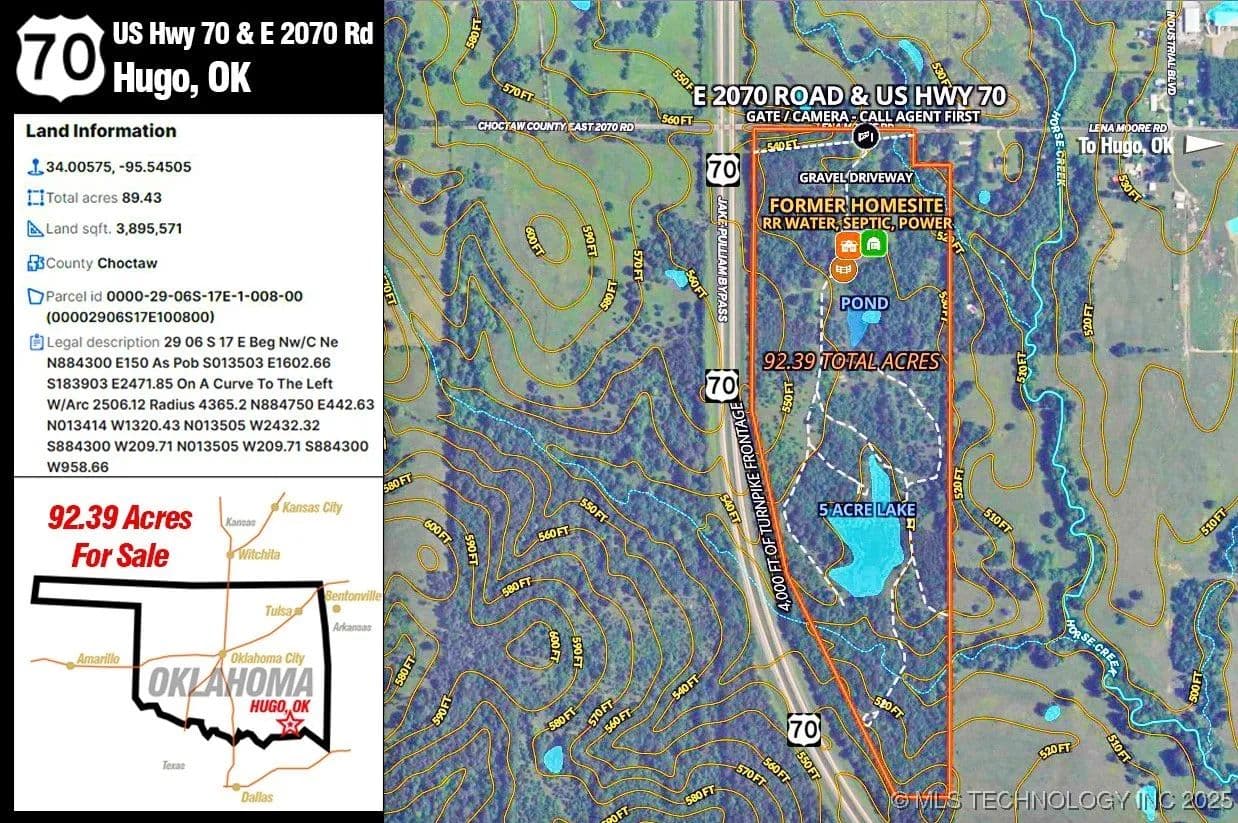 This 93.39± acre tract (survey on file) offers a rare opportunity to own a highly visible and versatile property with over 4,000 feet of frontage along US Highway 70 (Jake Pullman Bypass) in Choctaw County, located just 2 miles west of Hugo, Oklahoma. The extensive highway frontage provides excellent access and long-term development potential while still preserving the privacy and natural beauty of the land. The property is development-ready, featuring a former homesite that has been removed and existing septic system, well/rural water, electric, and cable already on site, significantly reducing time and cost for future improvements. The land itself is both functional and scenic, highlighted by a 5± acre lake, an additional ¾± acre pond, and a network of established trails winding through gently rolling terrain.