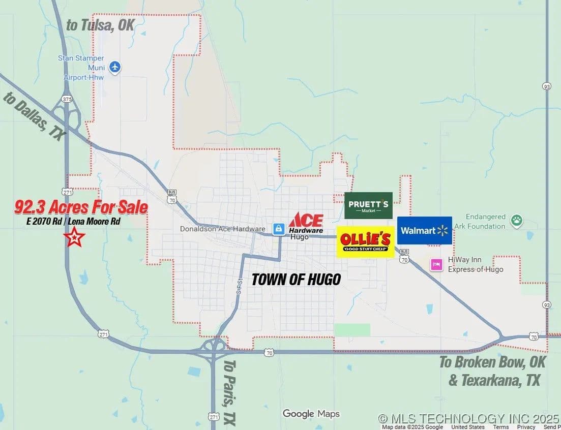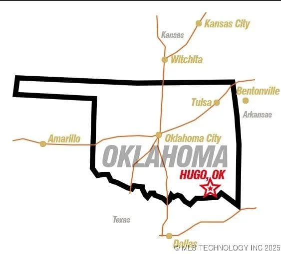 Ideally situated approximately 2.5 hours from Dallas, Texas, 3 hours from Oklahoma City, Oklahoma, and 2.5 hours from Tulsa, Oklahoma, the property benefits from direct access to US Highway 70, a major east–west transportation corridor. Hugo and Choctaw County due to their proximity to the Dallas–Fort Worth Metroplex, strong regional infrastructure, lower land costs with appreciation potential, recreation-driven demand, and a development-friendly environment with favorable taxes. Just 10 miles from Choctaw Casino. Please call agent for showings - Buyer Agents welcome! GIS code: 34.00575, -95.54505. Please see images for maps and directions. Land ID: https://id.land/maps/551dd242395fb65f6e249964c3f03739/share