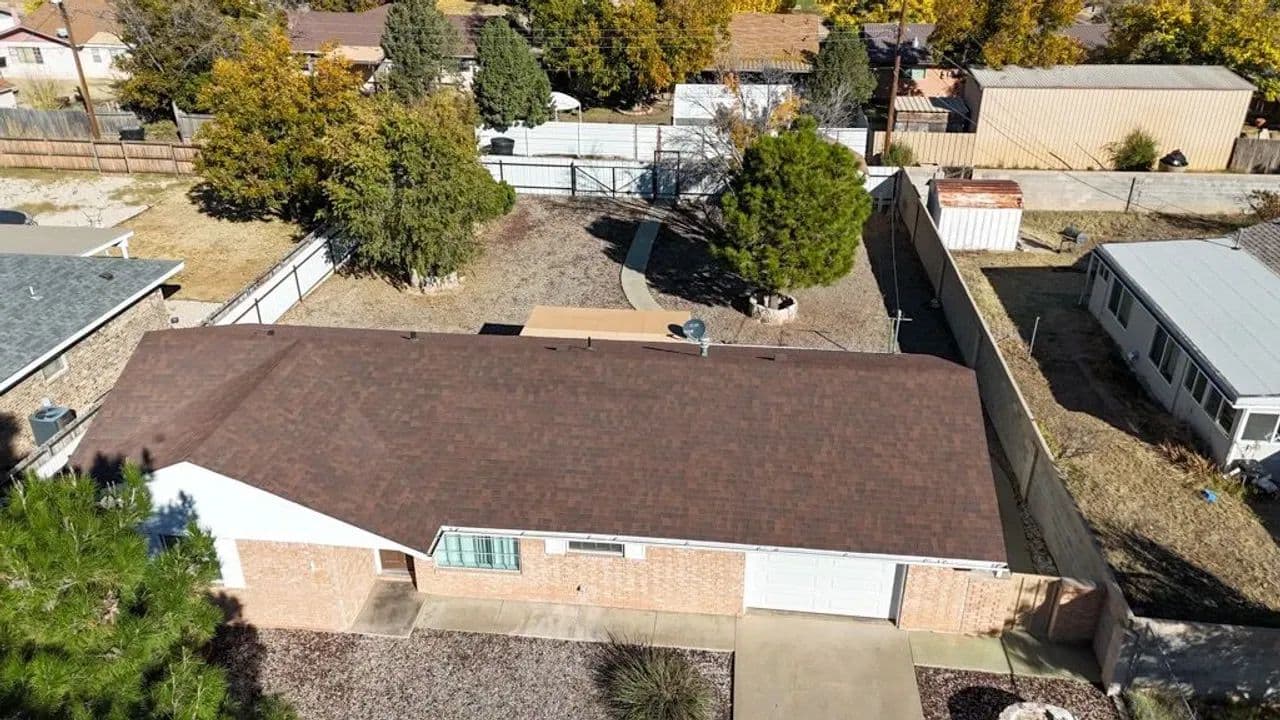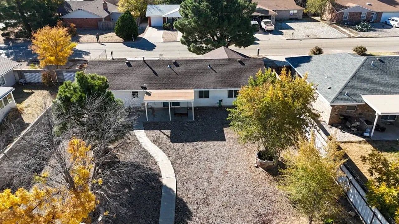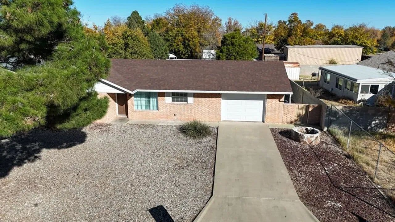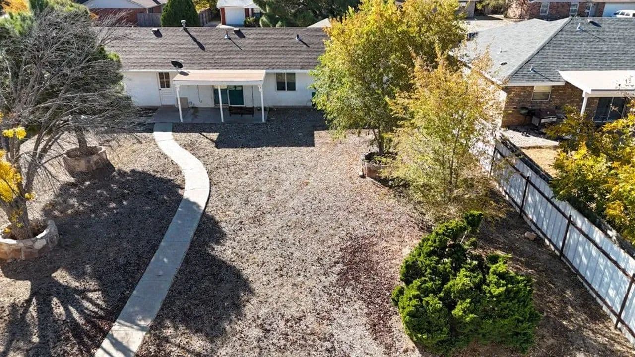Charming Single-Family Home with Spacious Enclosed Back Yard This well-maintained 2-bedroom, 1.5-bath ranch-style homesituated on a spacious .26-acre lot in Roswell. This property offers an open floor plan with an attached one-car garage featuring anewer (1 year old) garage door, along with recent exterior updates including an approximately 5 year old shingle roof and newgutters. The large, fully enclosed backyard provides privacy and versatility, complete with a 16-foot gate for easy vehicle, RV, orequipment access from the alley and a storage shed. Enjoy outdoor living from the covered back porch, accessible through asliding glass door, perfect for relaxing or entertaining. Low-maintenance gravel landscaping surrounds the home, accented bylarge mature trees that add shade and character to the property. This home offers comfort, practicality, and room to enjoy bothindoor and outdoor living. Conveniently located on the growing north side of Roswell near shopping and dining.