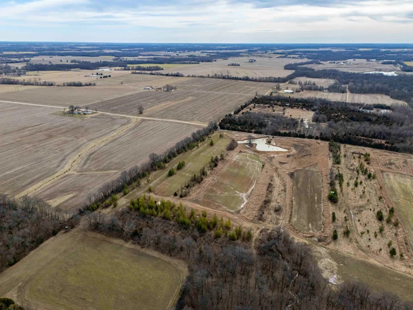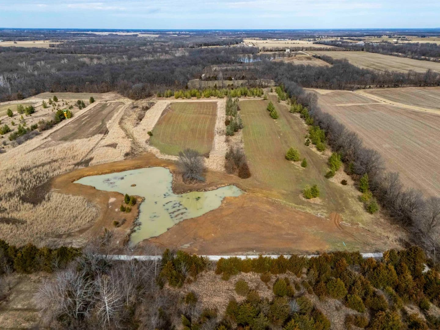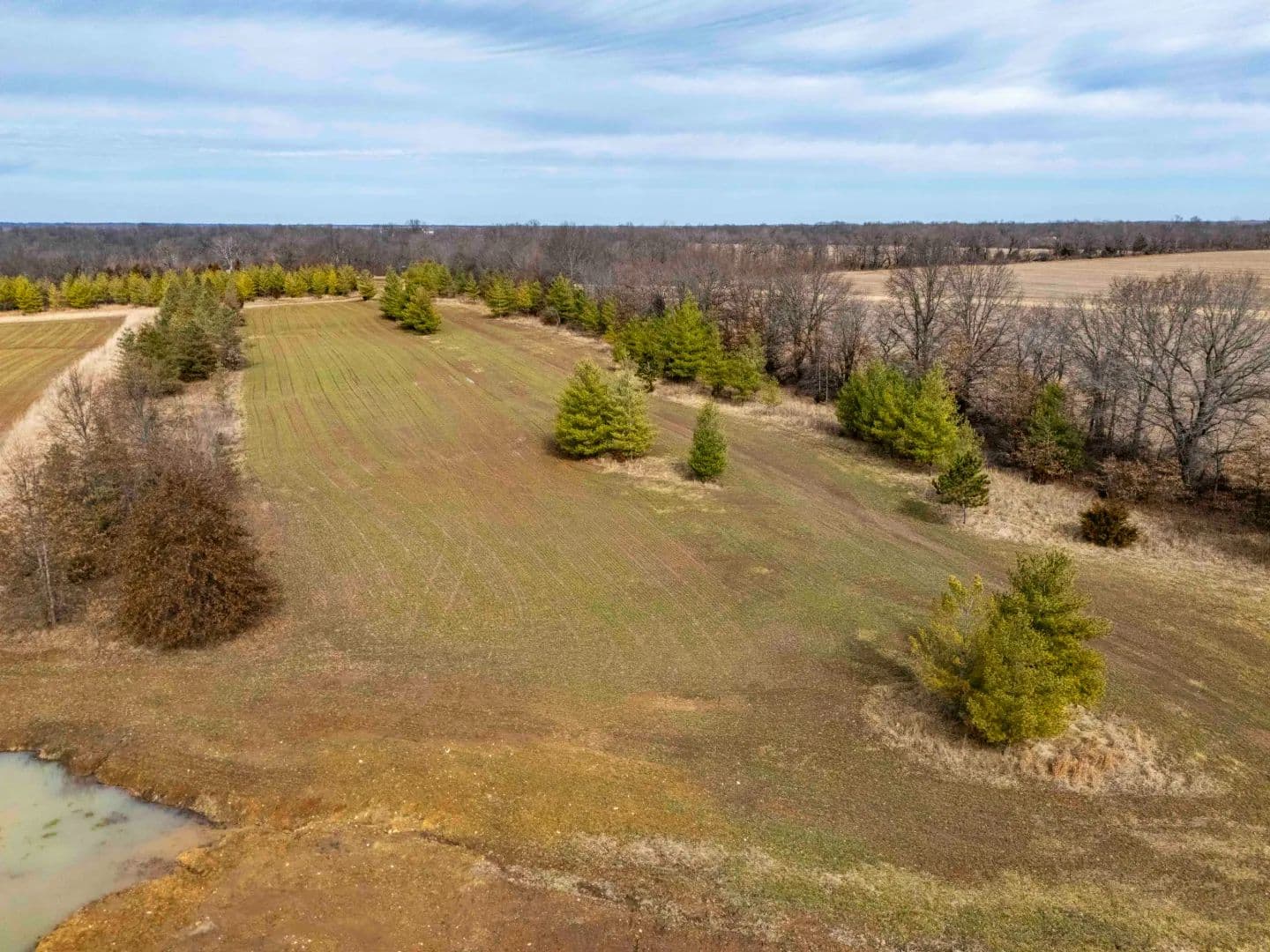 A newly constructed pond adds both function and recreational value. It serves as a water source and attracts wildlife, making the property suitable for hunting and outdoor use. The mix of open ground, water, and tree cover supports deer, turkey, and other wildlife common to the area.