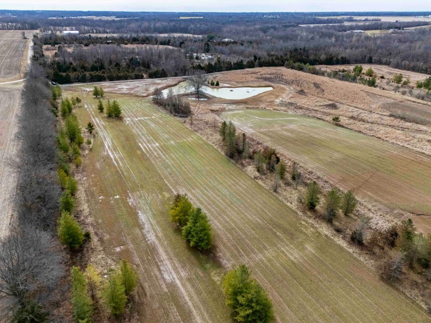 The farm is mostly open with a portion currently planted in wheat. A stand of white pine trees offers natural cover and adds to the overall setting. The open ground could also be used for hay production, pasture, or continued row crop farming.