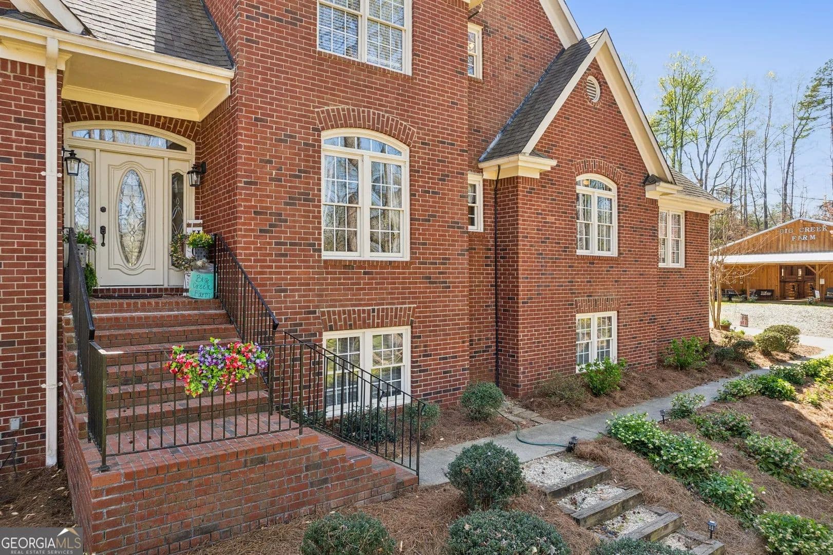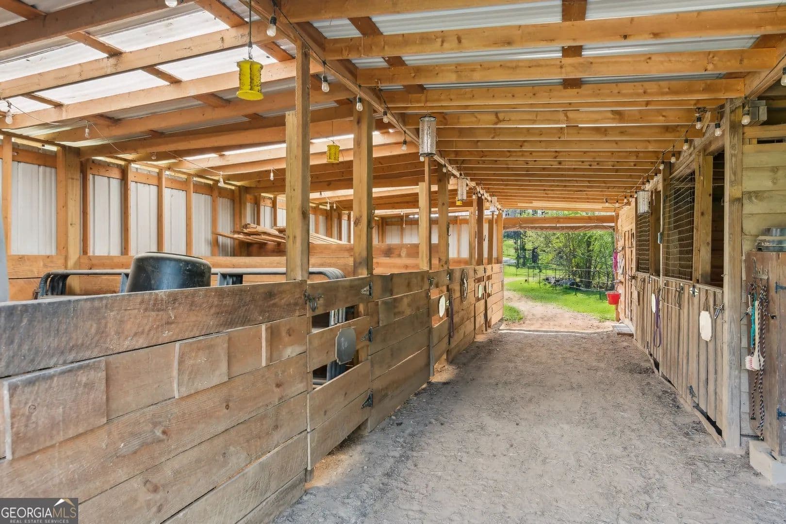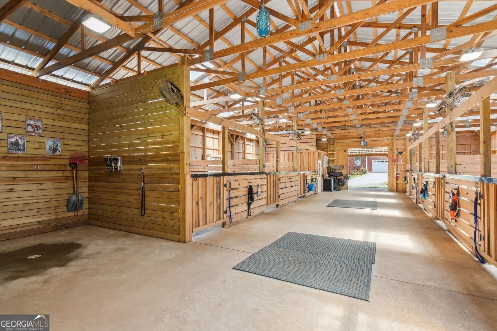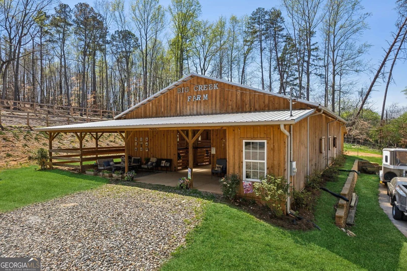 Tucked away in the heart of Hall County with a coveted Buford City address, this private 13 acre equestrian retreat offers the perfect blend of serene country living and urban convenience. Located within the award-winning Buford City School District, this 4 sided brick 4-bedroom, 3.5-bath home features a main-level master suite and is designed for both personal enjoyment and income potential, whether as a private farm or a boarding facility. Spanning 5 fenced and cross-fenced pastures, the property is well equipped with horse wire and electric rope fencing, including a large run-in shed with feeding access windows in Field 3. The arena, situated on the hill above the main barn, boasts M10 footing, lights, excellent drainage, and natural shade throughout the day. Enjoy scenic horseback riding, ATV, and biking trails winding through the landscape, as well as access to a creek with swimming holes, perfect for both horses and riders. Additional features include two chicken coops with runs and perimeter fencing, a shaded, fenced backyard off the deck ideal for children and pets, a trailer parking pad, and a separate gravel driveway leading to the main barn. A fenced driveway with an underground doorbell connects directly to the farmhouse, ensuring security and privacy. The main barn (88x52) is thoughtfully designed with eight stalls featuring M10 drainage, mats, fans, and 12x12 runs with windows, allowing for natural light through overhead skylights and metal stall caps providing easy cleaning and protection. This barn also includes an extra-large foaling stall run connected to the first stall, a wash rack with drainage, a sealed tack room, a separate feed room, and a hay/equipment shed. Security is paramount, with cameras installed throughout. The entire barn is fully wired with lights and outlets, all GFCI protected, with metal-clad wiring to guard against rodent damage and metal outlets and switch housings for enhanced durability. The lower barn (34x48) offers an additional six stalls, all benefiting from overhead skylights for natural light, along with hay storage and an enclosed tack room. With its limitless potential, this exceptional equestrian estate is a rare find in Buford, offering a unique opportunity for a family farm, personal retreat, boarding business, or even a new wedding venue! Just minutes from the Mall of Georgia, a short drive to Lake Lanier for watersports, and within easy reach of the North Georgia mountains, this property provides an ideal balance of recreation, relaxation, and accessibility. Don't miss the chance to make this versatile and beautifully maintained property your own!