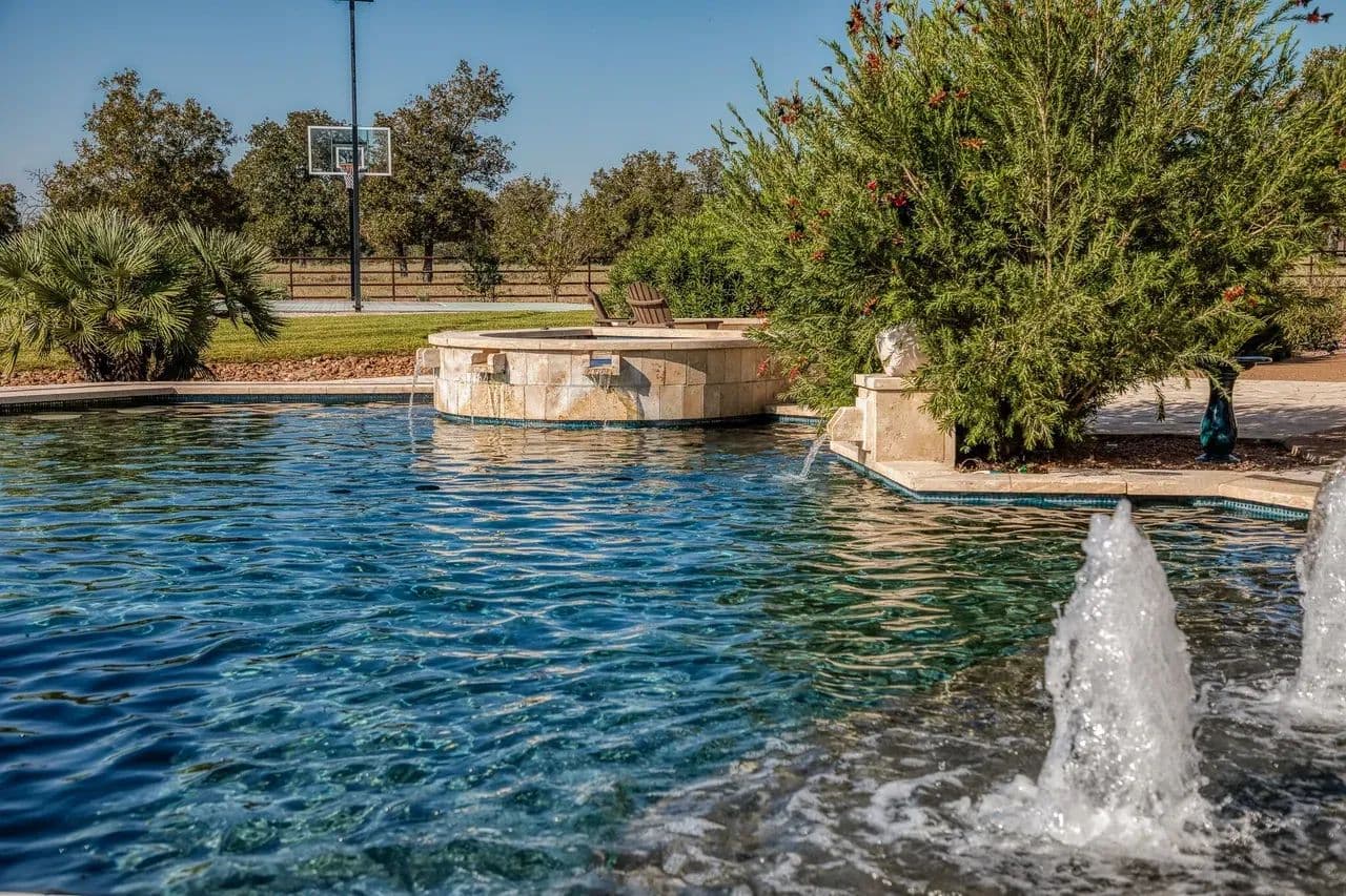 Resort-style pool and spa with bubblers and sheer-descent water features