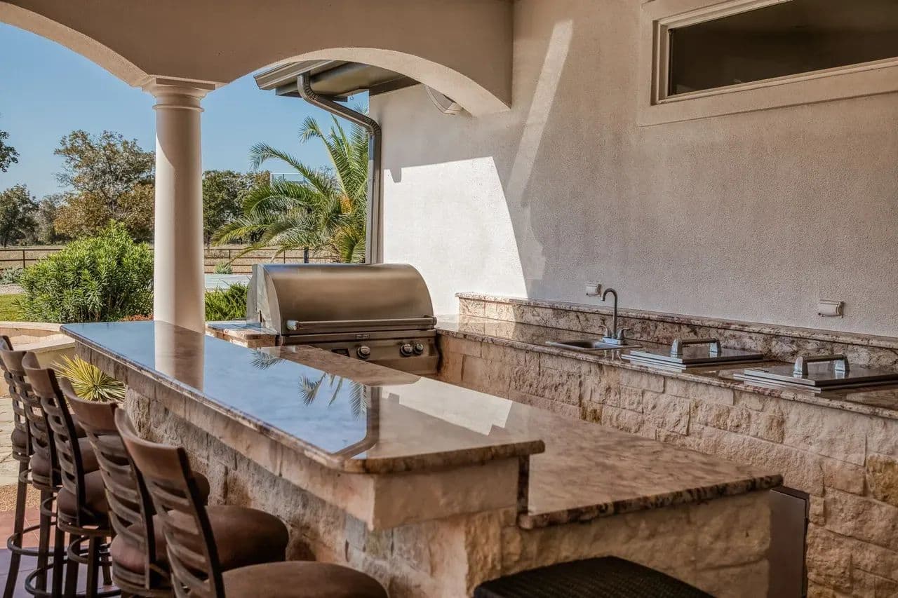 Outdoor kitchen and bar with granite tops, built-in grill, refrigerator, coolers, sink, TV, and sound system