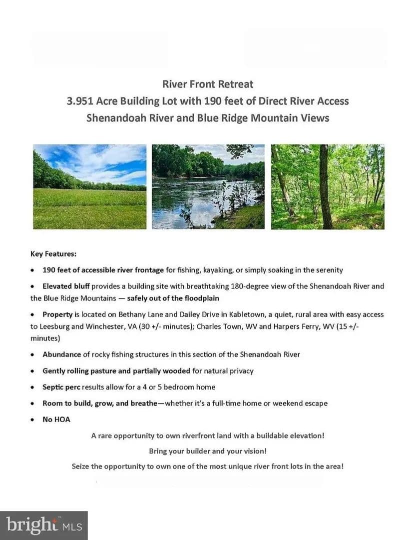 River Front Lot with Million Dollar Views and 190 feet of river frontage perked and surveyed. Build your Dream Home on the 40 Foot bluff that gives you 180-degree views of the Shenandoah River and Blue Ridge mountains. The river frontage is level with enough room for an RV or a tent and there is no HOA. This almost 4-acre lot is in the country but is still convenient to Leesburg, Frederick and shopping. Take the time to enjoy the views and the wildlife surrounded by farmland. Call now for a showing.