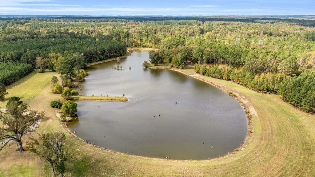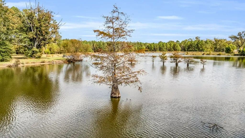 The property’s 10-acre private lake was custom-built with a 5:1 slope levee, concrete boat ramp, and concrete emergency spillway. It’s stocked with F1 Tiger Bass, and trophy bass over 10 pounds have been caught and released. With over $15,000 in artificial fish habitat, live cypress trees, custom pond design, and automatic feeders, this lake is a serious angler’s paradise.