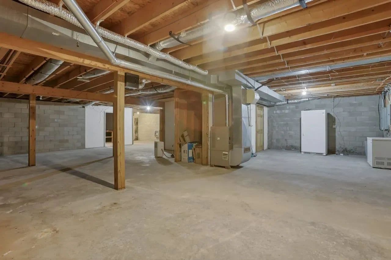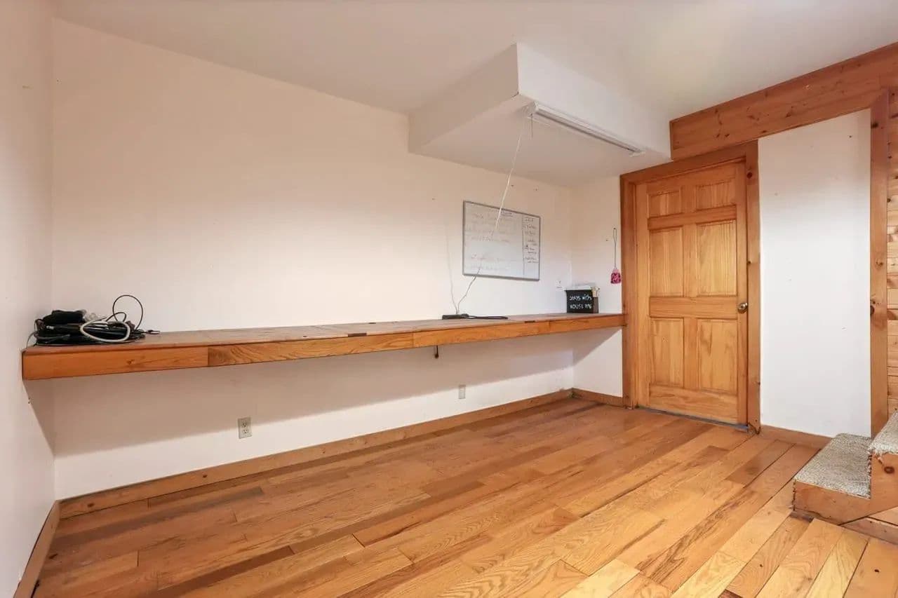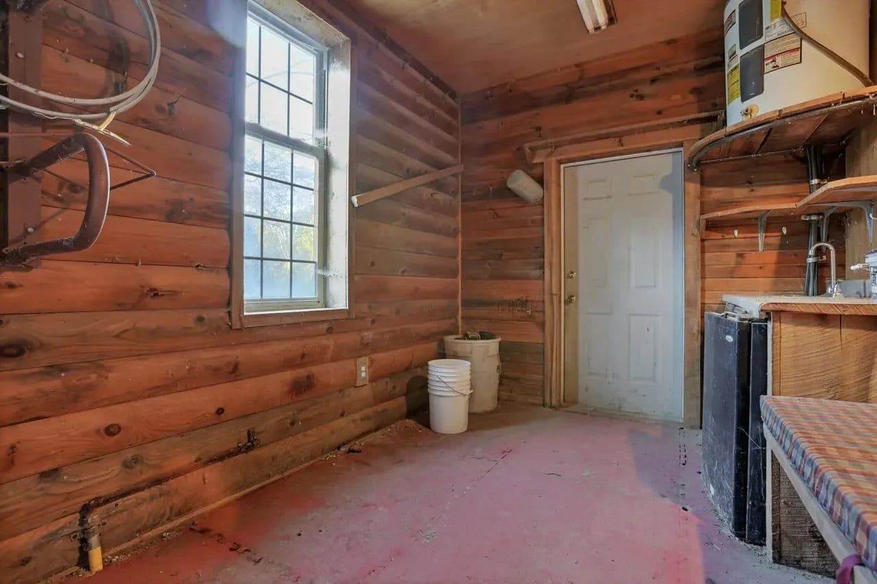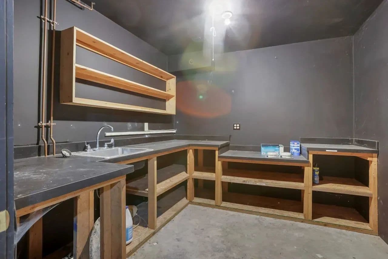 Full basement with desk, office area, and meat processing room with stainless steel sink