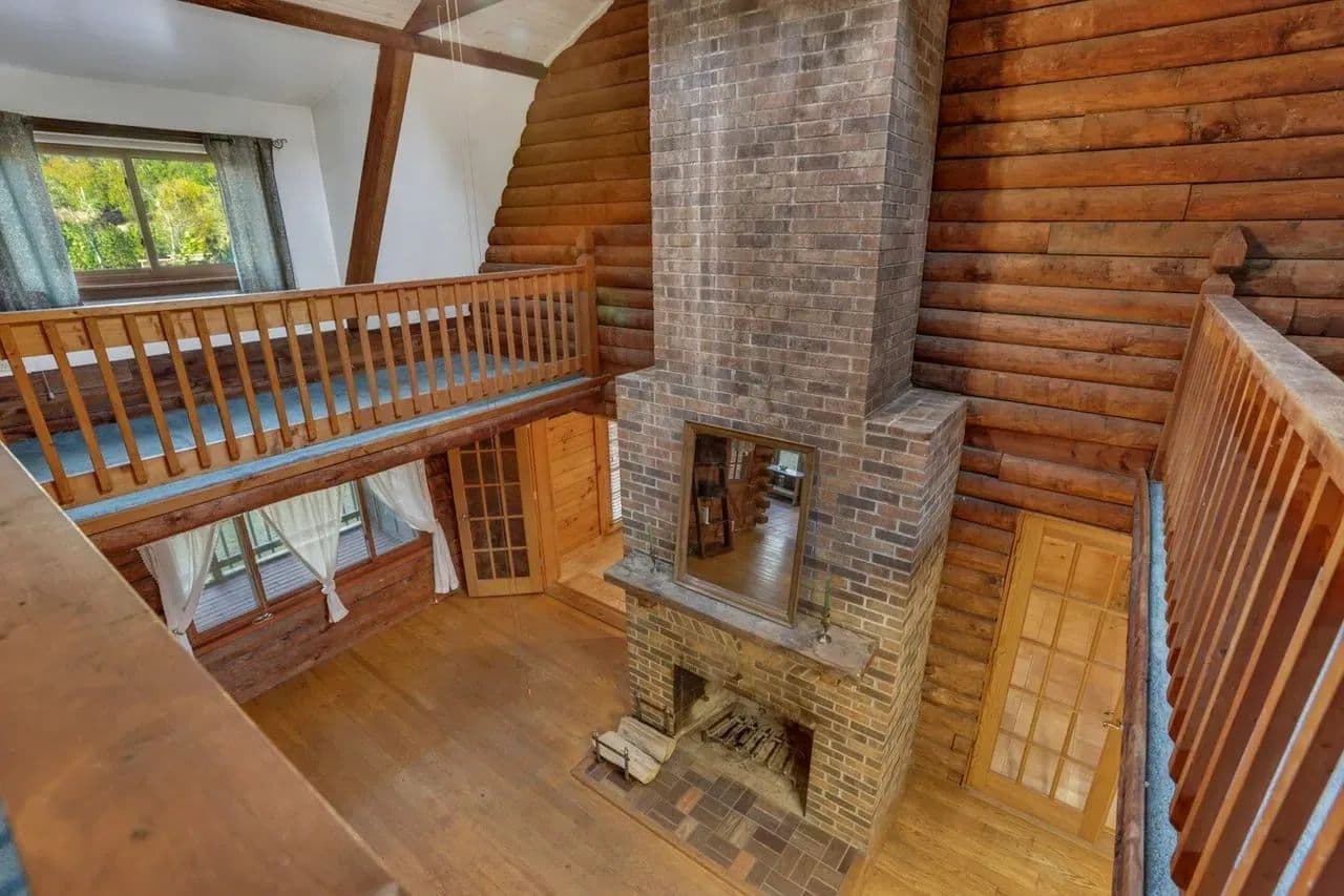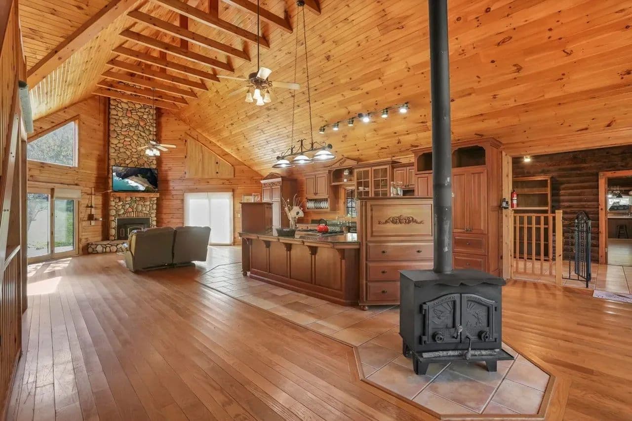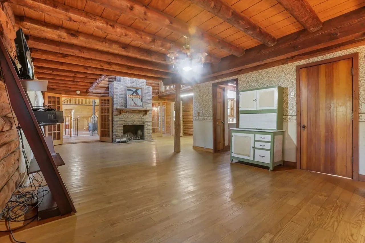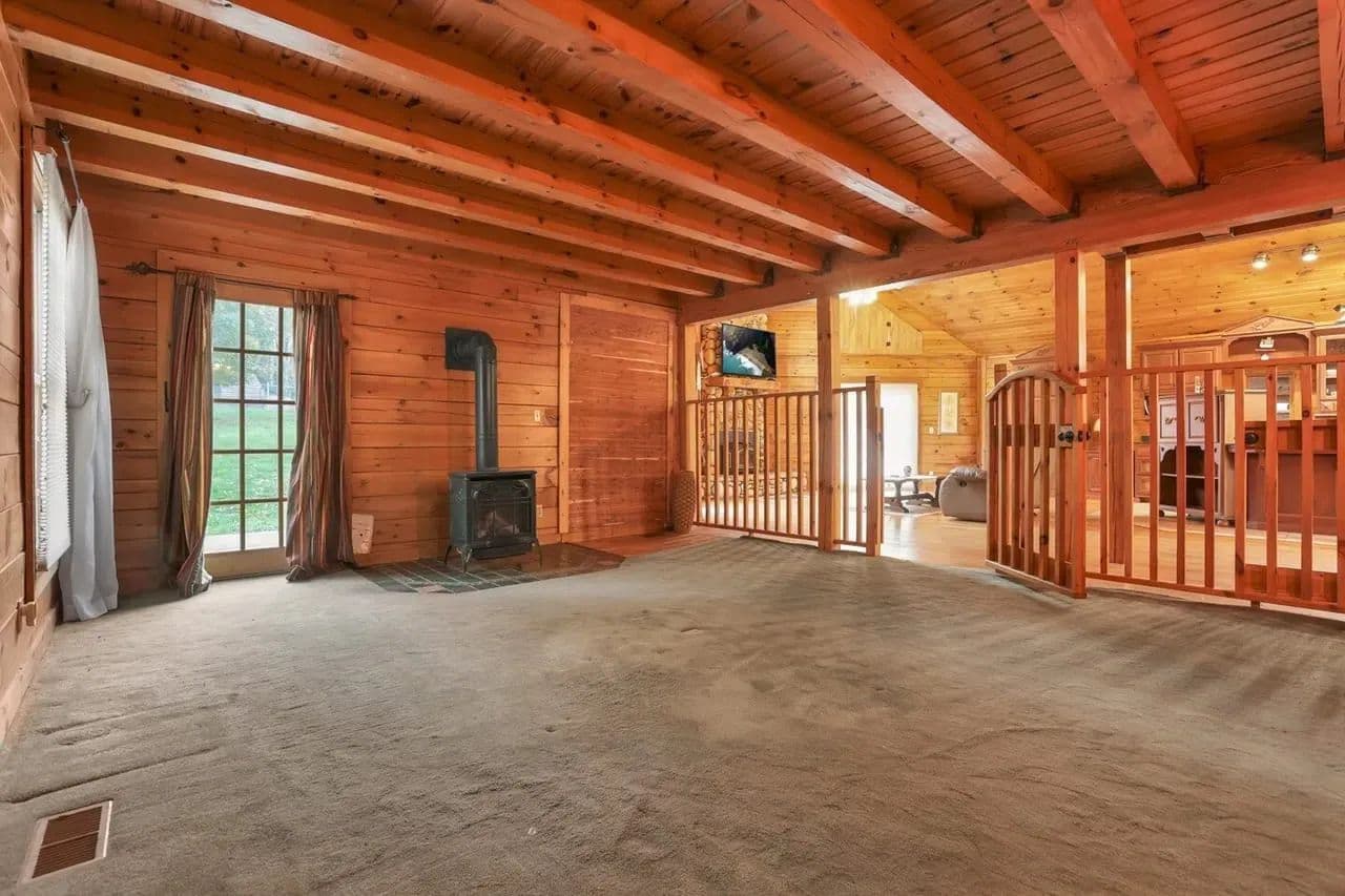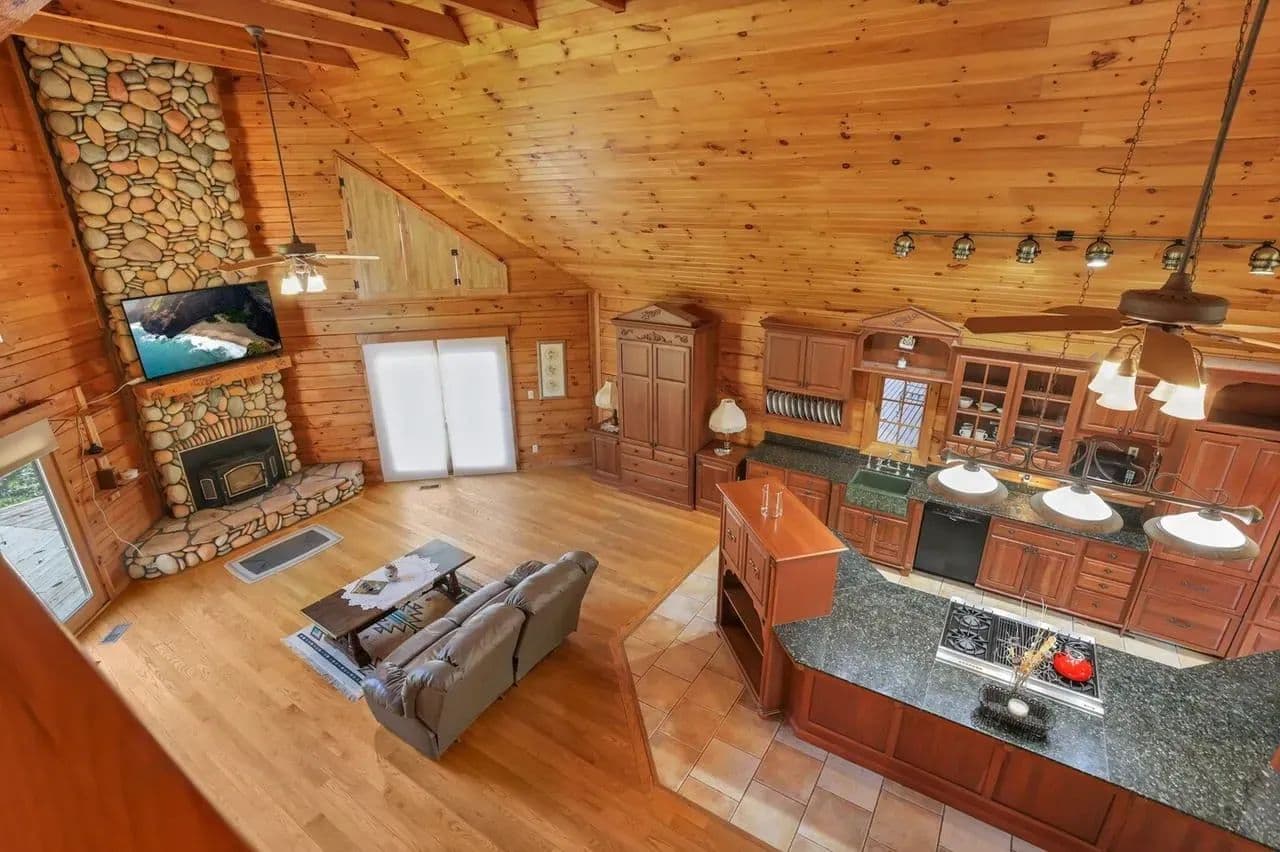 Incredible stone fireplace centered between 2 sliding doors open to a large rear deck