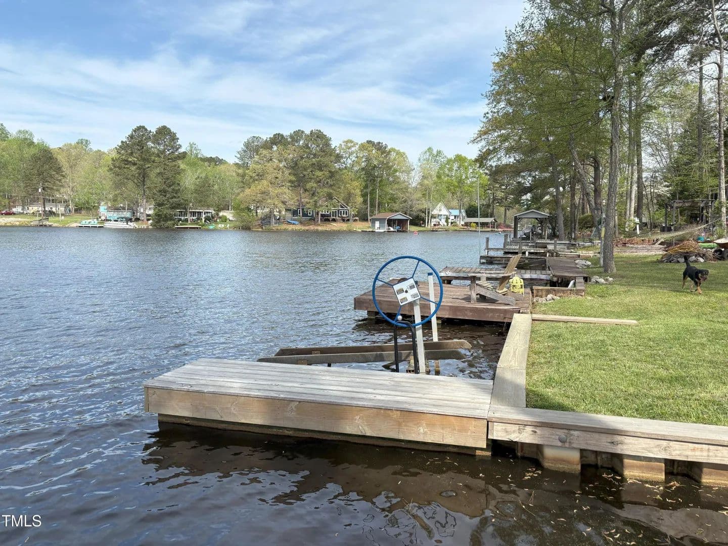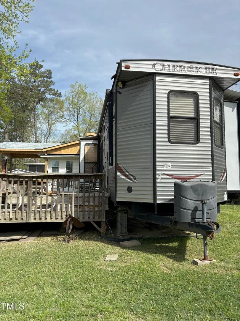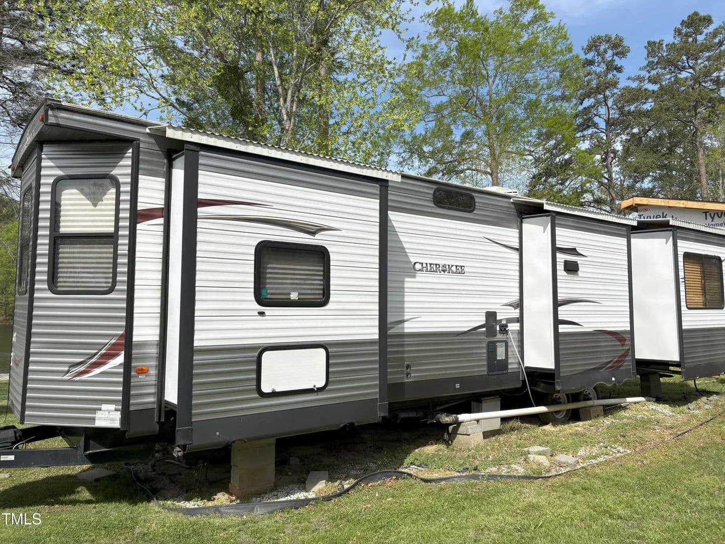 Waterfront Lot with 39' Forest River Camper - Lake Royale. Don't miss this must-see waterfront lot located in the beautiful, gatedcommunity of Lake Royale. The property includes a 2014 Forest River 39-foot destination camper, fully hooked up to water, electricity, and septic for ultimate convenience. Enjoy stunning water views from the large attached deck, perfect for watching evening sunsets. Thelot also features a private dock with a boat slip and a shed for extra storage. Lake Royale offers an abundance of amenities, including: Two beaches, Clubhouse and pavilionGolf coursePickleball, tennis, basketball, and volleyball courts. Whether you're looking for an activelifestyle or a peaceful retreat by the water, this property offers the best of both worlds. Seller will consider owner financing.