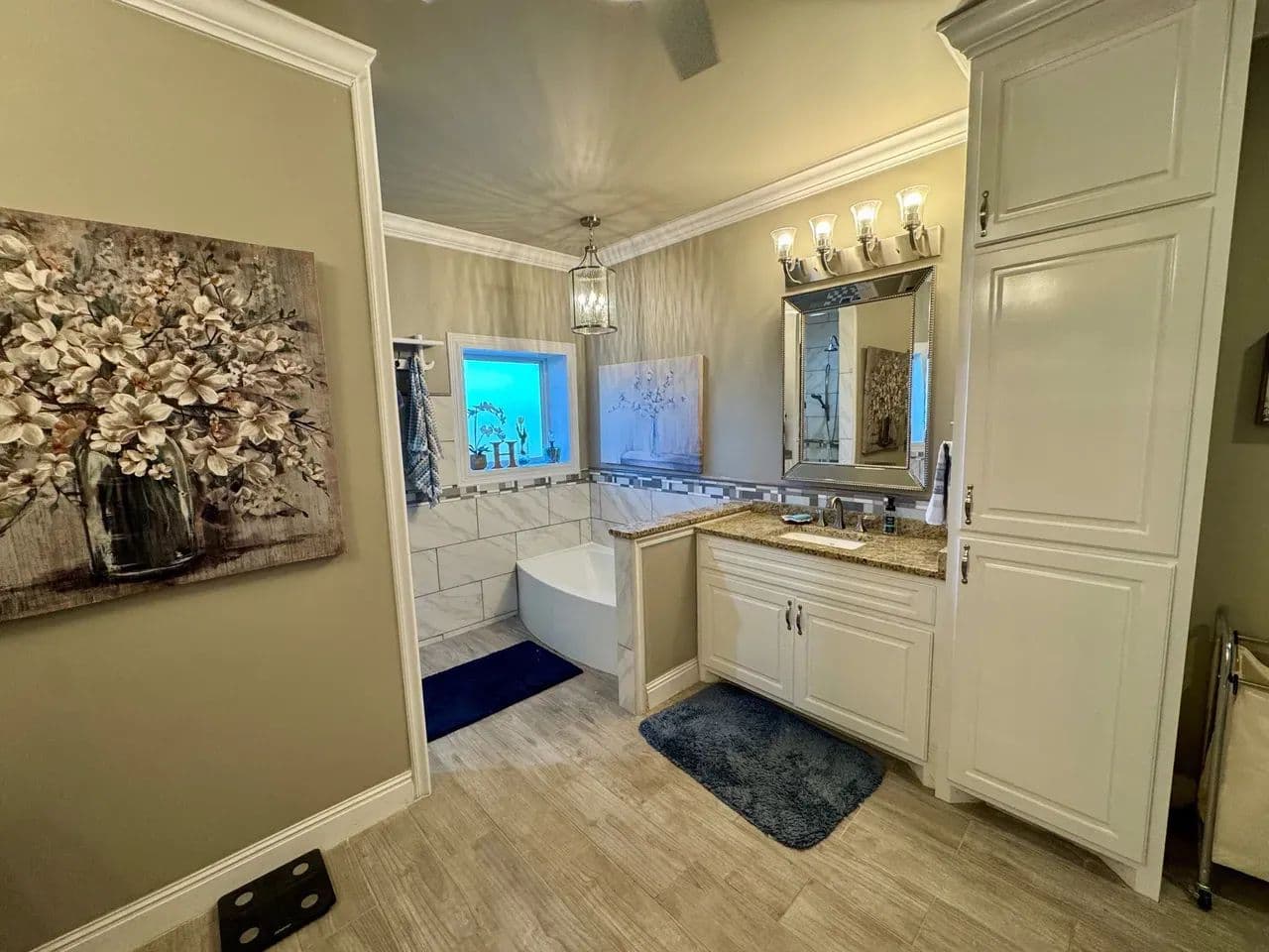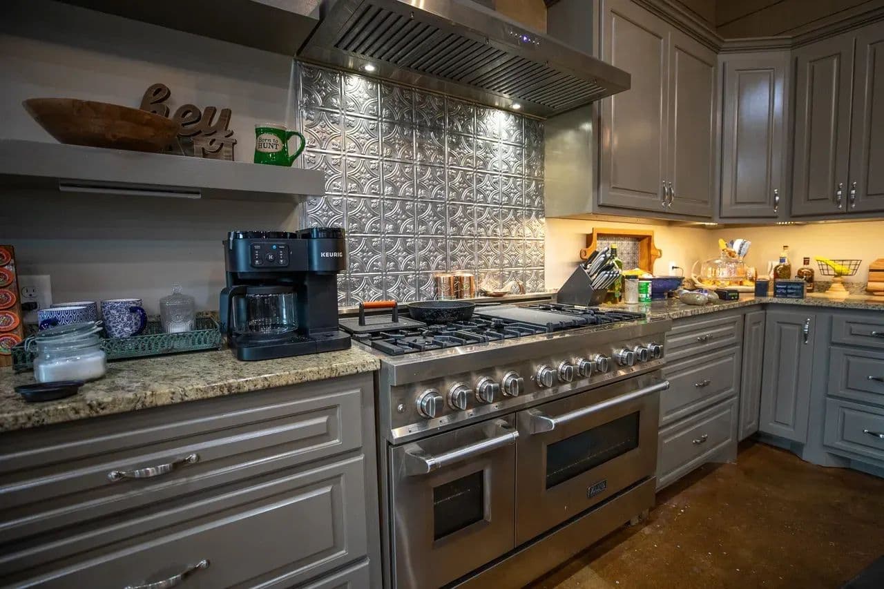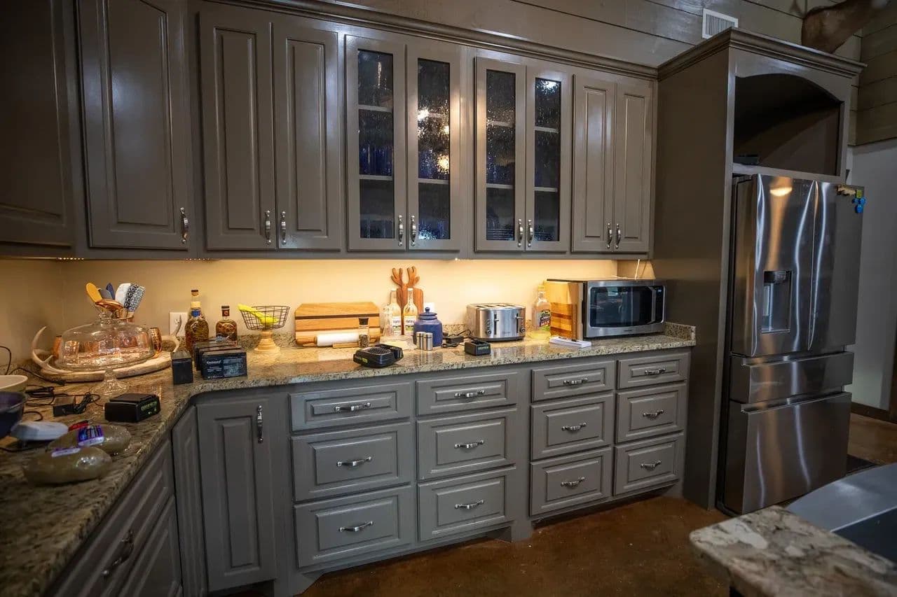 Marble countertops, wood cabinets, and pine trim harvested from the property