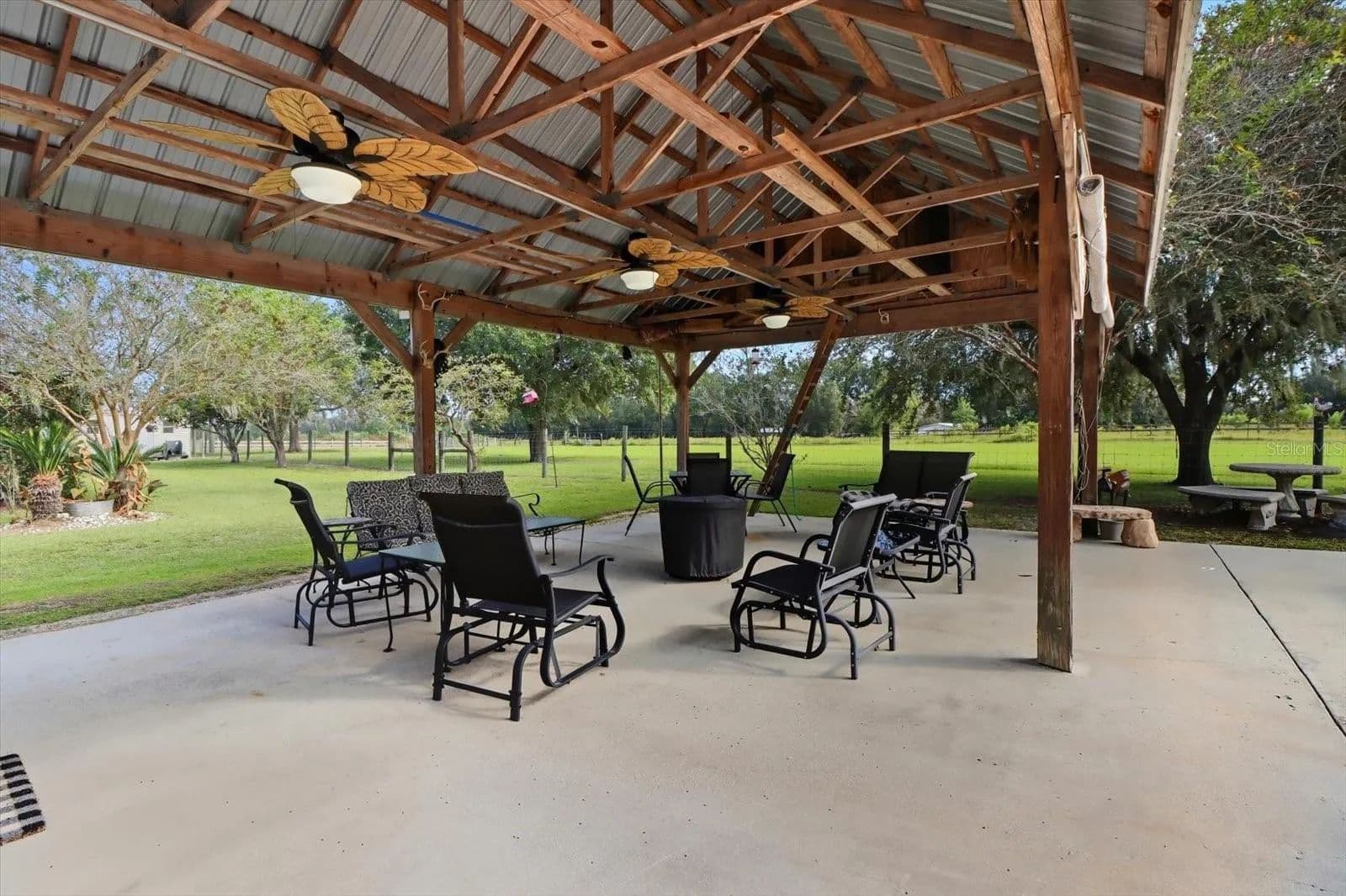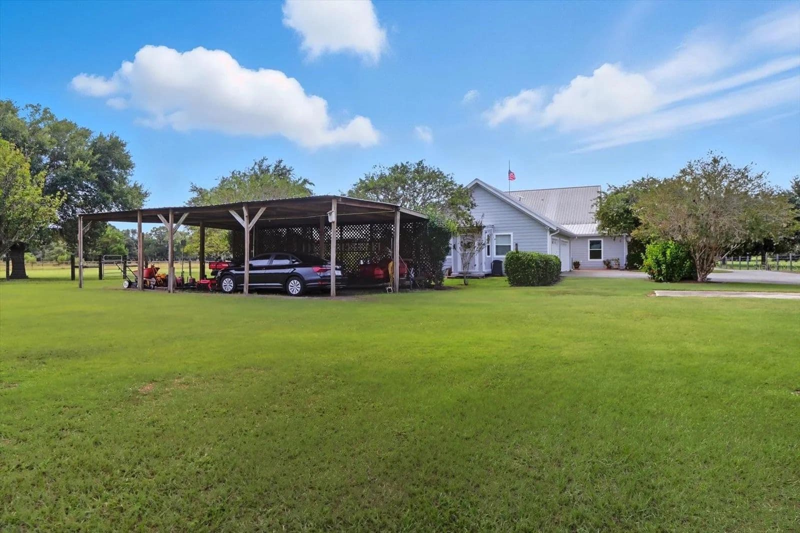 The large primary suite is on the first level and has oversized his and hers walk-in closets along with dual sinks, soaking tub and large walk-in shower. There are additional storage and closet areas at the back of the primary bathroom. There is also a second bedroom and full bathroom on the first level, separate from the half bath under staircase adjacent to the family room. Up the staircase, which divides the private second living area from the open concept family/dining/kitchen area, you will find two additional oversized bedrooms and bathrooms, each with walk in closets. For easy maintenance, the entire house is laminate or tile flooring and has been meticulously maintained. This home was designed for farm life functionality with an excellent balance of storage and living space in this home. The large laundry room accesses the outdoors. The spacious laundry has a sink and folding counter. This laundry room has a large sink and folding counter, and also has two storage closets. As you step out onto the concrete area with large covered pavilion, this is an amazing space for entertaining and family memories. A detached three car garage is also accessed from the laundry room via a short, covered walkway for convenient access.