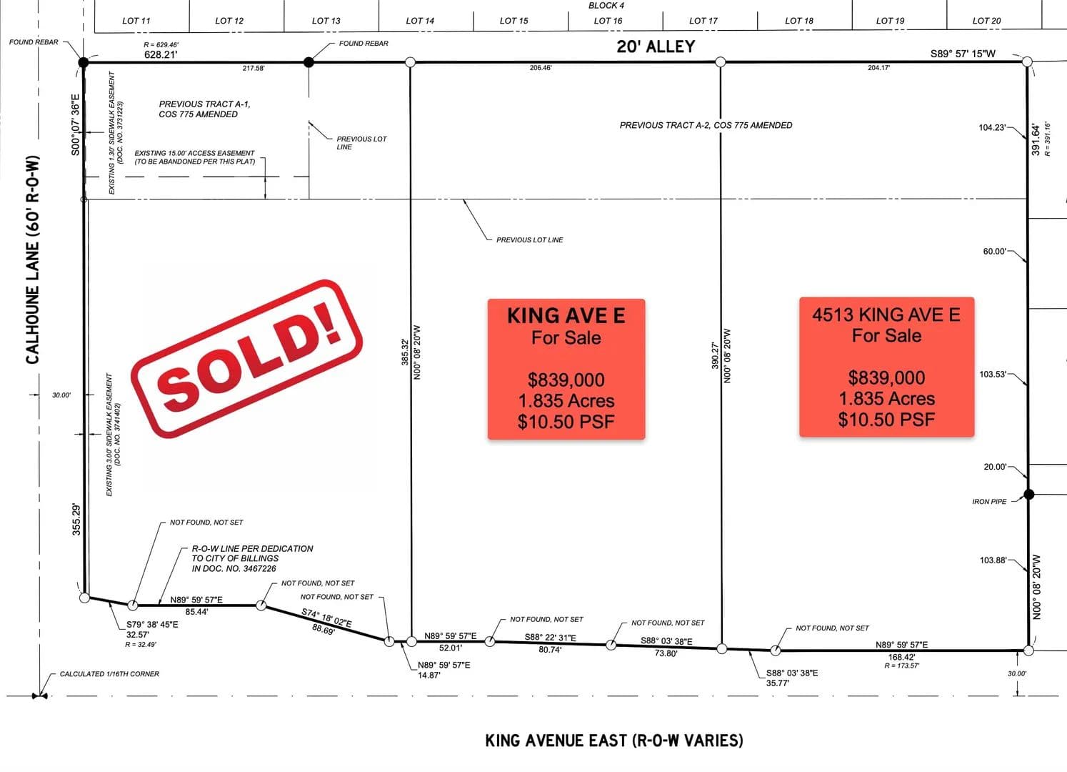4513 King Ave E, Billings, MT 1.83-3.67 Acres of Land for Sale $839,000 to $1,678,000 $10.50 PSF Zoned CMU1 All City Services Available 15,000+ Cars Per Day Traffic Count Lighted Intersection Level Topography Excellent Retail Exposure in the Cabela’s/Sam’s Club Power Retail Center Subdivision Adjacent businesses include Cabela’s, Sam’s Club, Wendy’s, McDonalds, Dominos, Taco Bell, Taco John’s, Burger King & My Place Hotel NOTE: There is a small 1958 house located on the 4513 King Ave E property.