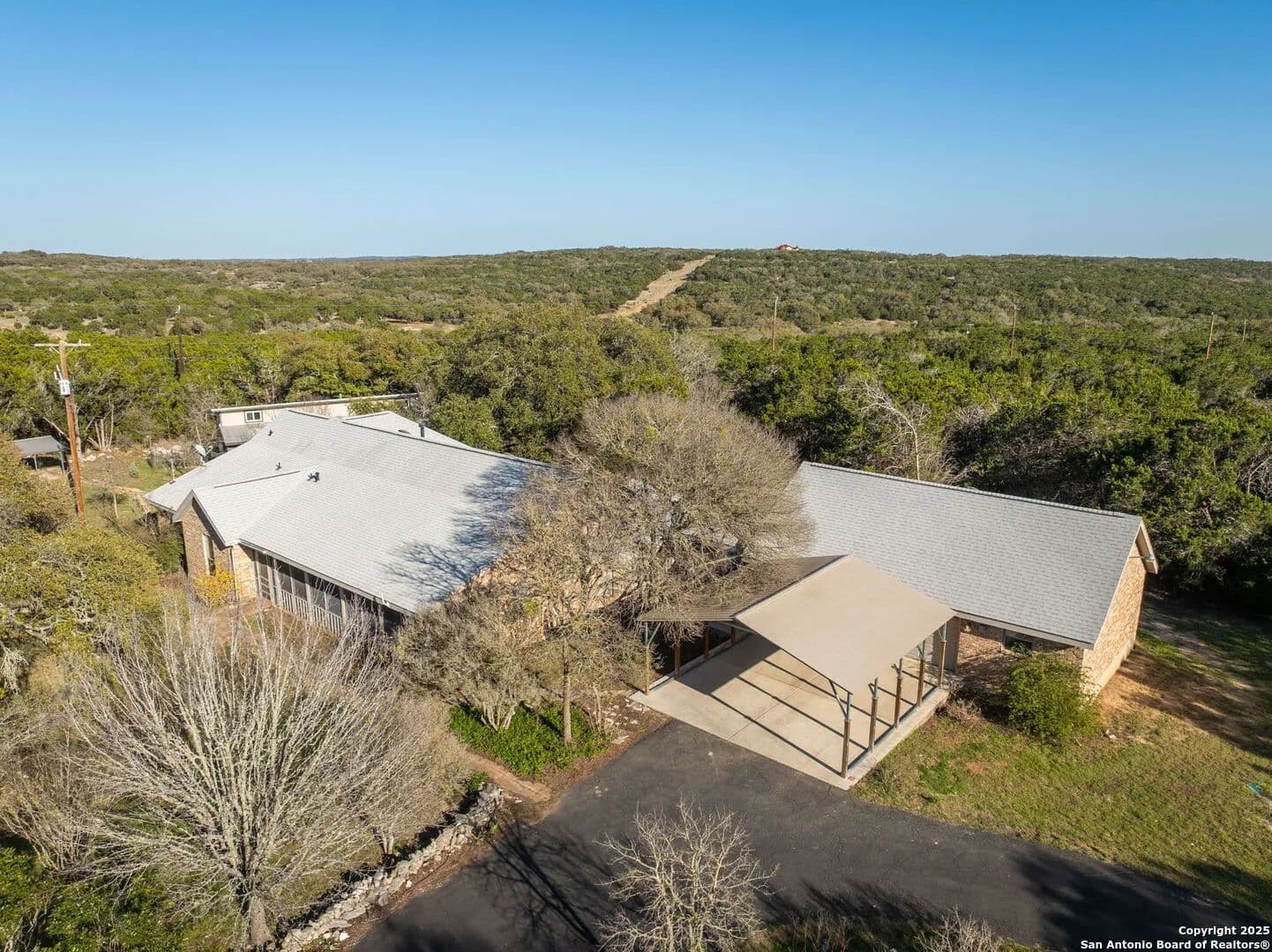 Discover the ultimate Hill Country retreat on over 10 pristine acres nestled between San Antonio and New Braunfels. This exceptional property combines natural beauty, privacy, and functional improvements to create a one-of-a-kind opportunity for country living with modern comforts. Beyond the gated entry, you'll find a gently rolling landscape dotted with mature trees and a paved driveway leading to a charming 3-bedroom, 2-bathroom home. The residence features vaulted, beamed ceilings, abundant natural light, and spacious living areas designed with comfort and entertaining in mind. Multiple screened-in porches and a sunroom off the master suite offer peaceful spaces to enjoy the surrounding serenity year-round. Additional improvements include: A separate 1 bed / 1 bath guest house with full kitchen, laundry, and covered porch-ideal for guests, extended family, or rental income A 20x40 workshop and 3+ car garage/carport Dedicated RV parking Private electric gate and fencing for added security With space to roam, work, and relax, this property is perfect for those seeking a blend of freedom and functionality. Whether you're dreaming of a family compound, homestead, or simply room to breathe, this Hill Country haven delivers. Don't miss your chance to own a slice of Texas paradise!