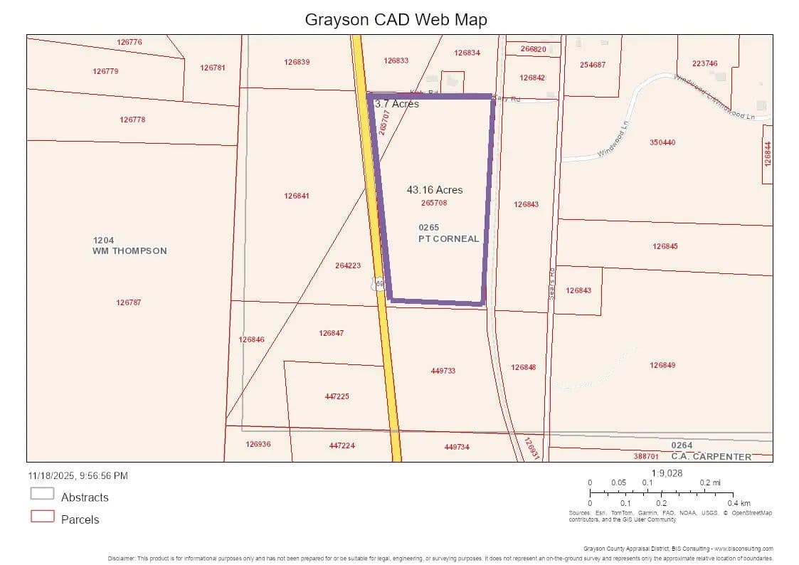 46.86 Acres on the southeast corner of US 69 and Katy Rd. 2 road frontages. Approximately 1,995 linear feet on US 69 highway frontage and 1,167 linear feet of Katy Rd frontage. The parcels just south of this property are in Whitewright. Great piece of land. Currently in Agriculture status. Opportunity to buy and hold for future potential commercial development use. According to the MLS, the property is NOT located in a floodplain. It is in zone X. There are 2 Property ID numbers for this property: 265707 (3.7 Acres) and 265708 (43.16 Acres). Please note property descriptions as follows: G-0265 CORNEAL P T A-G0265, ACRES 43.16 and G-0265 CORNEAL P T A-G0265, ACRES 3.7. All information contained in the MLS is deemed reliable, but not guaranteed. Please perform your due diligence.