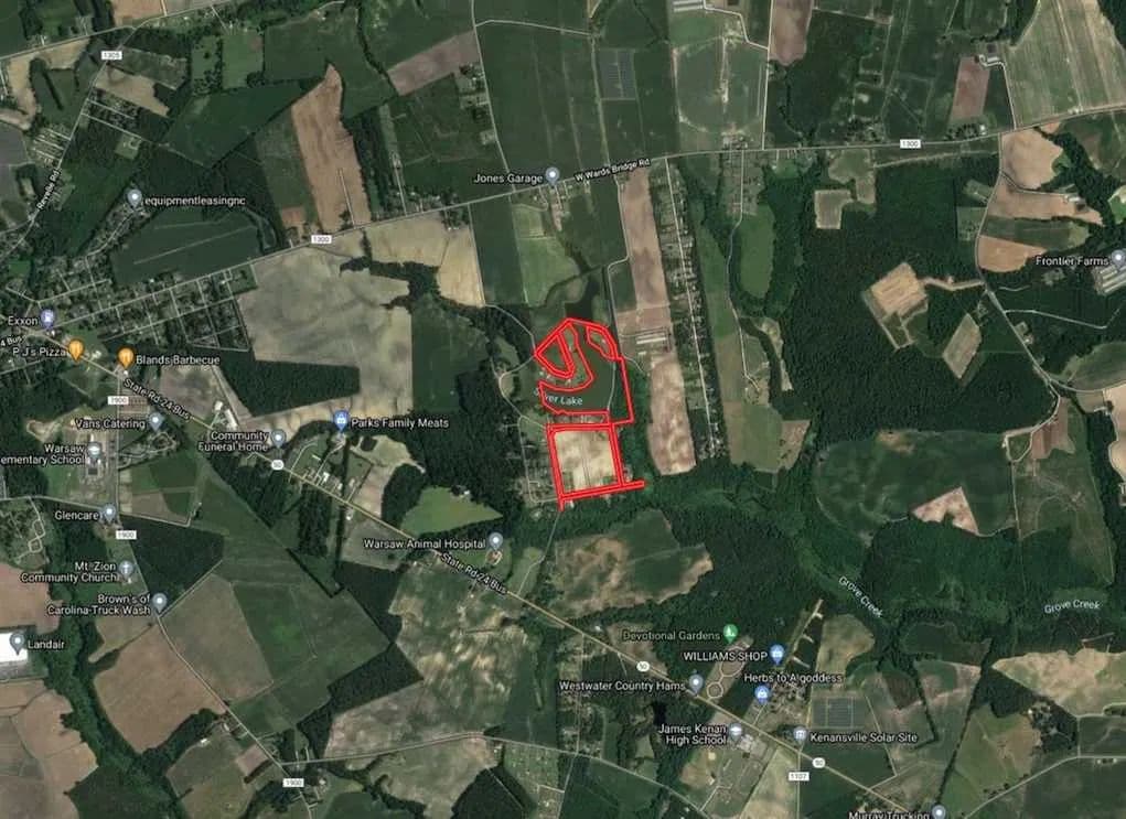 22.23 Acre Lake and Land For Sale in Duplin County, NC! Nestled just outside of Warsaw sits this very unique investment and recreational property. The property totals 22.23 acres, 16 acres of which consist of a freshwater pond by the name of Silver Lake. Also included with the sale of the property are the roads throughout the subdivision (see photo gallery), some of which are state maintained. Others are not. On the eastern edge of the property there is a strip of hardwood timber that also convey with the sale. The remaining acreage consist of buffers around the pond and the roads. There are a number of vacant lots, some of which for sale, that border Silver Lake. There are also a number of homes that are for sale as well.