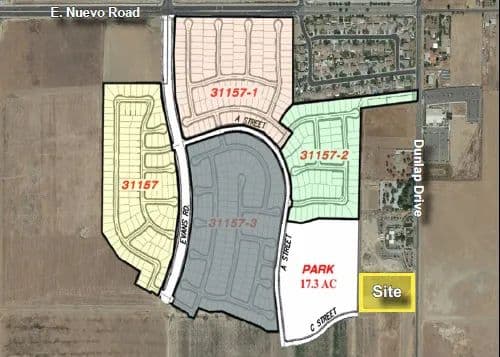 The subject property consists of approximately 5.0 acres of raw land on Dunlap Dr located just south of Nuevo Rd in the City of Perris, one of Riverside County’s fastest growing cities. The property has an expired TTM for 60 Townhouse Units with 370 feet of frontage along Dunlap Dr. The property is approximately 3 miles from I-215 at Nuevo Rd where there is a large commercial presence. Immediately to the west and to the south of the property is a large 534 acre property known as the Park West Specific Plan. This plan calls for 2,027 total residential units for a gross density of 3.8 DU/AC. The first phase of this development has already been sold to Pulte Homes who is actively building homes in the community. See the “Surrounding Development Map” included on the following page for additional insight on the area. The site has access to water along Dunlap Dr with sewer access available at the newly built church to the north on Dunlap Dr per the Eastern Municipal Water District. Additionally, Pulte Homes is currently installing sewer within Parkwest Dr which may also be a connection point for future development.