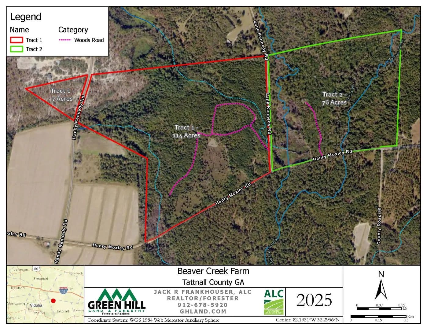 Two intermittent tributaries of Beaver Creek are on the Northern and Western portion of the property, providing seasonal water sources and natural corridors for deer and turkey. Power is available along the paved Handy Kennedy Road. There is county-maintained dirt road frontage along Henry Moxley Road and Lank Kennedy Road offering multiple entry points.