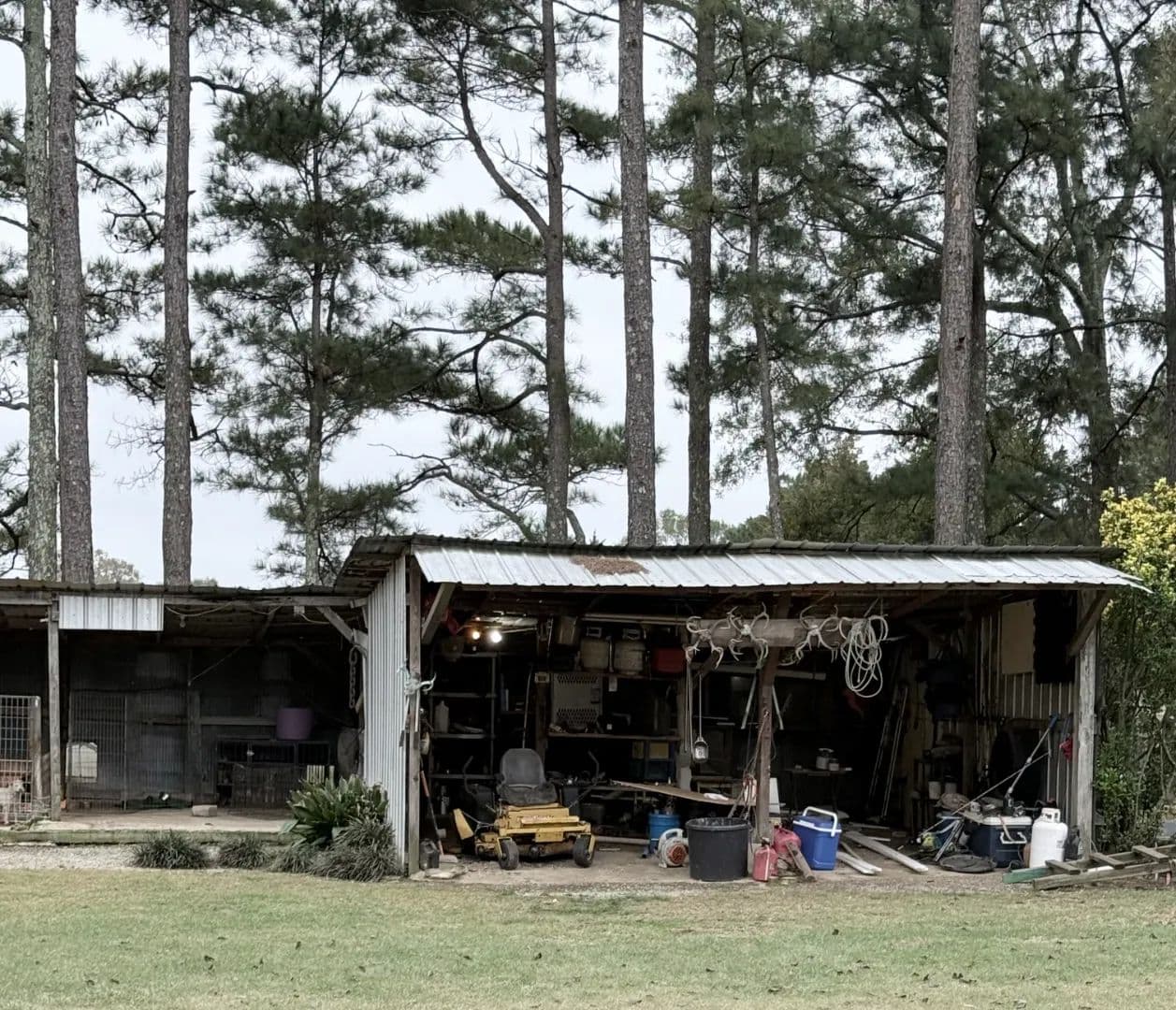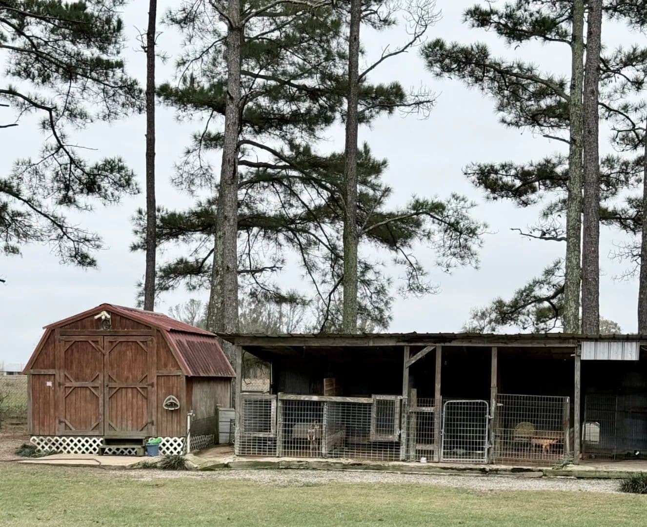 Additional amenities include a detached carport, workshop/shed, a large portable building with electricity and water, dog run/kennels with separate septic system, poultry pens, and a dedicated garden spot. A circular gravel driveway adds to the property's charm and accessibility.