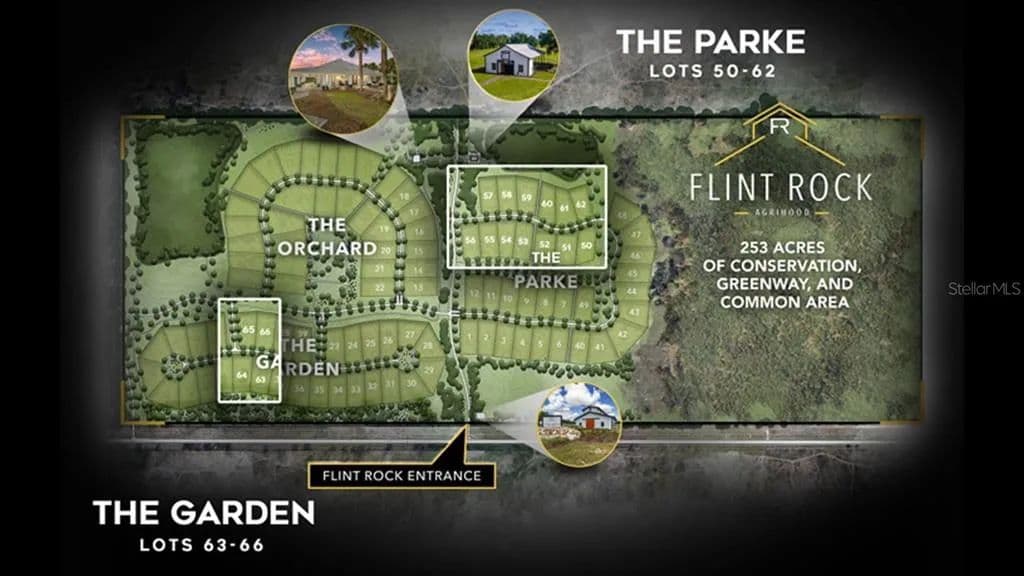 Lot 50 is a 1.07 acre lot that expands approximately 163 feet across its rear property line. With a west facing front yard, its left side yard and rear backyard abuts a designated common area maintained by the HOA. As Gainesville's first Agrihood, Flint Rock promotes a lifestyle of healthy living and wellness, carefully crafted to embrace the farm-to-table lifestyle. This luxury residential community is centered around its recreational spaces, nature trails, gardens, orchards and conservation preserve. With 2.5 miles of walking paths and beautiful expanses of land, residents will enjoy more green space than your average Gainesville subdivision. Aptly named The Parke, this gated subdivision enjoys magnificent private views of the 151 acre conservation easement, while offering direct access to miles of natural walking trails. Owners will have access to their Event Barn, a unique venue for hosting various outdoor activities. The Residents' Farmhouse offers a catering kitchen with spacious indoor gathering areas, surrounded by a fire pit area for casual outdoor entertaining.