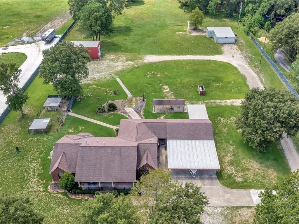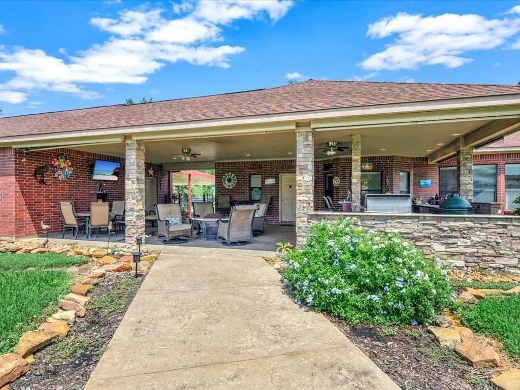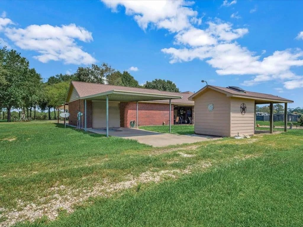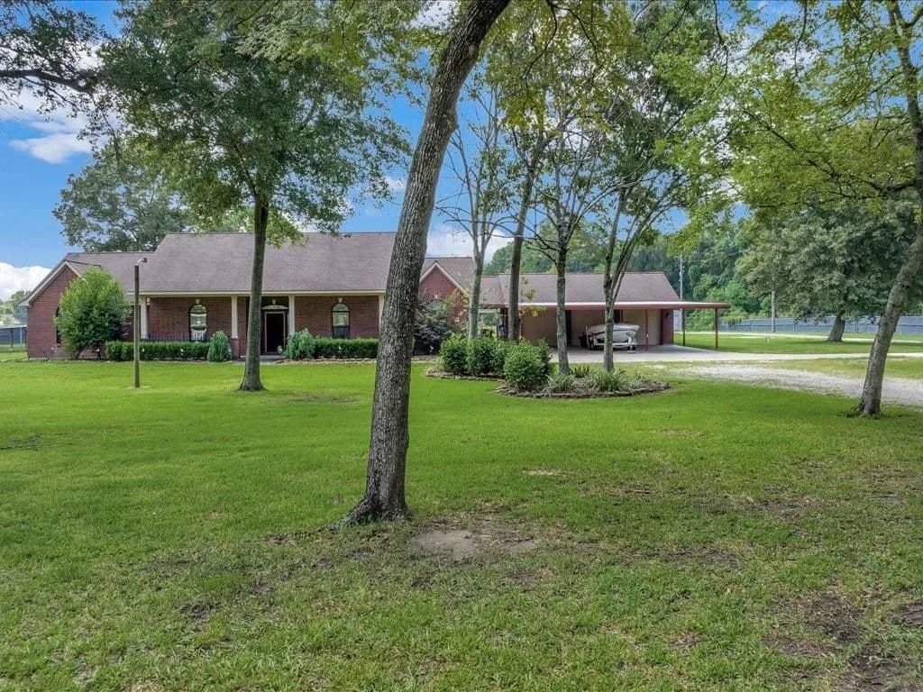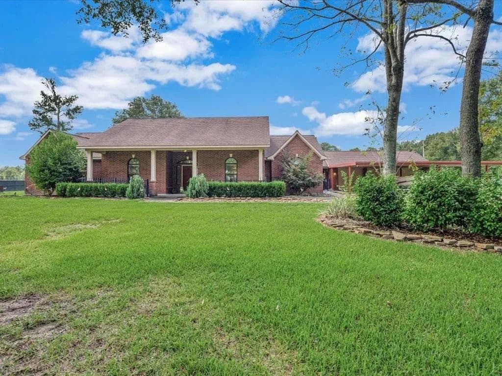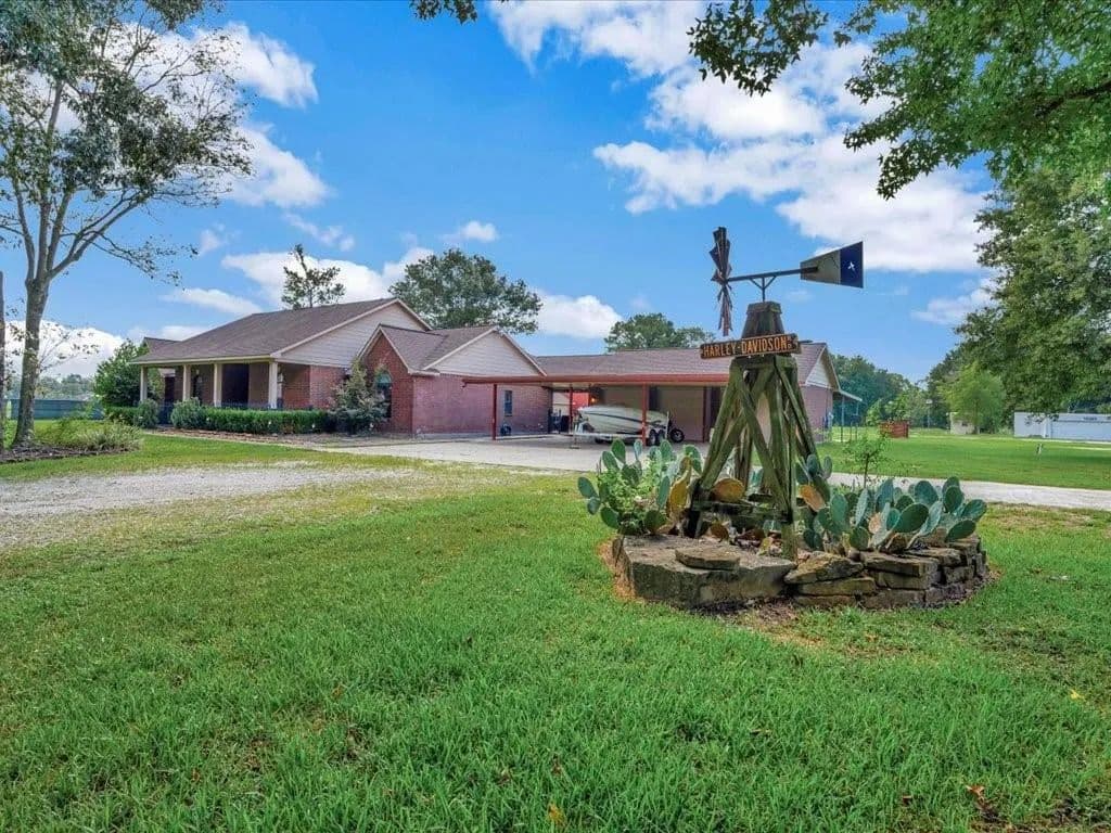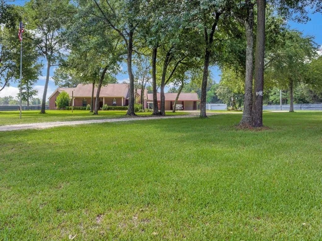 This property truly is a MUST SEE! So many amenities available. 3 Bedroom, plus Study, 3 Bath, all Brick home offering Bamboo & Tile flooring, high ceilings, Granite counters open to the family room, 3 bay windows to view wildlife in your back acreage. All stainless steel appliances and refrigerator stays! Large primary closet with build-ins & jetted tub in Primary bath. 3-car garage, Attached 3-car Carport, Golf Cart bay with attached Carport, TWO Additional Oversized 2 Car Garage/Workshops behind the house and a Climate Controlled RV storage building. HUGE back patio with fully-loaded outdoor kitchen! ALL THIS ON 10 PRIME ACRES, partially wooded. This beautiful land/home package is located in a growing area with easy access to Beltway 8 & US-90! Come check out this One-of-a-Kind property today!