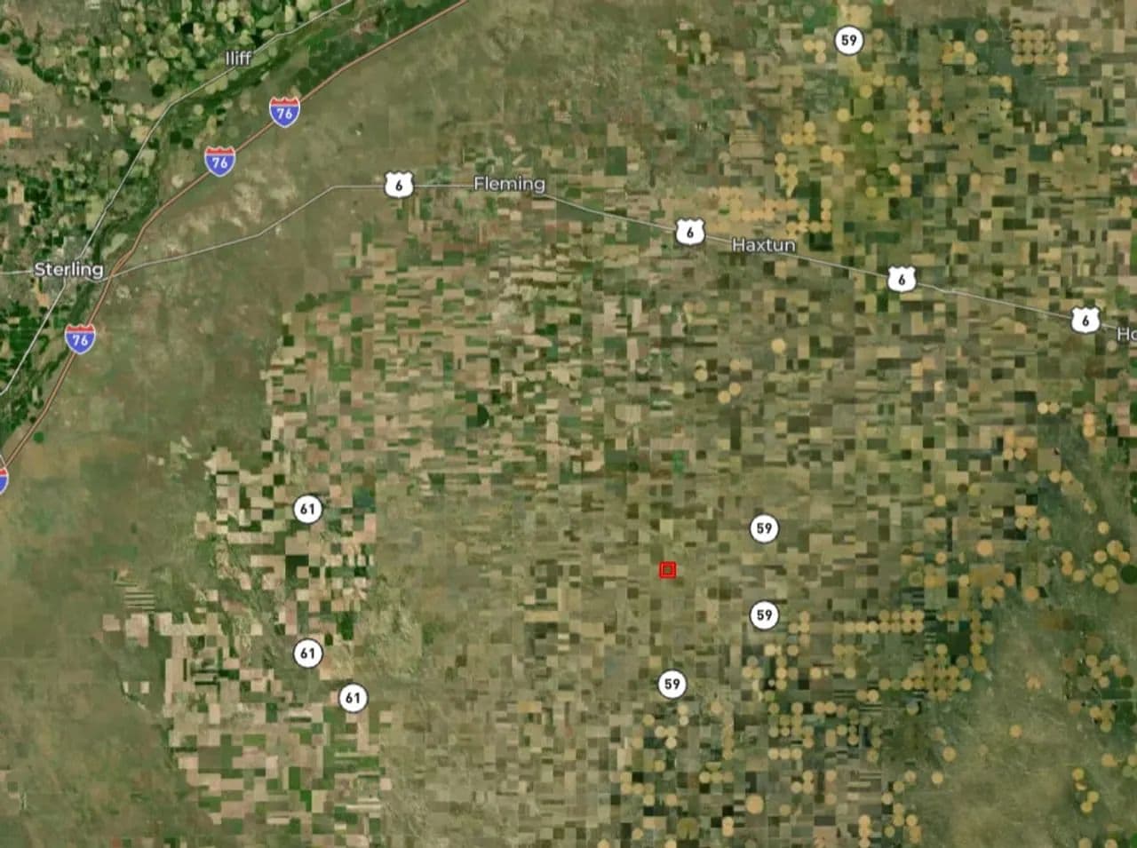 From Haxtun, CO take Highway 59 south for 12.75 miles until you reach County Road 4 then turn right (west) and go 4 miles until you reach County Road 93 then turn left (south) and go 1 mile until you reach the NE corner of the property.