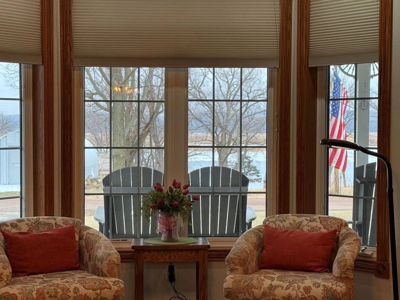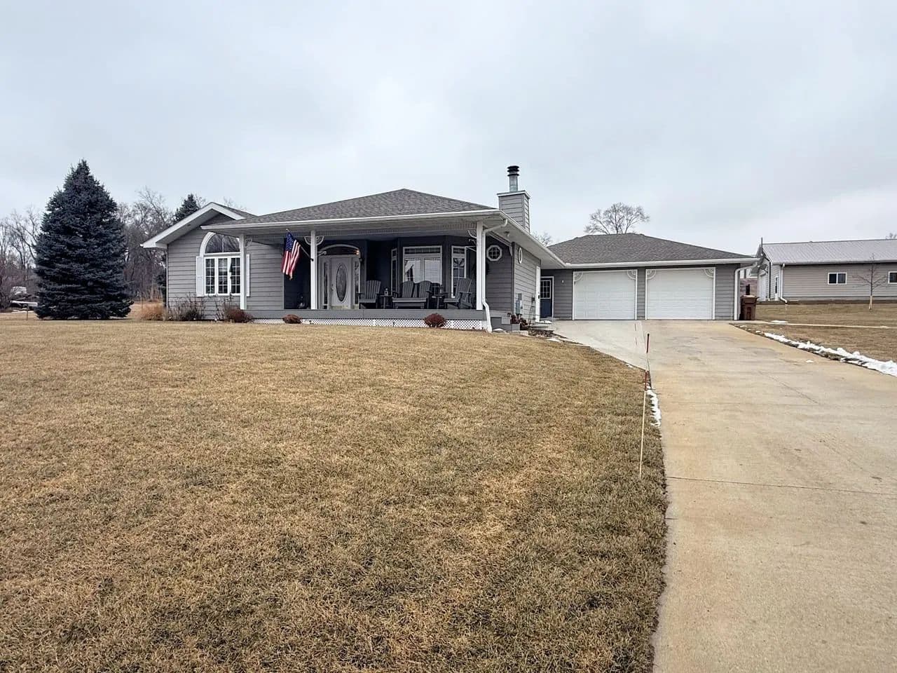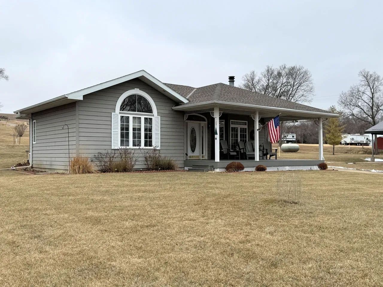 The main floor of the home offers a large master suite with full bath and a great view looking out over the meandering river as it flows beneath the Standing Bear Bridge. You and your guests will enjoy the cozy wood fireplace in the living room, a formal dining area, and a spacious kitchen with hardwood cabinetry and appliances included. The main level also consists of a second half bath, a laundry room, above grade storm shelter, and a bonus office/sitting area. You will be equally impressed by the quality of the hardwood trim, custom millwork, and modern paint and flooring materials that make up the stately interior finishes. The finished basement includes a second bedroom with egress window, and a third non-conforming bedroom space, a 3/4 bathroom, and a large family room for entertaining. Utilities included B-Y water, a septic system, fiber internet, (2) propane furnaces, central a/c, and a gas hwh, and an electric hwh. The lawn sprinkler system and garden have access to a shared well. A new roof was recently installed in 2024. No matter the time of day, you will enjoy relaxing beneath the covered front porch overlooking the river or resting in the shade watching the wildlife from the covered back patio just off the kitchen.