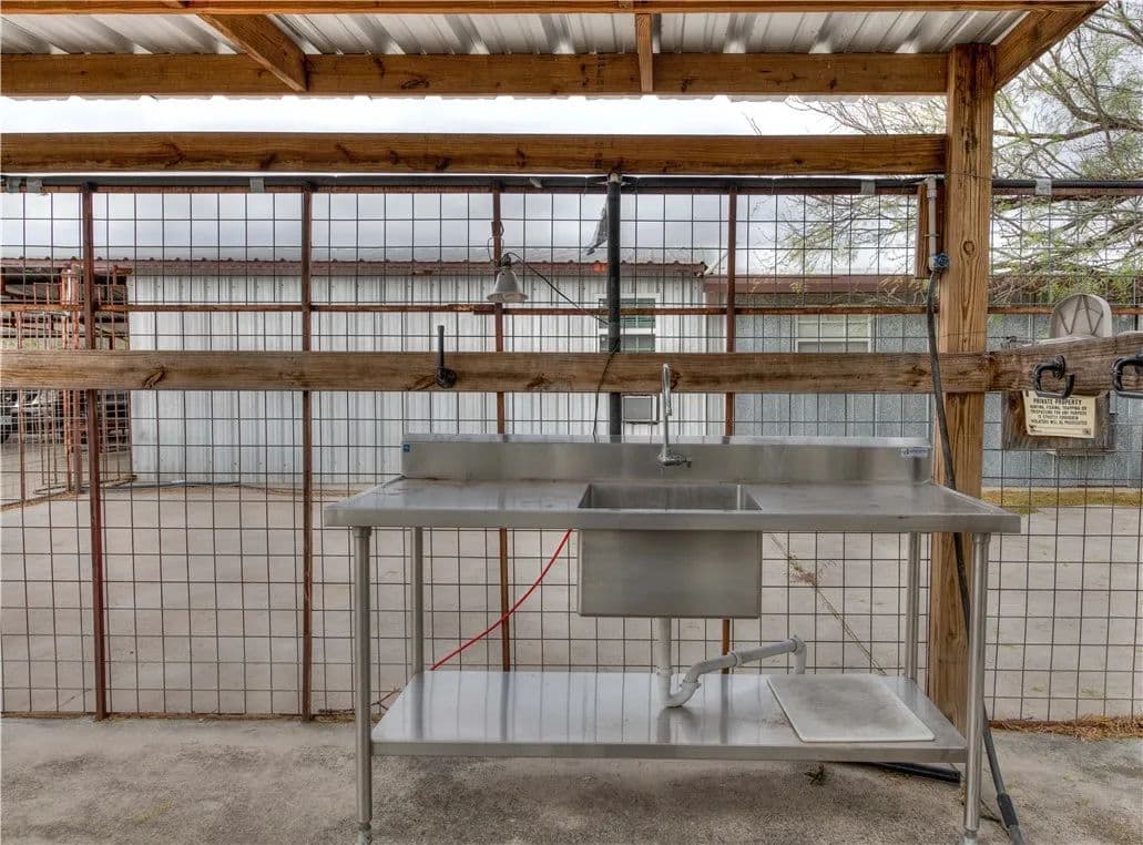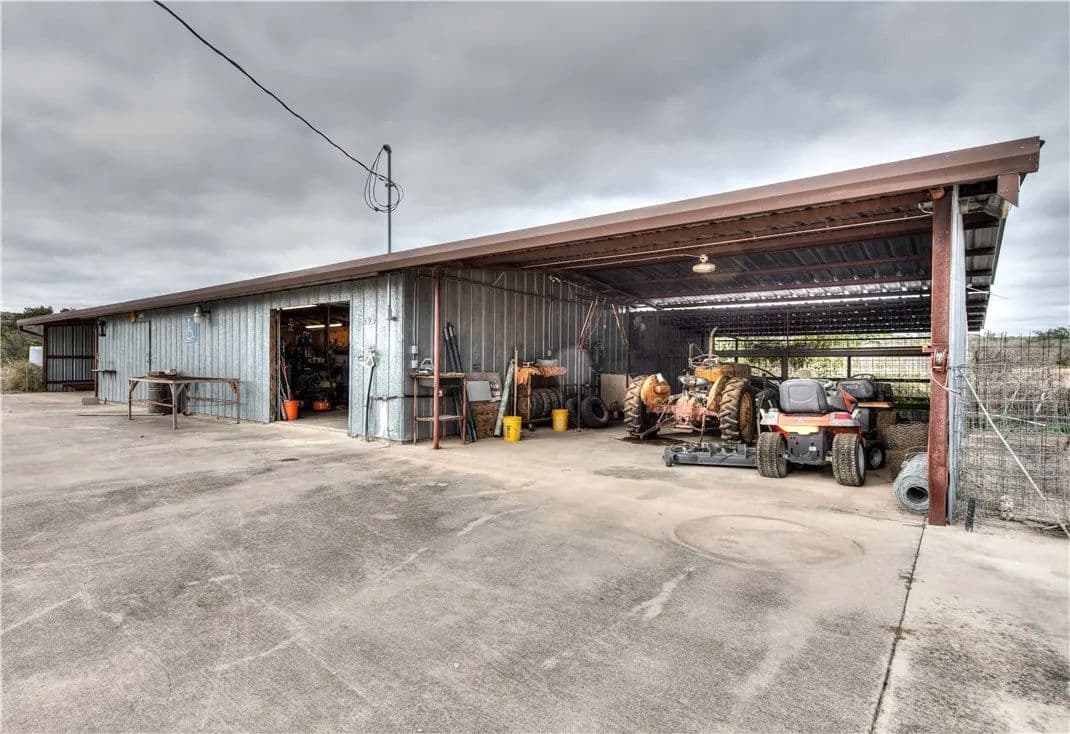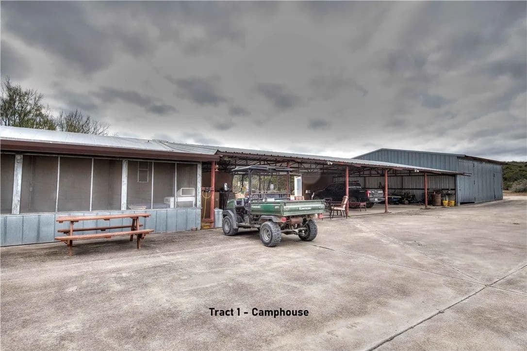 Tract 1 - Includes the main ranch house which is a hybrid manufactured home with wood and metal frame bunk house add-on. The main house area sits on a roughly 40,000 sqft concrete pad and includes 4 bedrooms, 1 bunk room, 3 baths, kitchen and living room. There is over 13,000 sf of covered area including the 3200-sf main house, a large covered outdoor kitchen entertainment area and bar, a 10’x40’ screened front porch, a 2000 sqft dog kennel, game cleaning table and sink, outdoor shower, 1600 sqft enclosed storage room and 4500 sf workshop, equipment shed, land telephone line, satellite TV, water well w/submersible pump, 1500-gallon propane tank. Some bunkhouse furniture will convey.