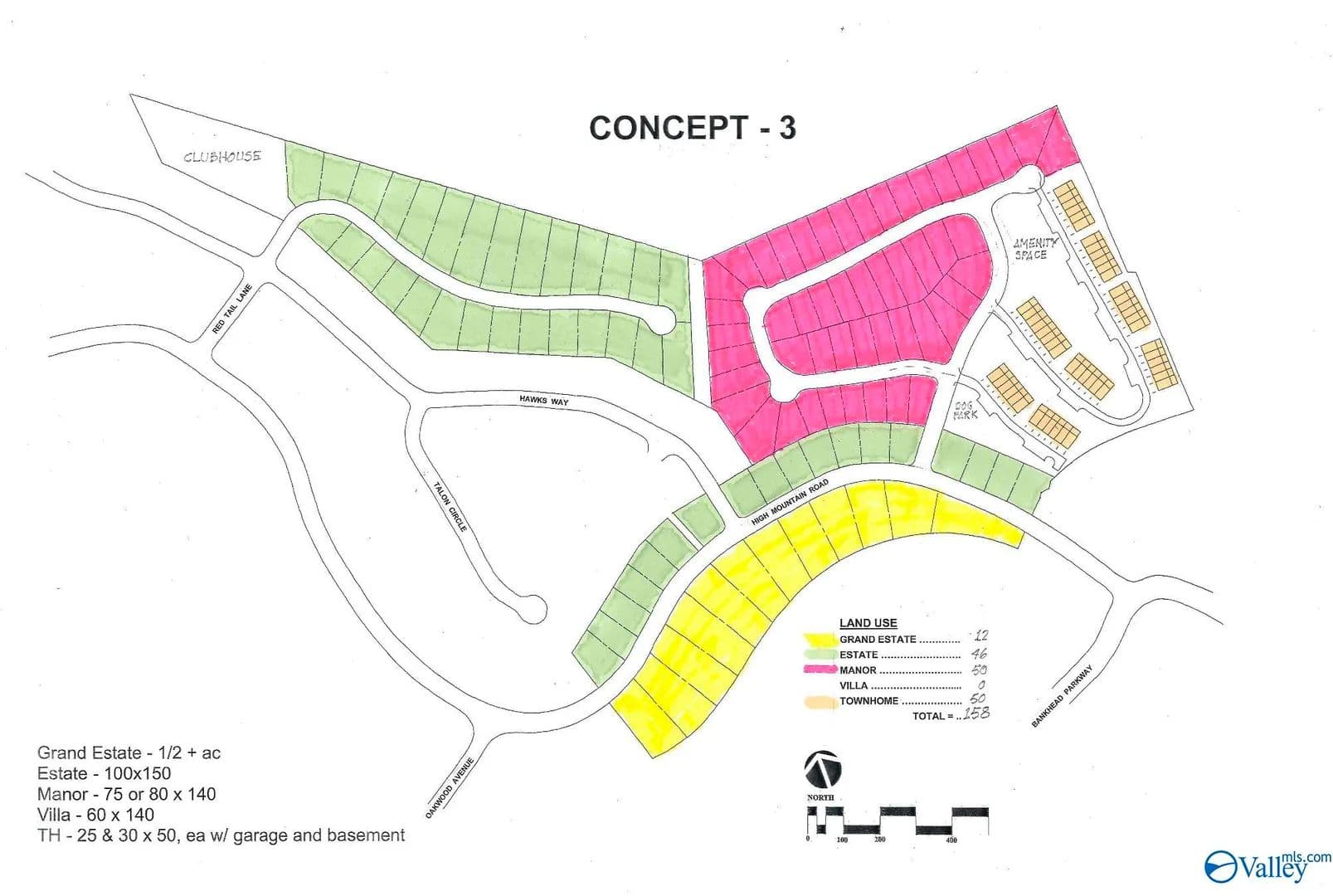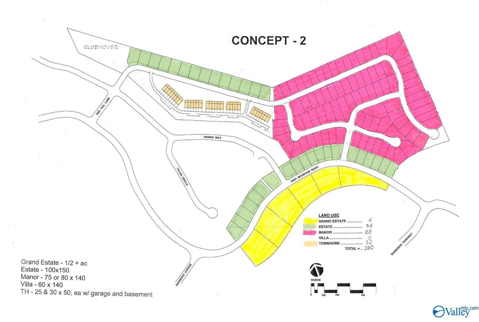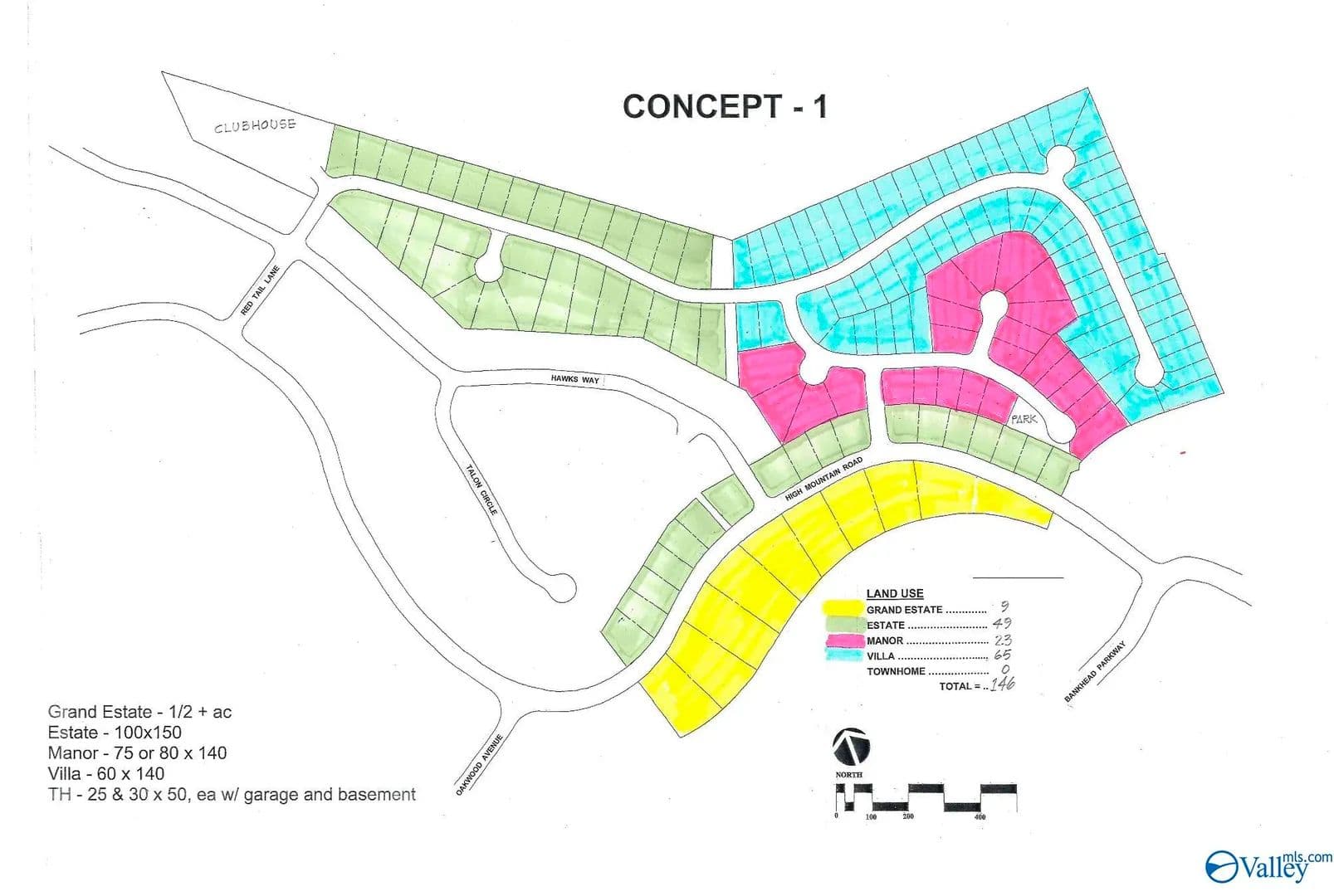 Prime residential development land near booming downtown Huntsville, AL. 64+/- acres off I-565/Hwy72/Chapman Mountain in established Hawks Ridge neighborhood, no existing HOA requirements. 9 parcels, zoned R2A for single-family, townhomes, duplexes, multifamily. Recent design concepts for 246 single-family lots, 359 townhome lots, or combo. 3 access points, utilities in place. City bluff & wooded views. Nearby homes range $500K-$2M+. 4.5 miles to downtown. Research Park, Redstone Arsenal 15 mins. Huntsville's rapid growth offers huge investment potential. Available as 3 tracts - 19, 35.5, and 8.6 acres - or together at a discounted price.