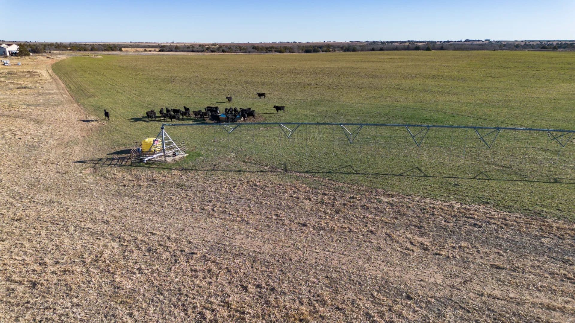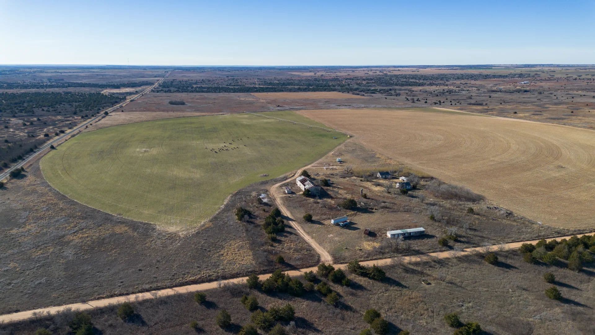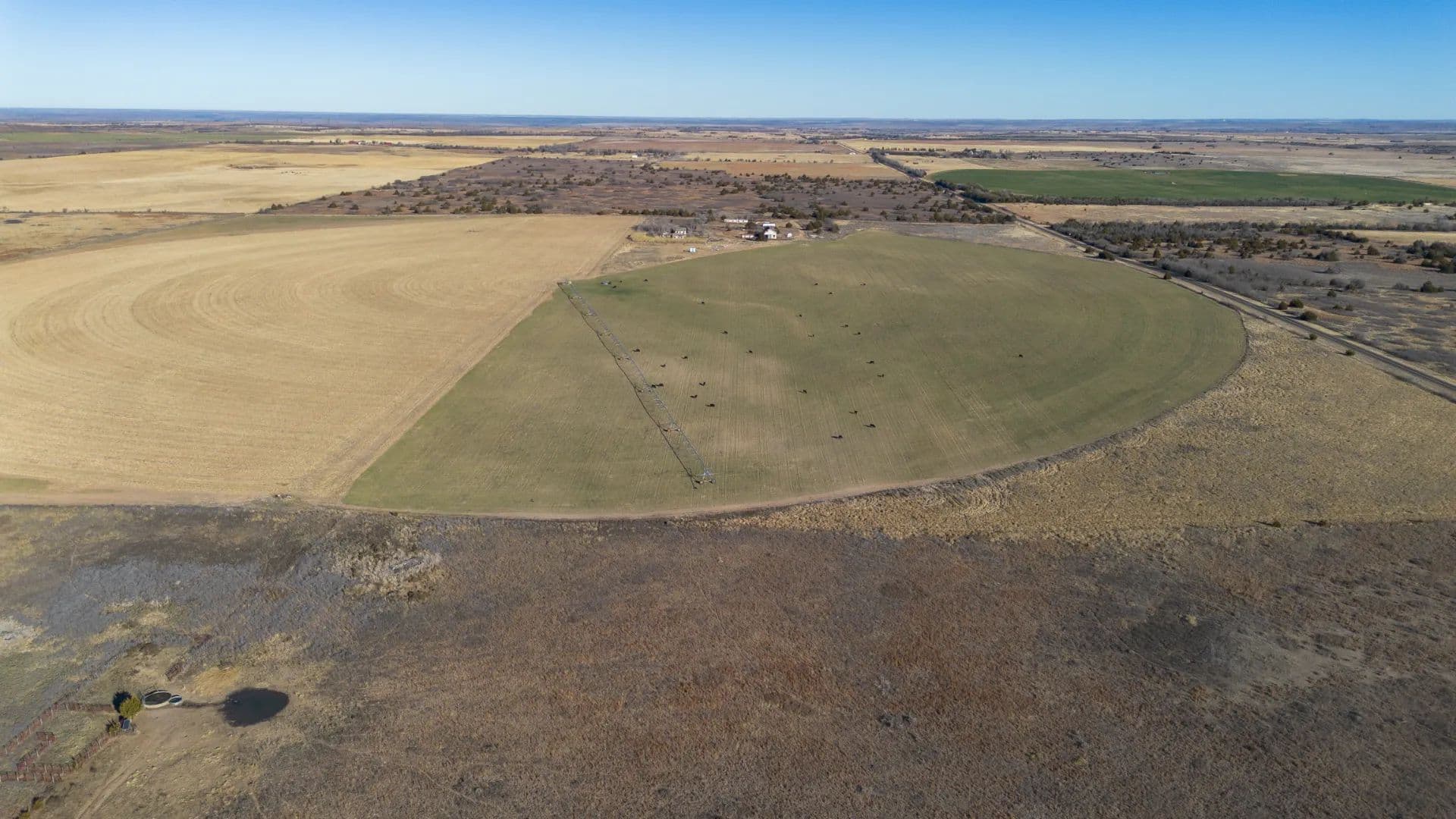 This productive ±151-acre irrigated farm offers a strong mix of cropland, grass, and water resources with excellent access. The tract includes approximately 110 wet acres, 20 acres of dryland, and 20 acres of grass, making it well-suited for both farming and supplemental grazing. Irrigation is supported by three wells, with the west and south wells producing approximately 200 GPM each and the east well producing 100 GPM, all feeding a Zimmatic center pivot nozzled at 500 GPM. A stock tank is located at the center pivot. The ground is currently planted in wheat, with the east corners in grass and west corners in dryland. Perimeter fencing is in decent condition, and access is excellent with ½ mile of paved frontage and ½ mile of county road access on the north side, where the main gate is located. A small 10-acre lease area is excluded from the sale and currently leases for $250 annually. Wheeler County allows approximately 12 inches of water per year, and there are no water lines crossing the road.