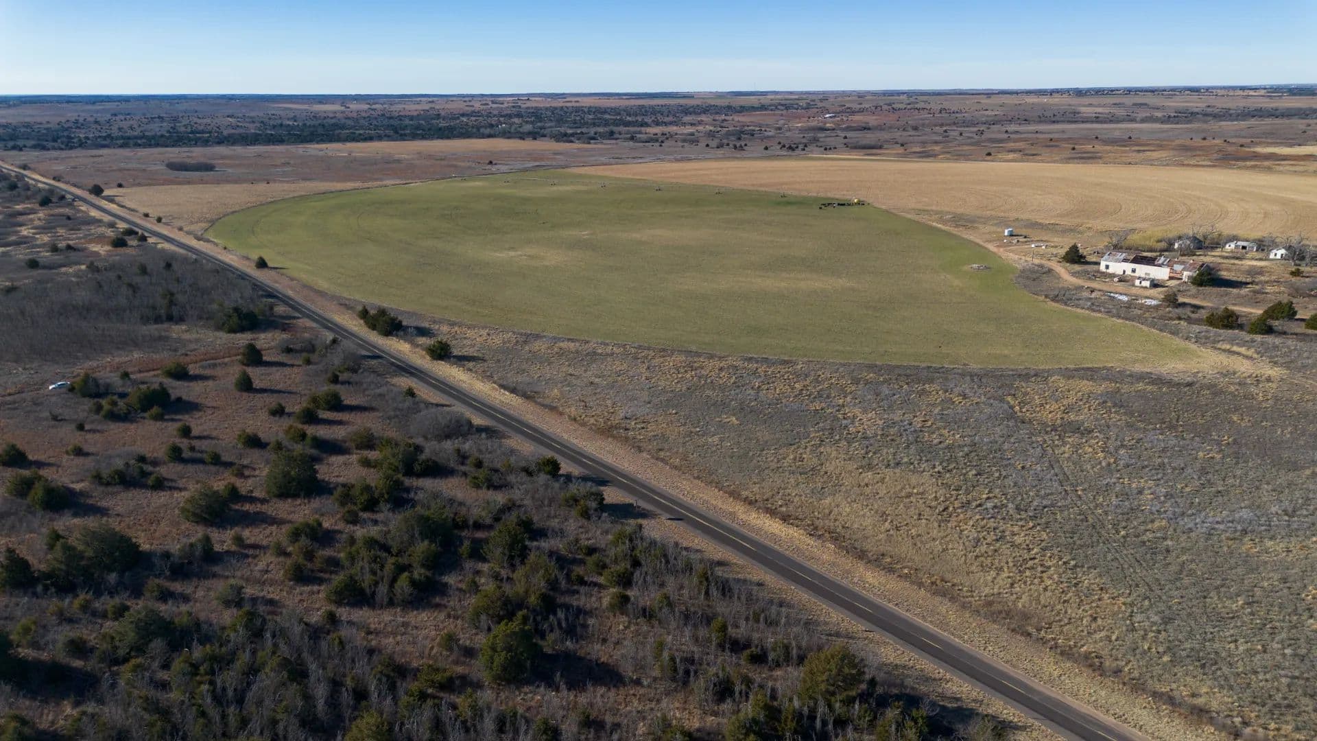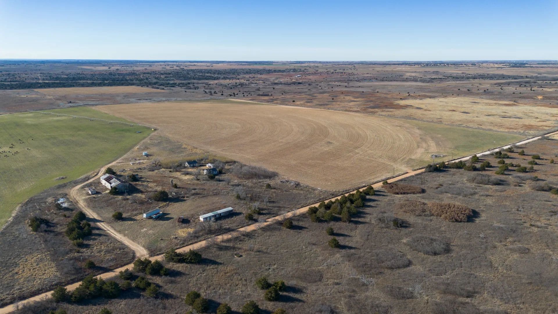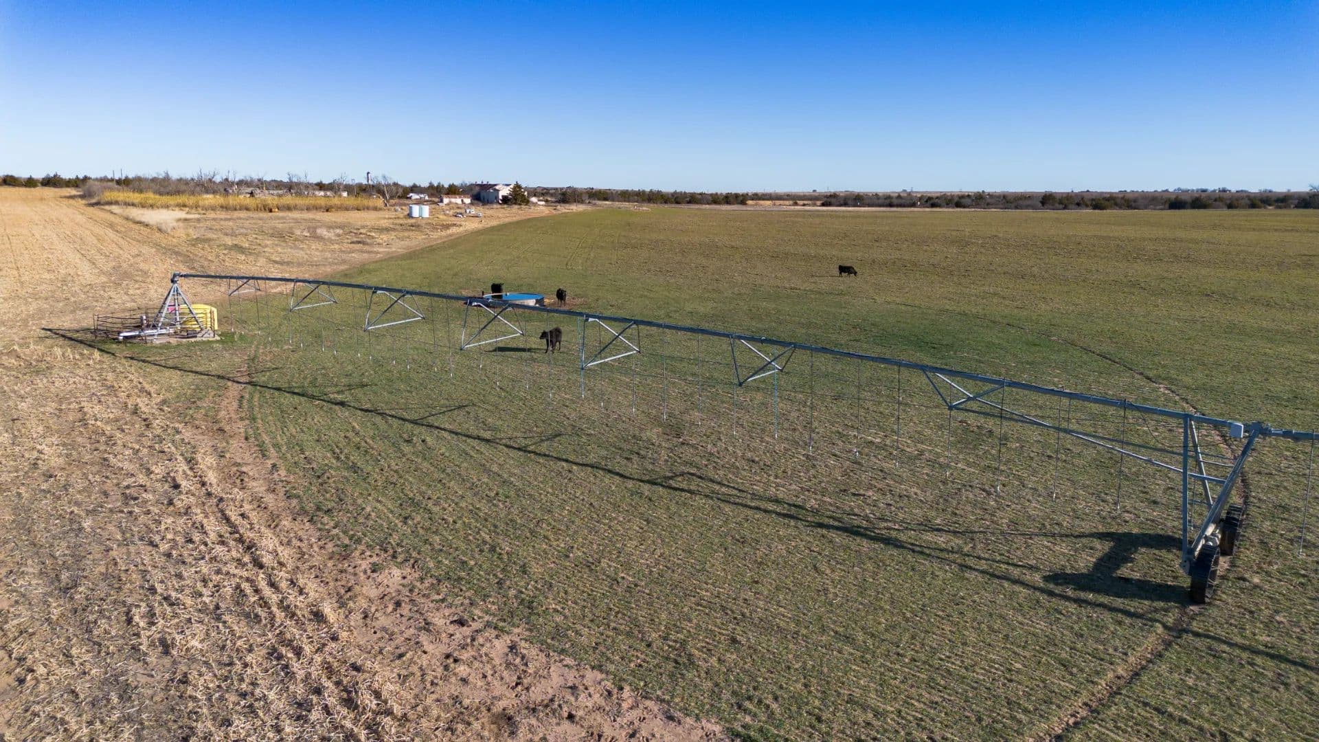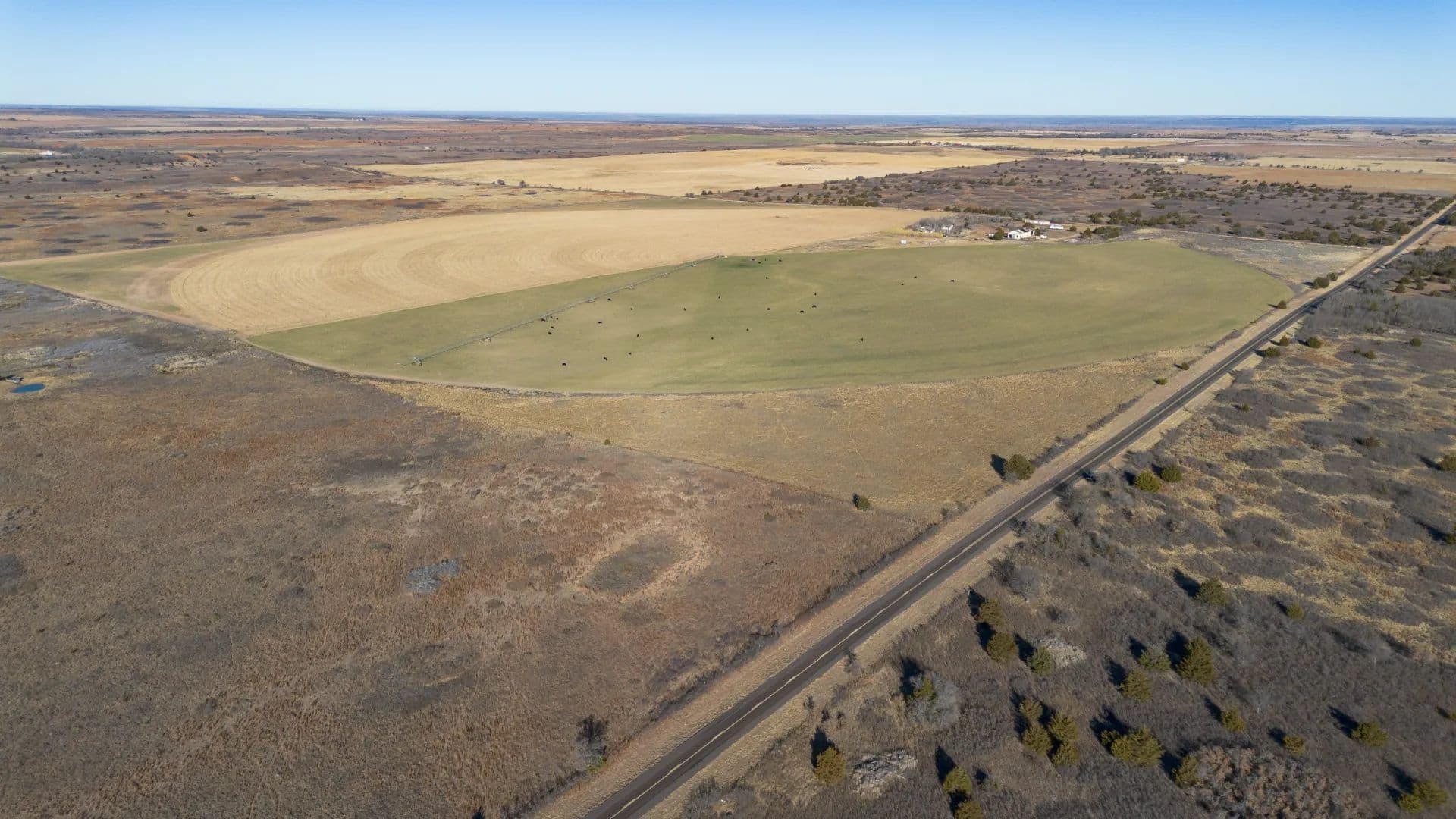 This productive ±151-acre irrigated farm offers a strong mix of cropland, grass, and water resources with excellent access. The tract includes approximately 110 wet acres, 20 acres of dryland, and 20 acres of grass, making it well-suited for both farming and supplemental grazing. Irrigation is supported by three wells, with the west and south wells producing approximately 200 GPM each and the east well producing 100 GPM, all feeding a Zimmatic center pivot nozzled at 500 GPM. A stock tank is located at the center pivot. The ground is currently planted in wheat, with the east corners in grass and west corners in dryland. Perimeter fencing is in decent condition, and access is excellent with ½ mile of paved frontage and ½ mile of county road access on the north side, where the main gate is located. A small 10-acre lease area is excluded from the sale and currently leases for $250 annually. Wheeler County allows approximately 12 inches of water per year, and there are no water lines crossing the road.