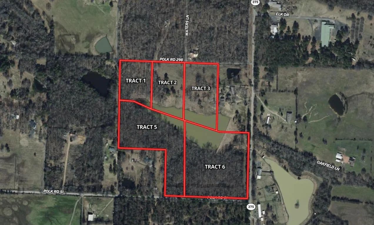 Tract #1 consists of 3± acres and is mostly wooded, offering privacy and a natural setting. This tract joins the stocked lake and provides an ideal location for a cabin or home tucked into the trees while still enjoying lake access. County road frontage, city water, and rural electricity are available. JUST MINUTES FROM MENA, ARKANSAS, THIS PROPERTY CONSISTS OF FIVE ADJOINING TRACTS, ALL SHARING ACCESS TO A 5± ACRE STOCKED LAKE. With water, electricity, and county road frontage, properties such as this are a rare find, especially being so close to town!
