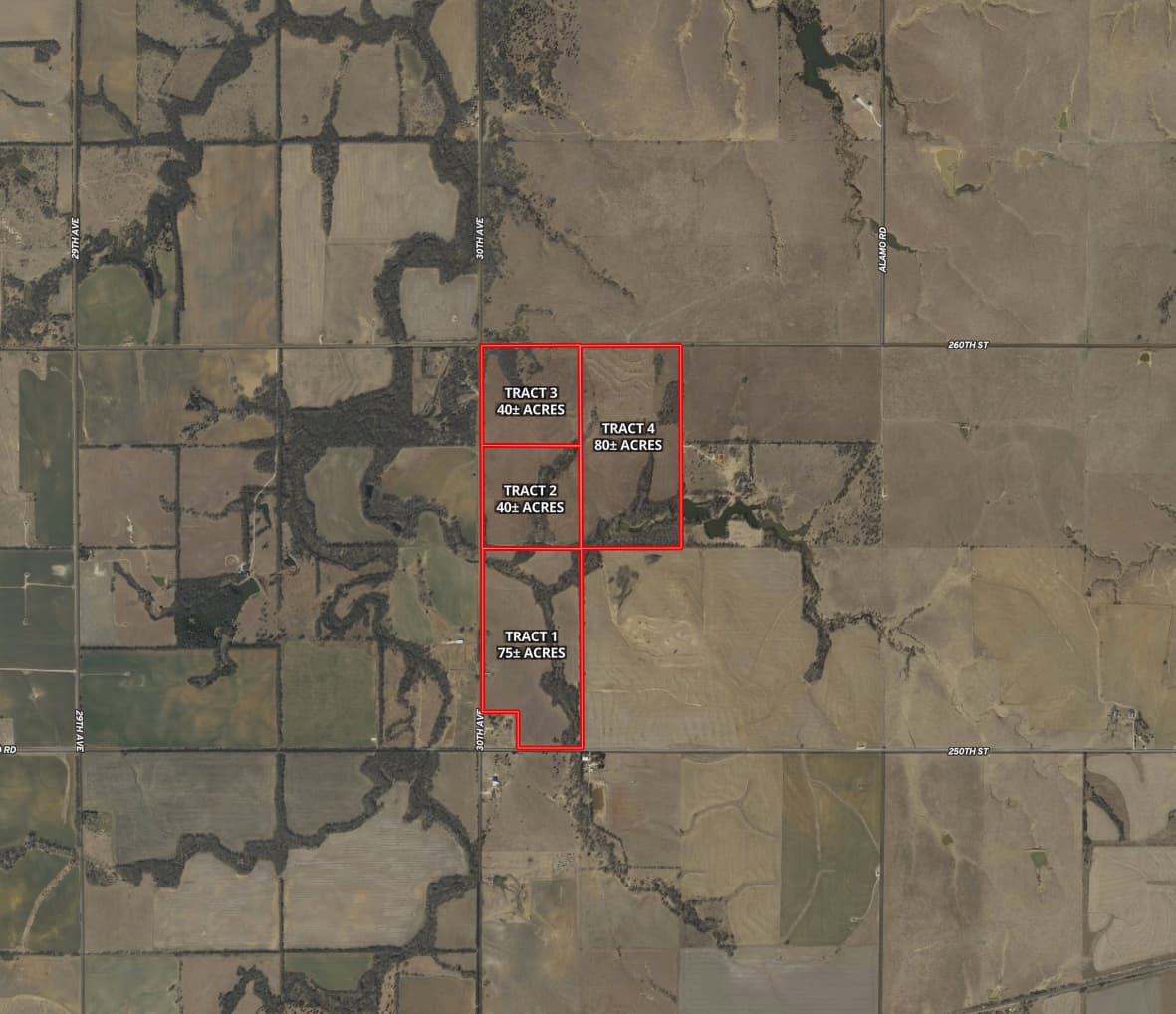 Tract 1: 75± acres with approximately 50 acres in hay production with the balance in wooded draws. Also on this tract is a nice metal building currently rented for storage and a deep well. The deep well has a lease with the neighbor for $50 per month. This lease can be canceled upon the buyer's request. This land can be accessed from both the south via 250th street and from the west via 30th Avenue.