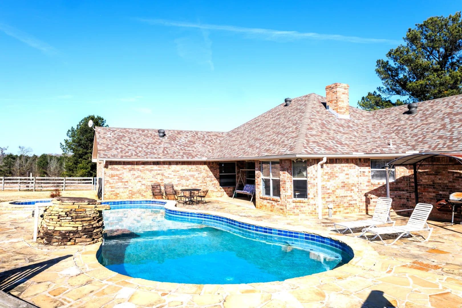 The Douglas Ranch found in East Texas near the City of Lindale, is for sale for the first time. The 53.623 acre ranch features improved pastures, two ponds for livestock and fishing, creek, over 1400 feet of road frontage on two county roads, brick ranch home and a large shop building. The 2042 square foot home has three bedrooms, two full bathrooms, large family room with fireplace insert with blower, country kitchen, breakfast room overlooking the gunite saltwater swimming pool, formal dining room for special gatherings and a private small office. Go out the back door and step onto the covered porch and the stone patio surrounding the in ground gunite saltwater swimming pool with waterfall feature. The pool features continue with custom heated spa for relaxing after a nice swim.