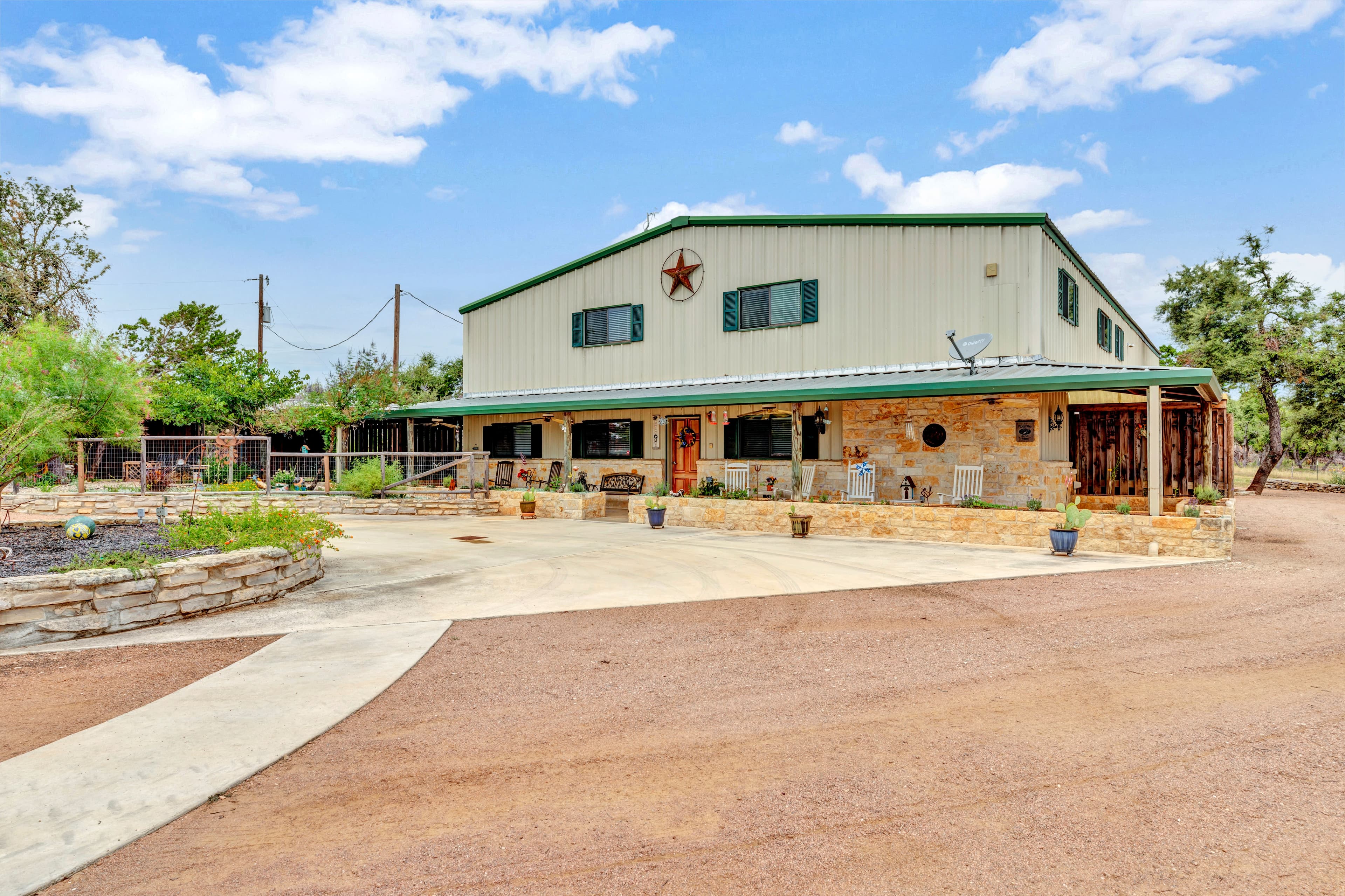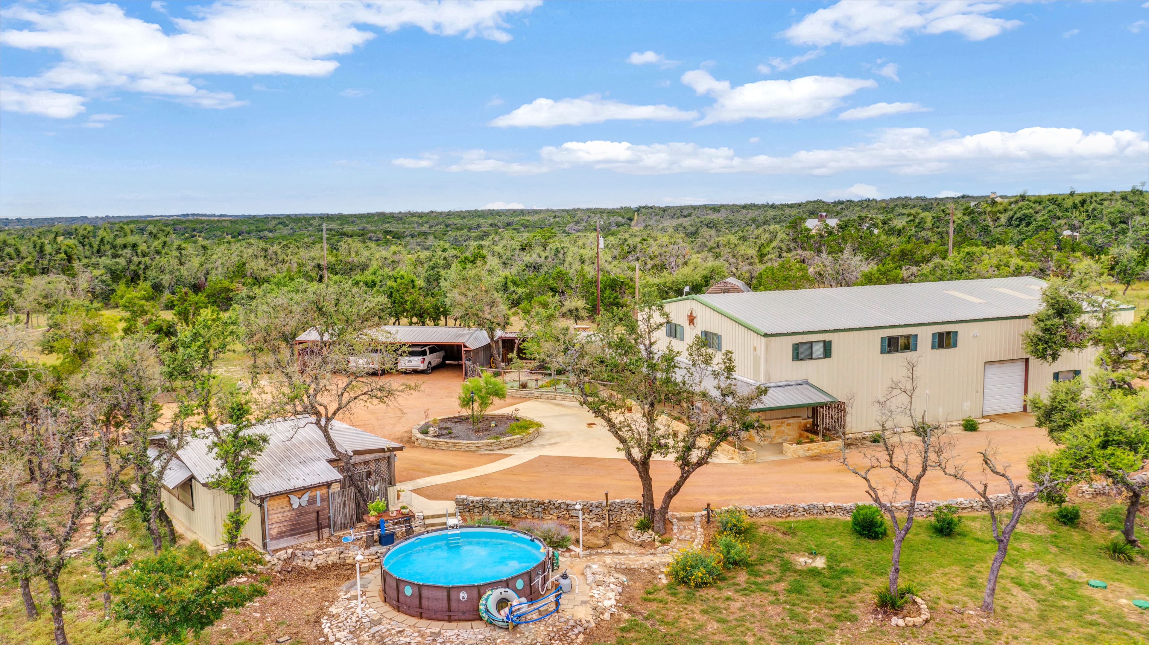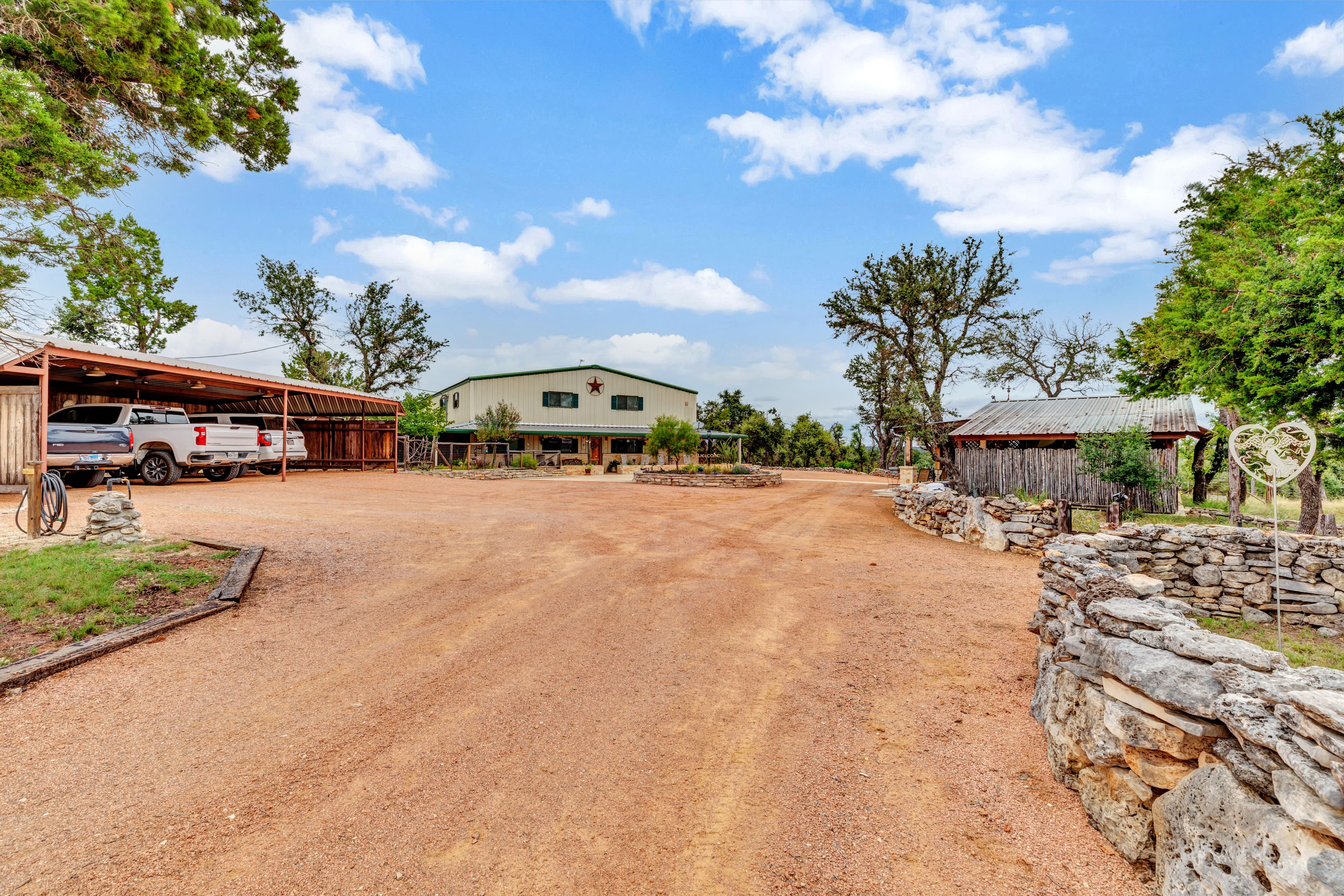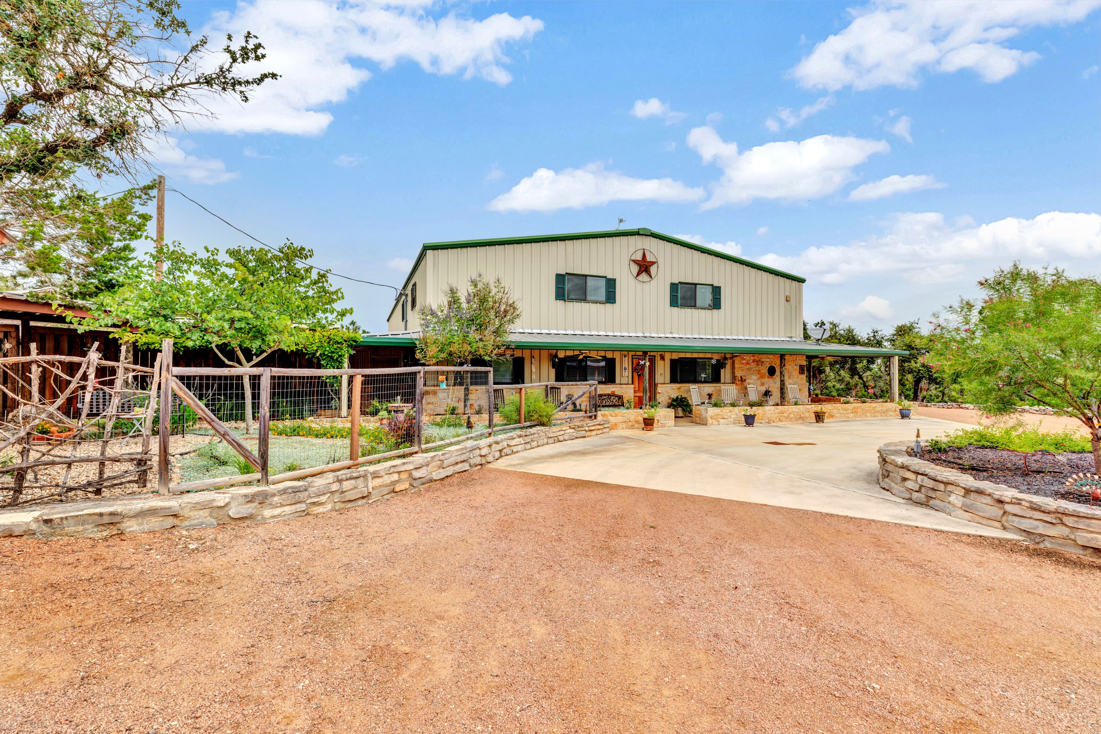 Stunning Hill Country Setting! Imagine owning your own tranquil, private, end of the road ranchette with million dollar views! This 25 acre beauty is ready for your dream home! The 2500 sqft Barndominium is ready, guest house finished, garden house with raised garden beds, chicken coop, Summer kitchen, above ground swimming pool, outdoor shower and the outdoor entertainment park are all waiting for you! Perimeter fenced and electric gated entry. This is truly one of a kind!