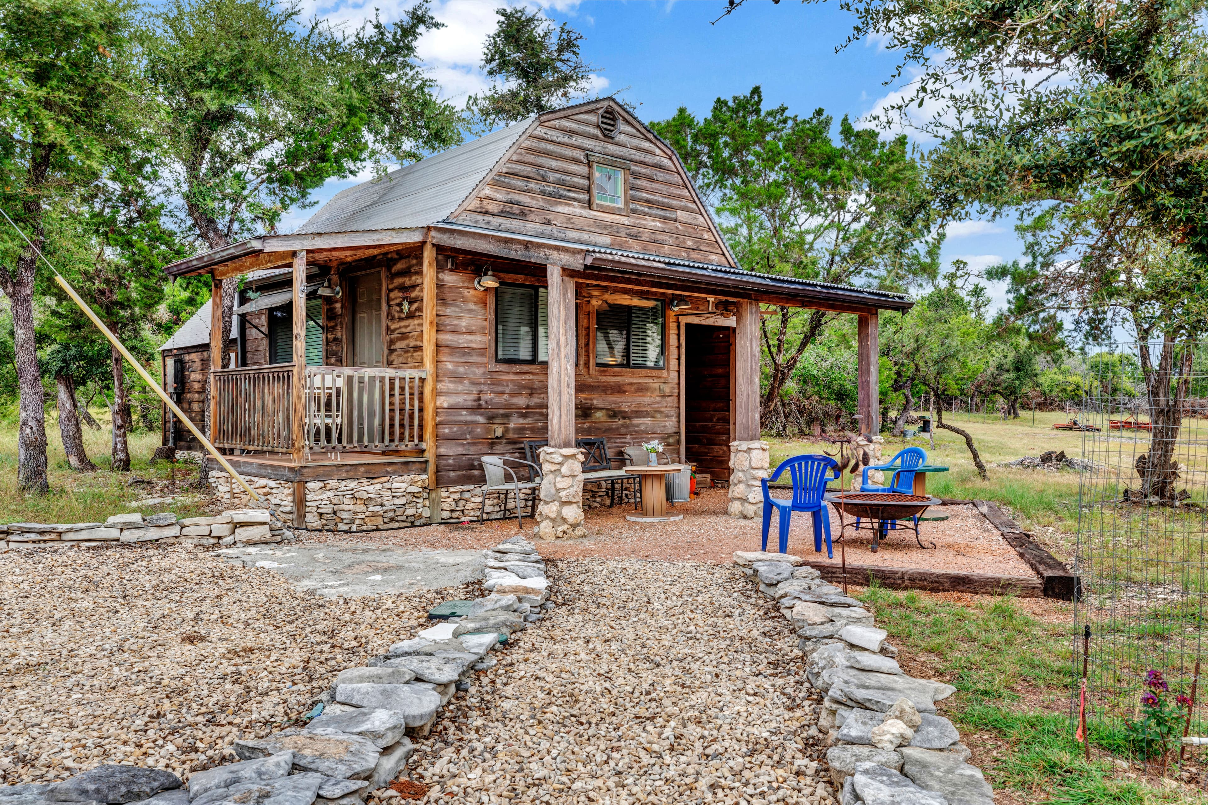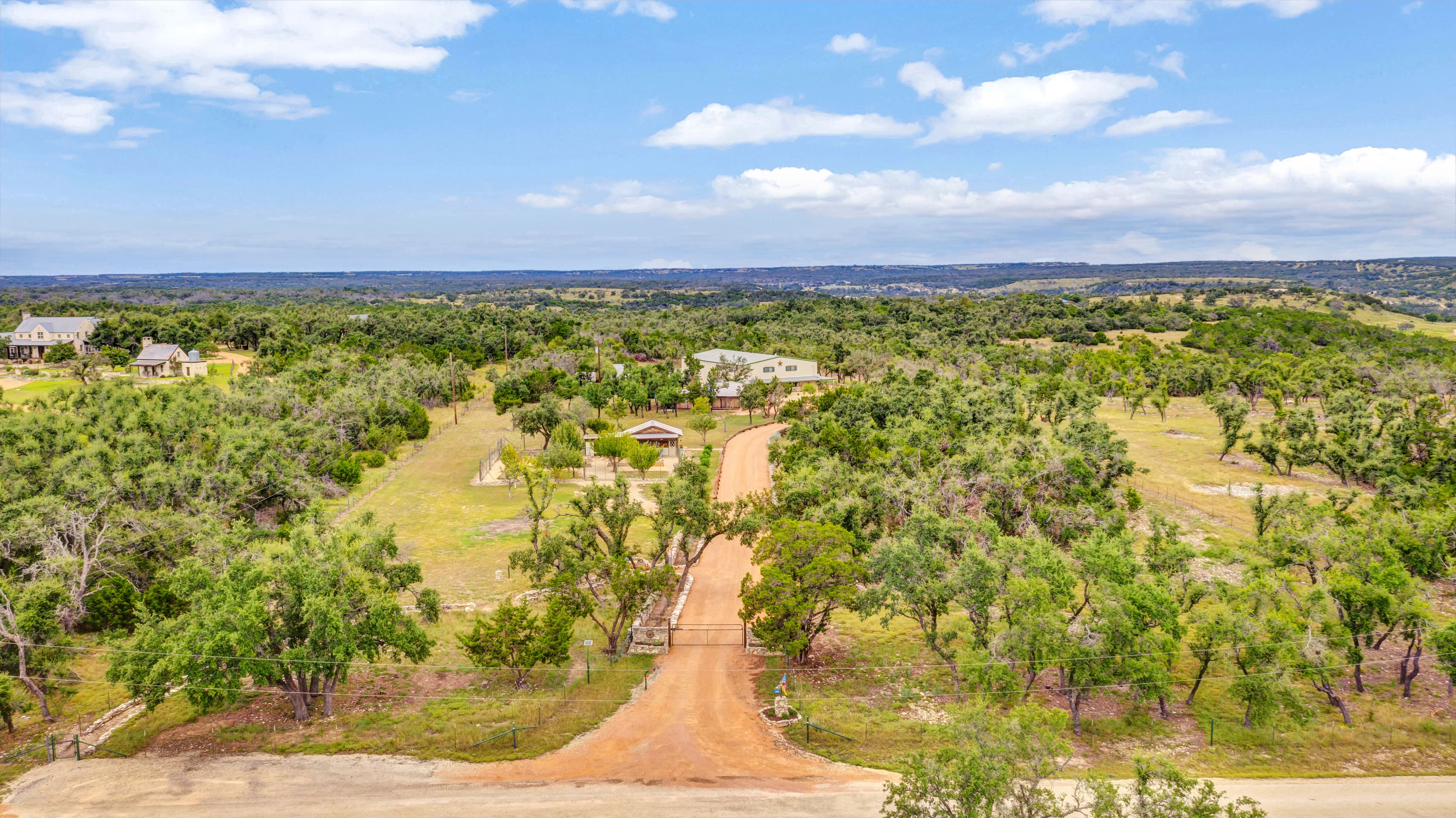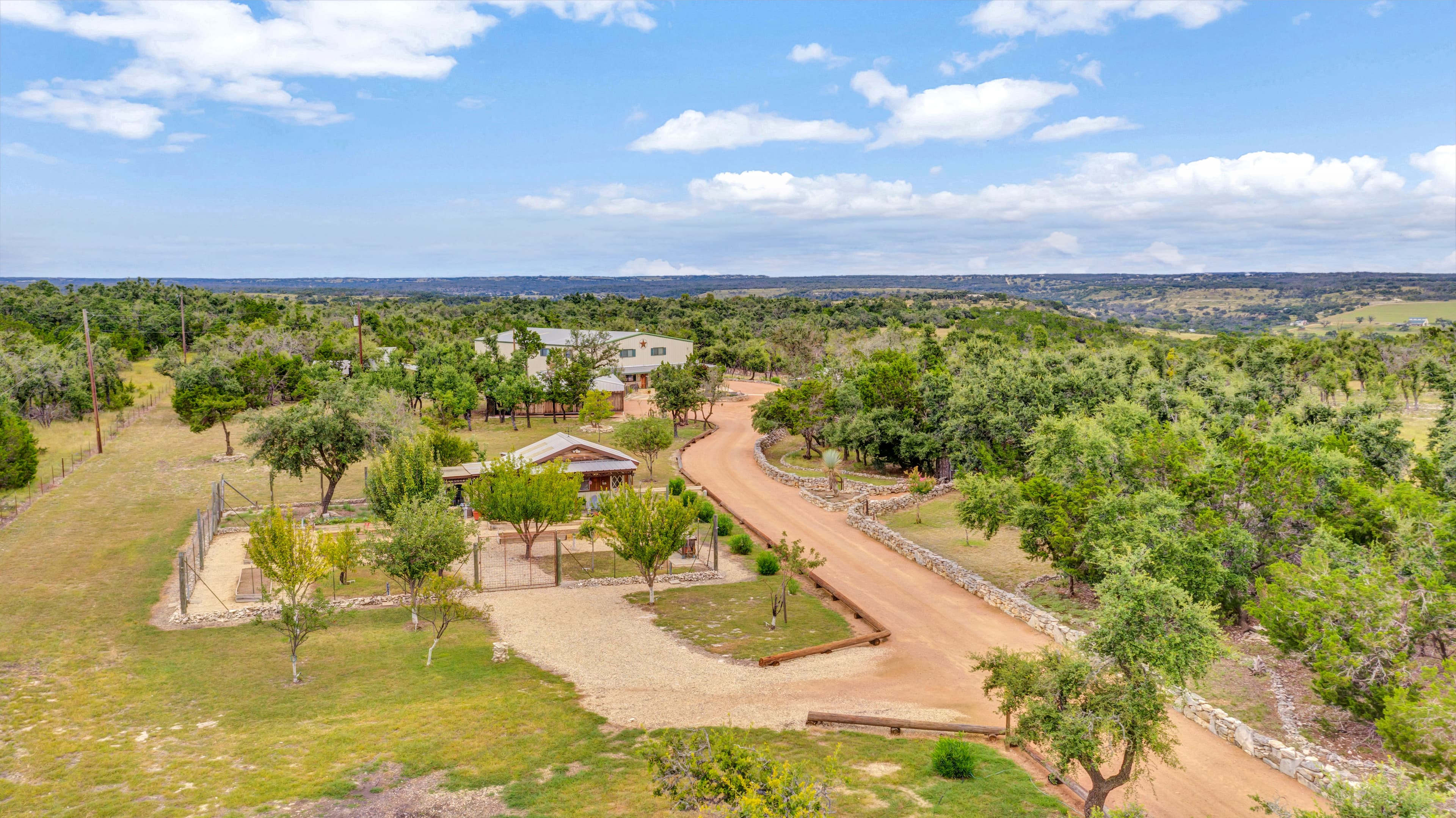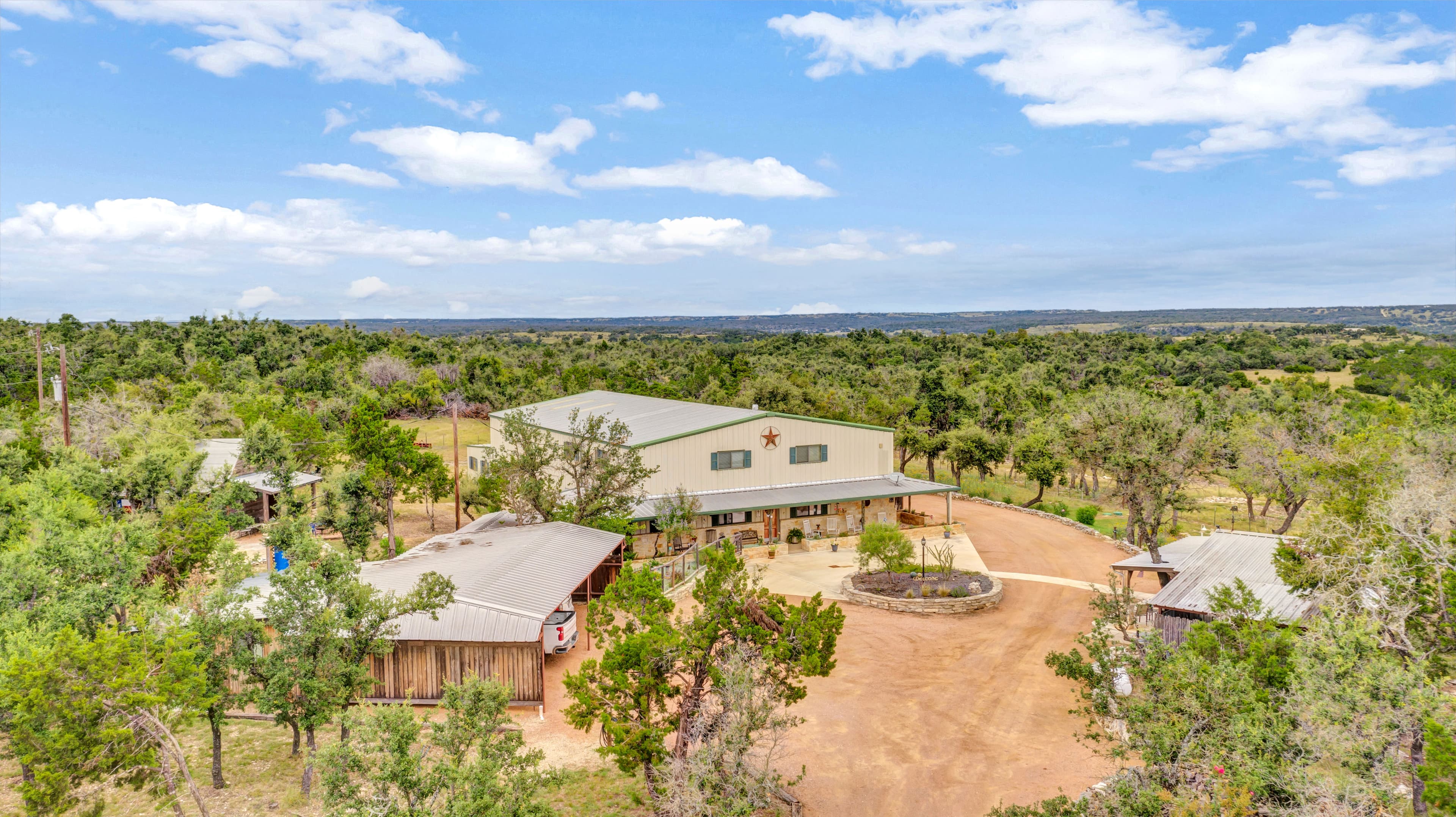 Stunning Hill Country Setting! Imagine owning your own tranquil, private, end of the road ranchette with million dollar views! This 25 acre beauty is ready for your dream home! The 2500 sqft Barndominium is ready, guest house finished, garden house with raised garden beds, chicken coop, Summer kitchen, above ground swimming pool, outdoor shower and the outdoor entertainment park are all waiting for you! Perimeter fenced and electric gated entry. This is truly one of a kind!