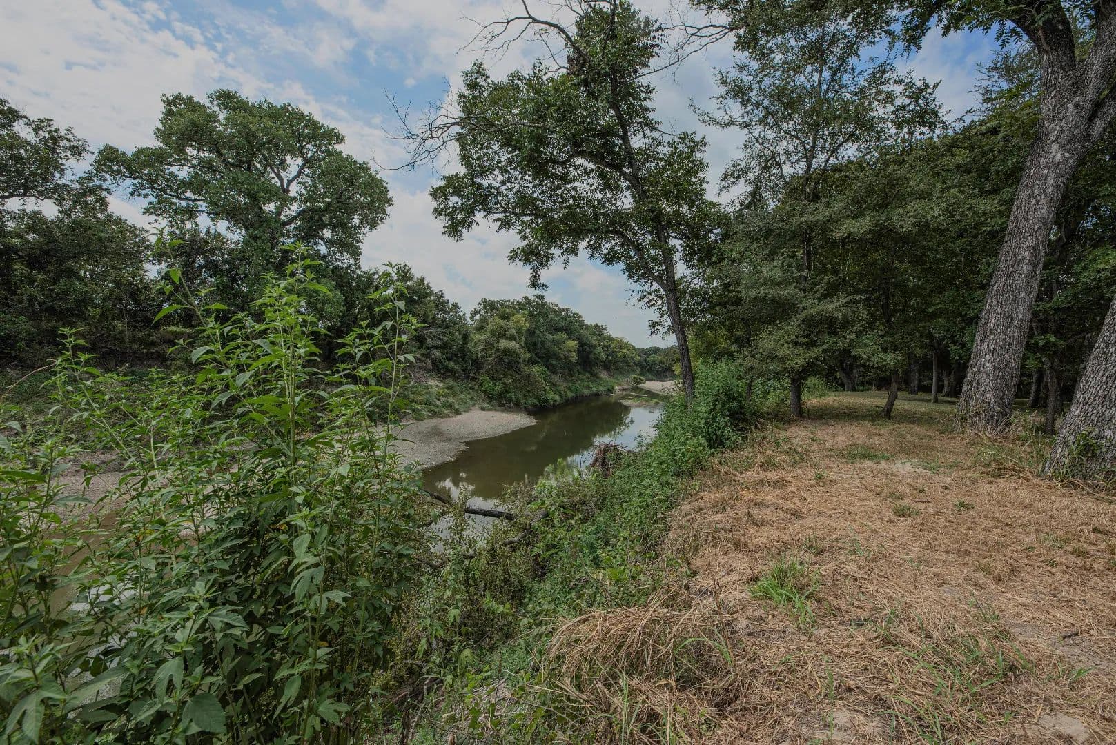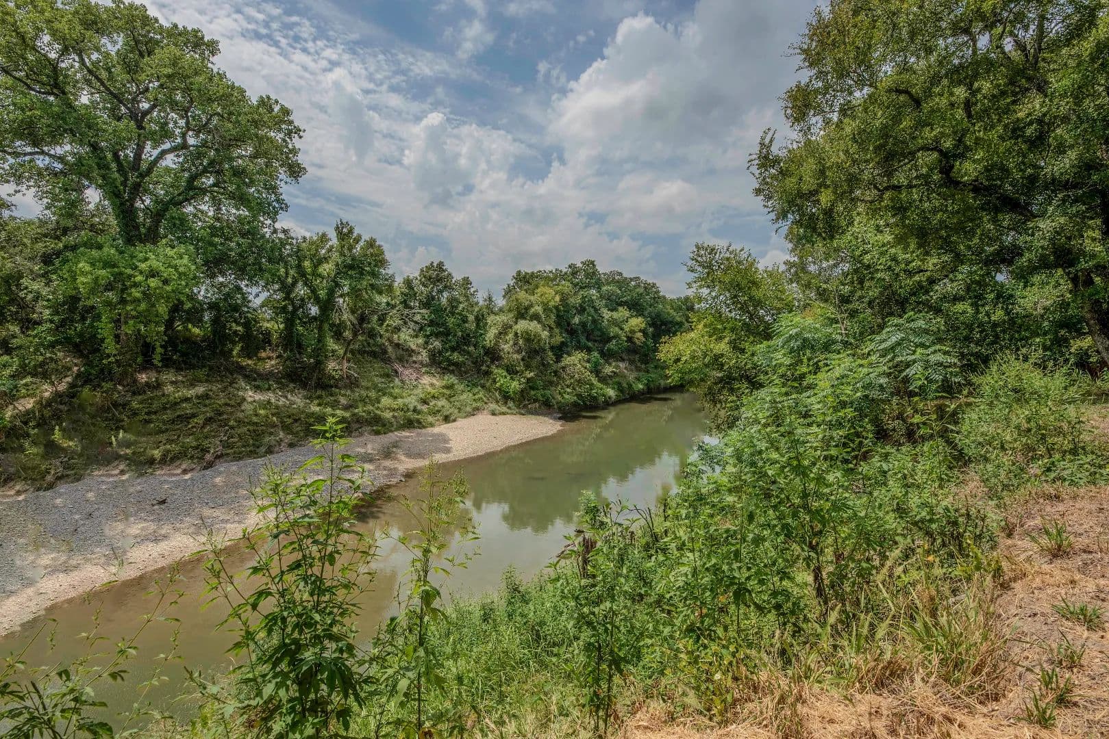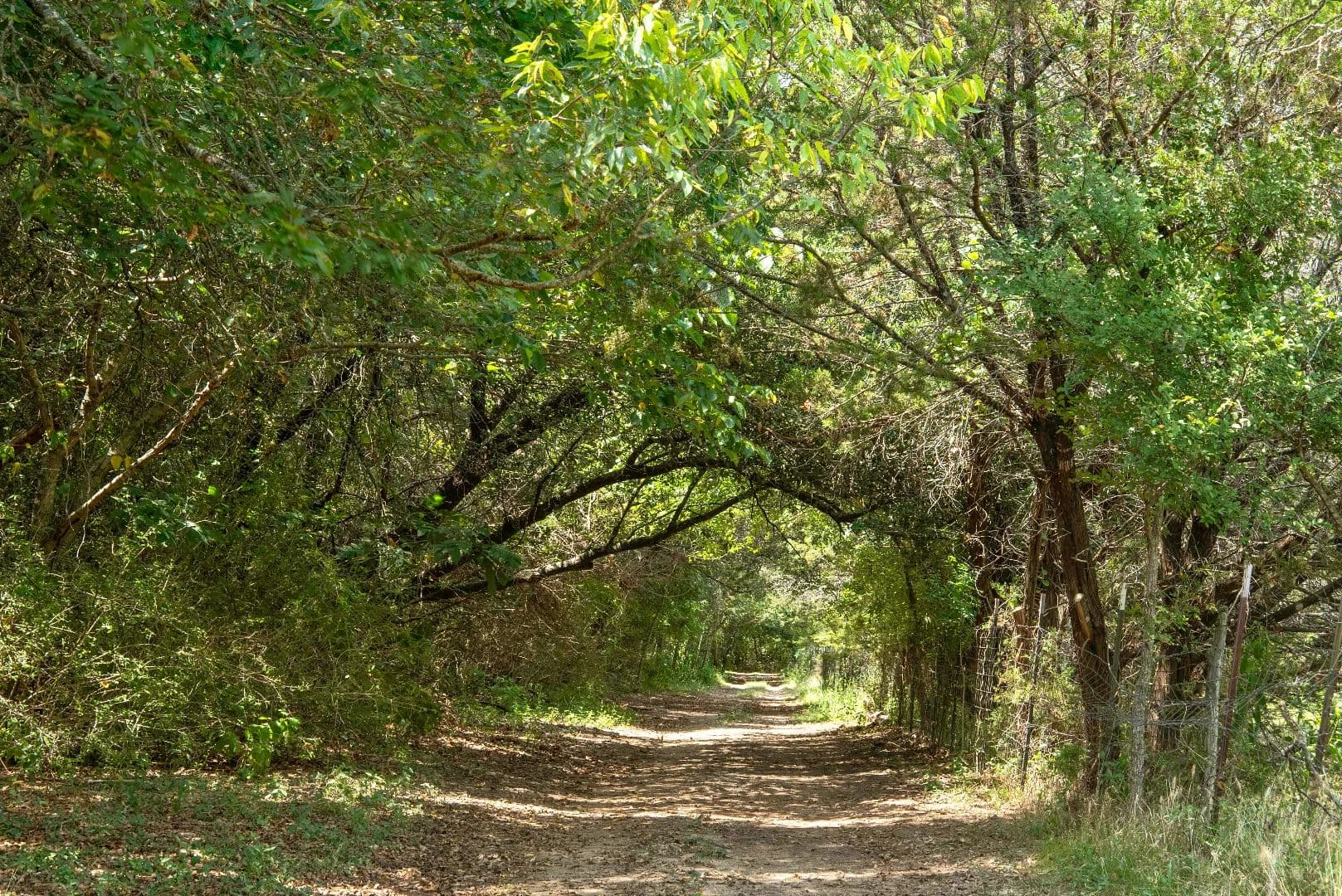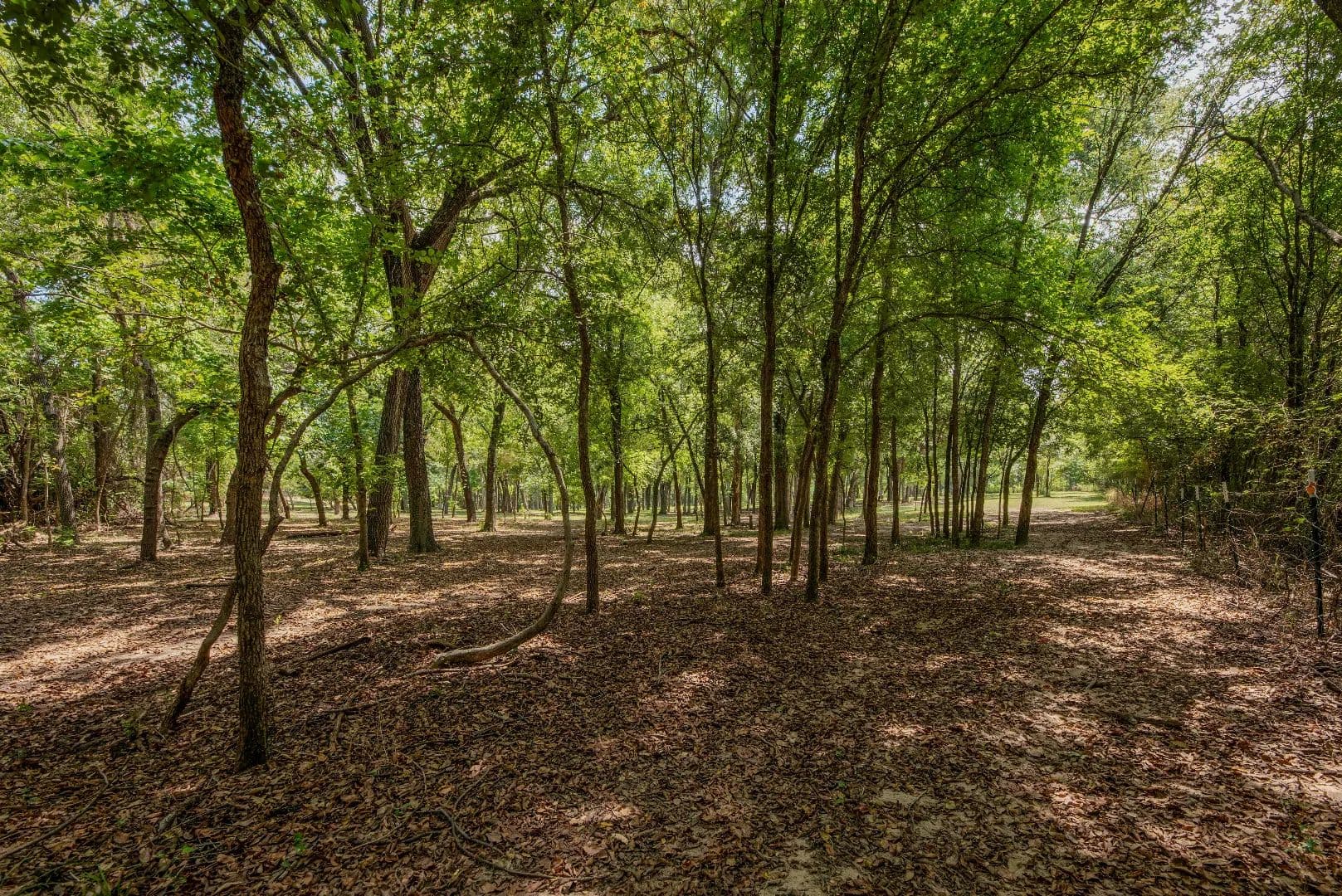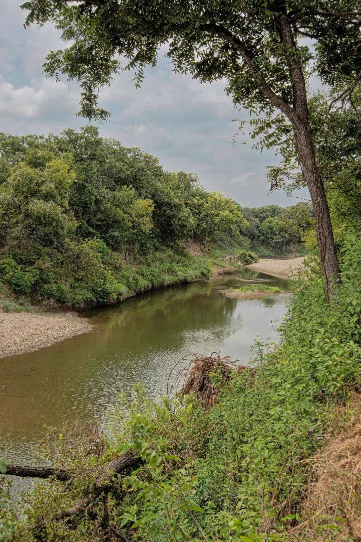A tree-canopied drive leads to the serene Bosque River, where you can fish, canoe, or kayak along its gentle flow. The mix of open field, wooded wildlife habitat, and dappled sunlight filtering through the trees creates a setting that is both peaceful and inspiring.
