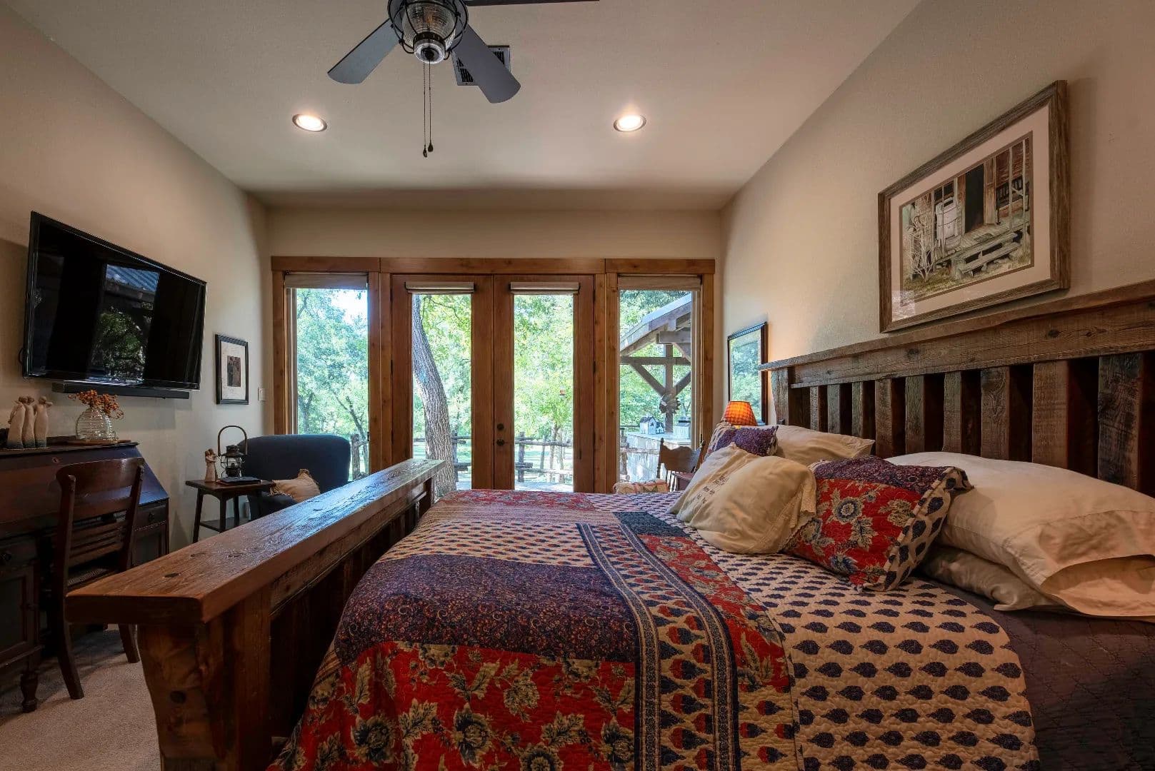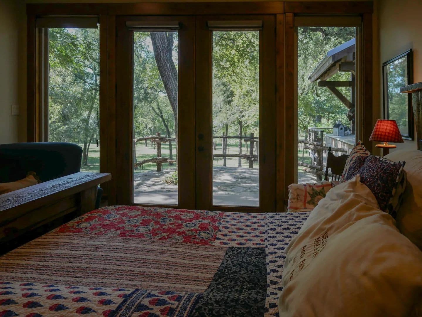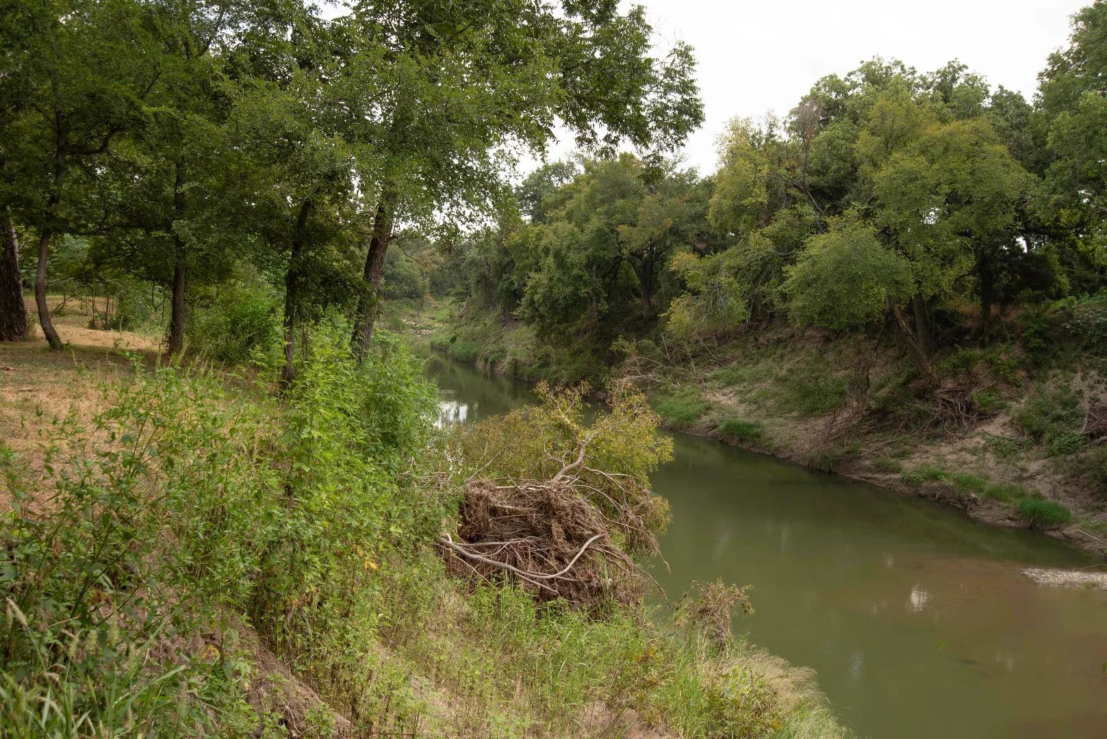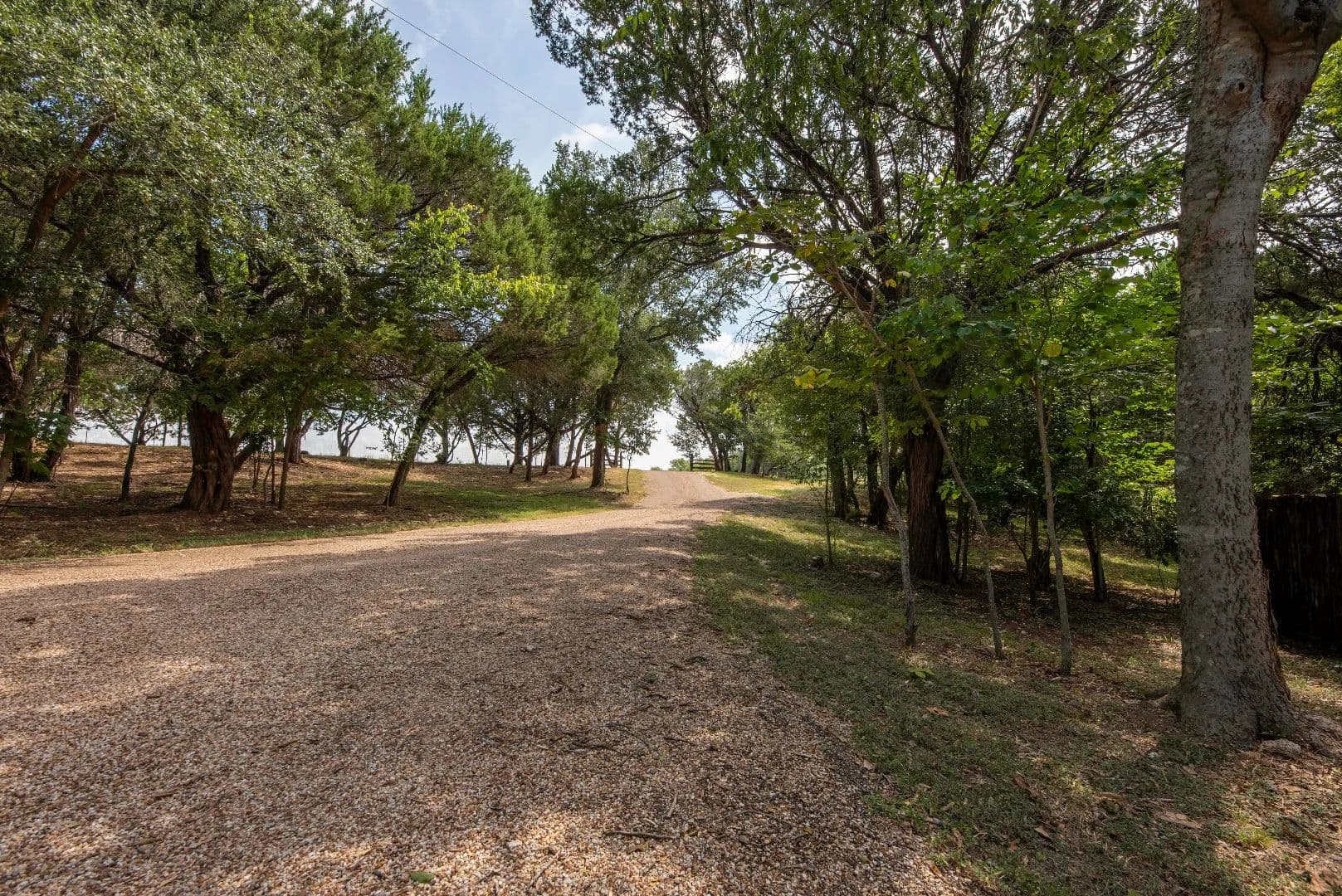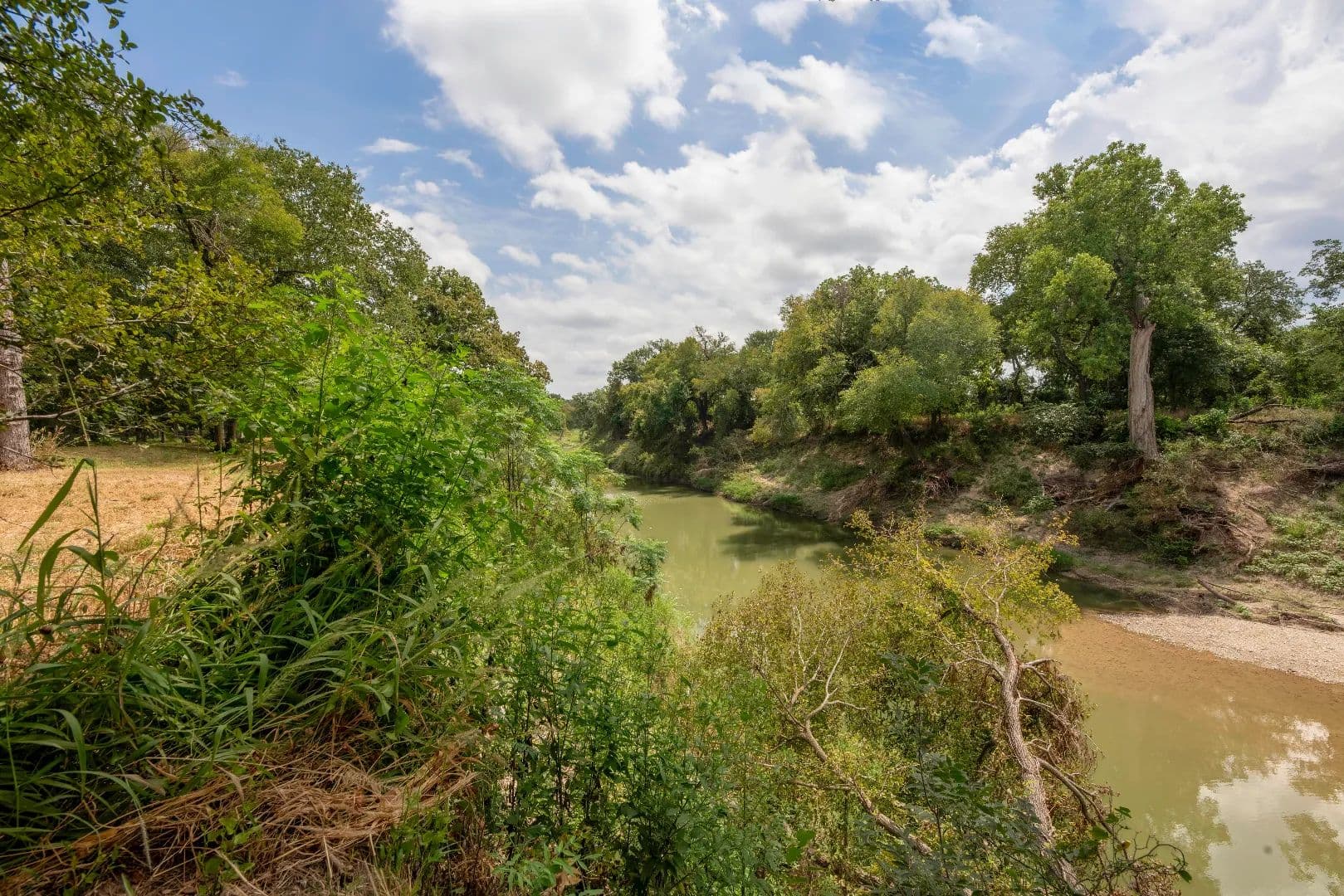 A tree-canopied drive leads to the serene Bosque River, where you can fish, canoe, or kayak along its gentle flow. The mix of open field, wooded wildlife habitat, and dappled sunlight filtering through the trees creates a setting that is both peaceful and inspiring.