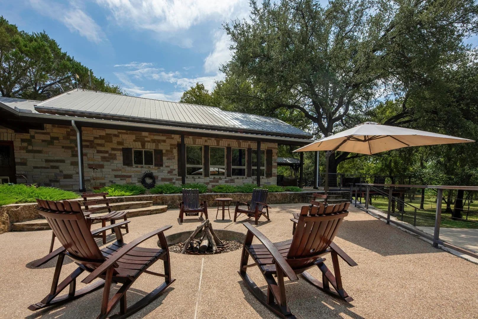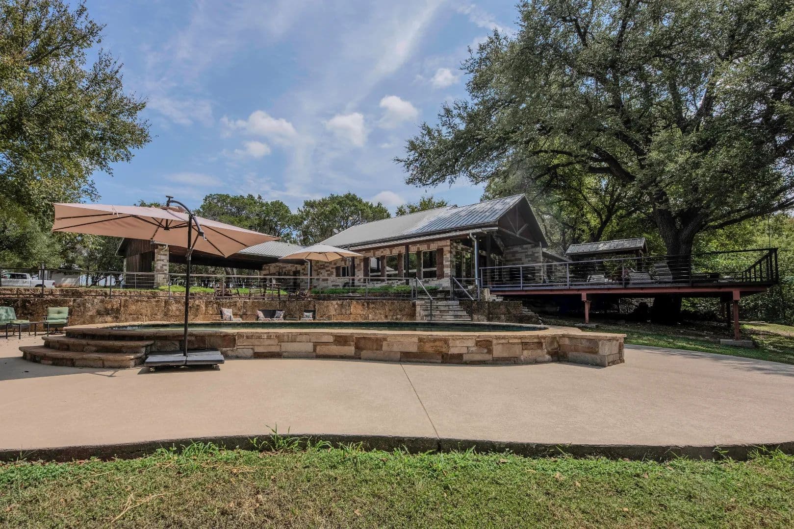 From the carport or the main deck, custom rock steps take you to a 2nd mezzanine deck of exposed aggregate concrete which features a tile lined and drained fire pit. Terracing for the mezzanine deck is accomplished with Cave Face Limestone blocks. This deck also has a cable railing system.