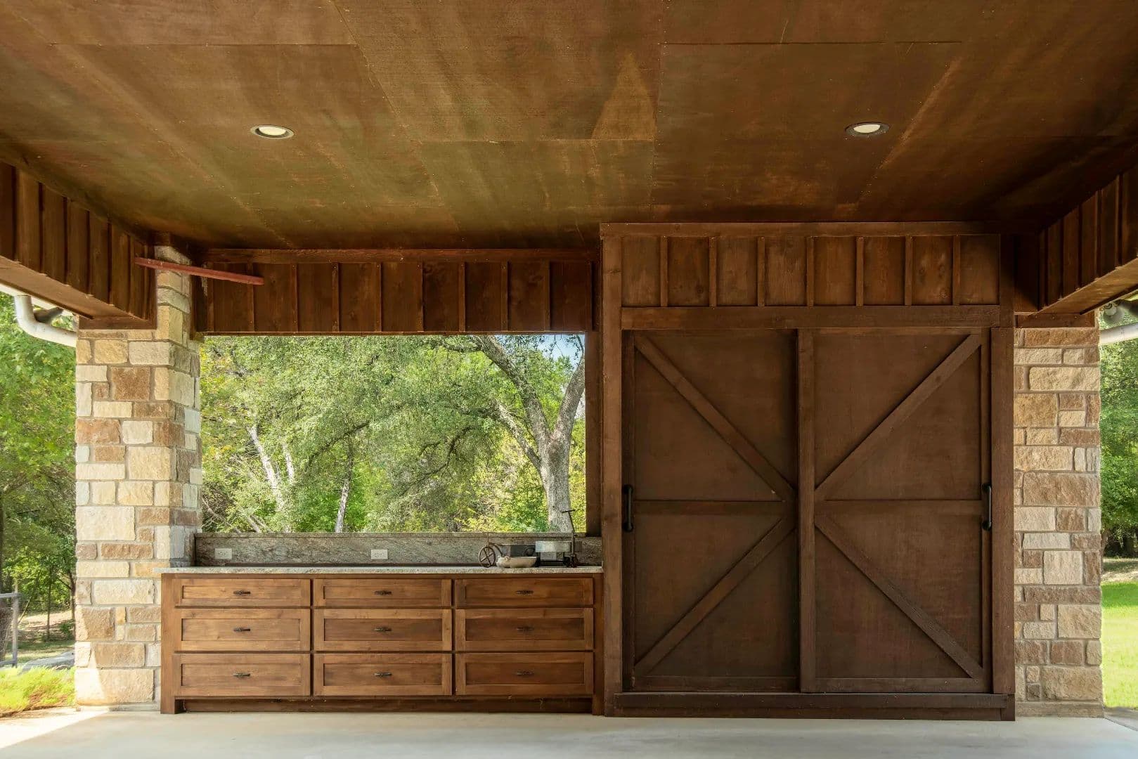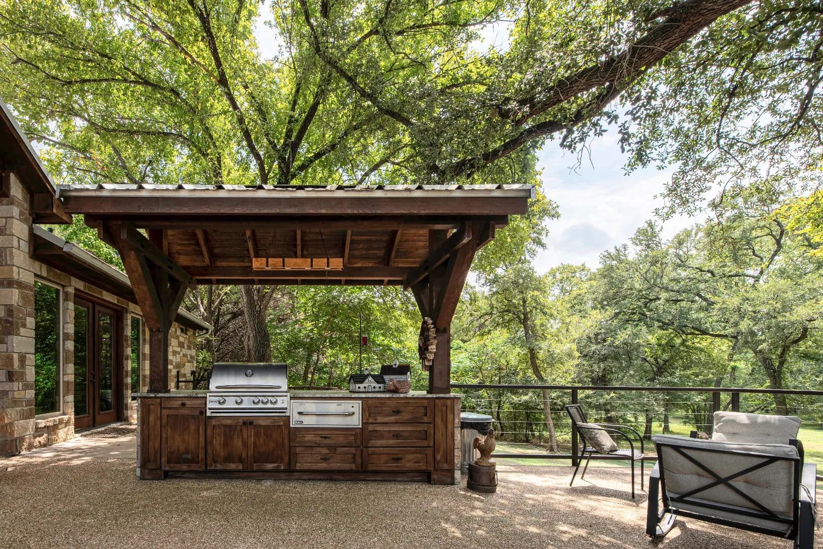 Covered and lighted outdoor kitchen with granite-topped cedar cabinets and drawers, a stainless-steel propane grill (piped propane) and an electric warming drawer.