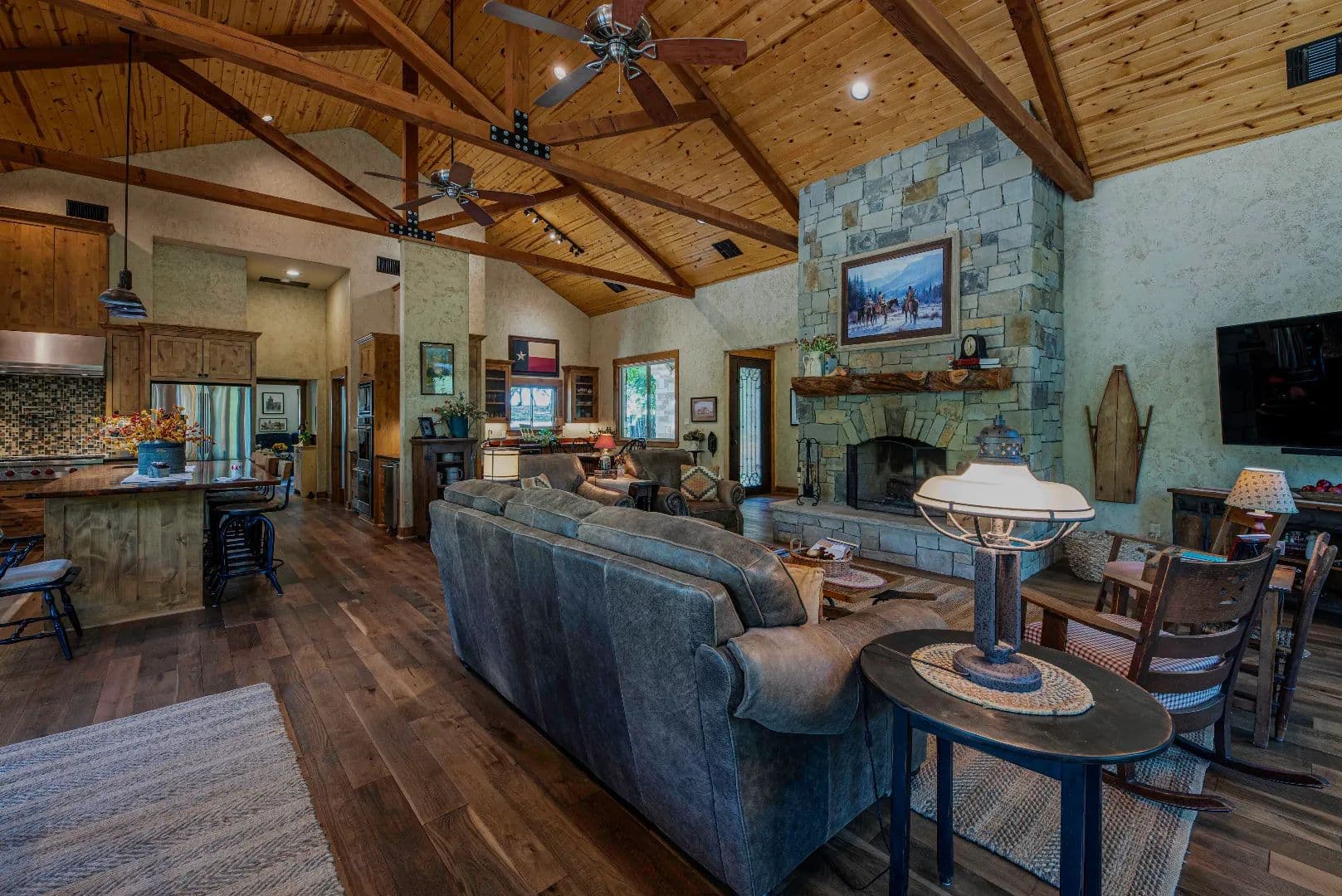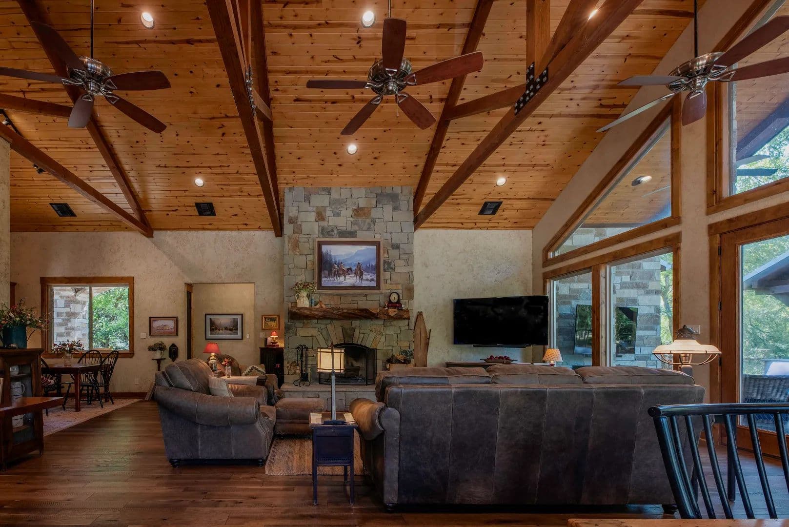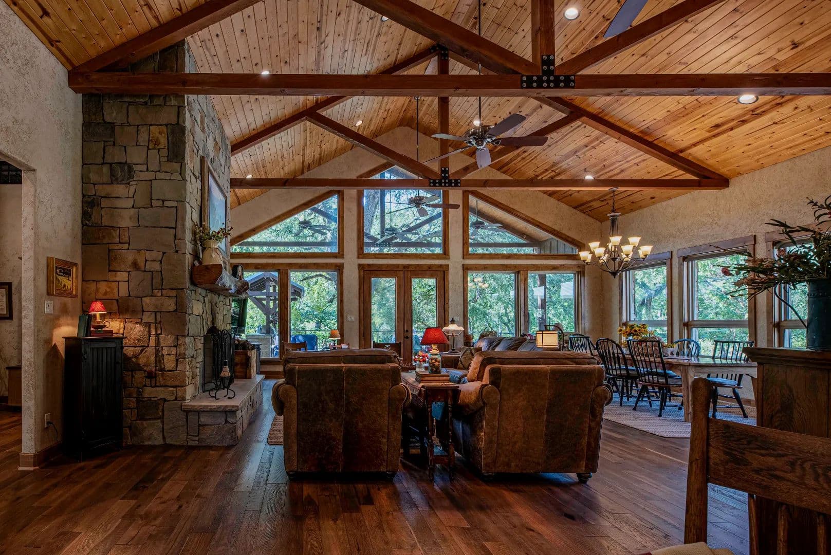 • True masonry stacked stone fireplace featuring a slabbed Red Oak mantle and piped with a propane log lighter
