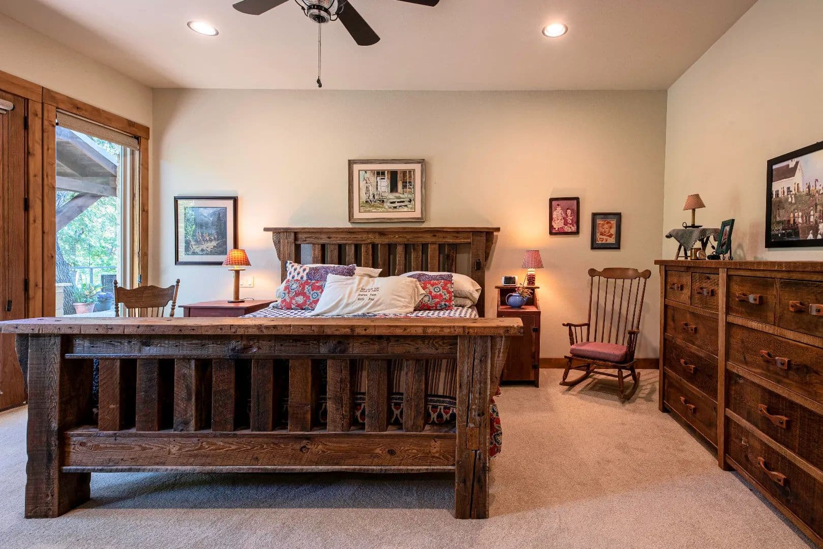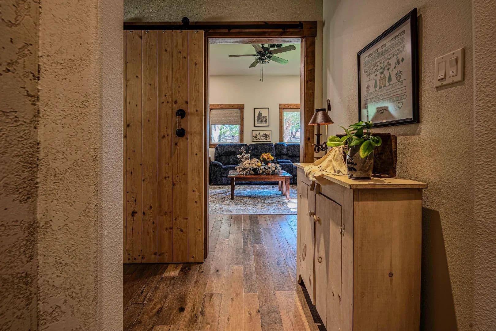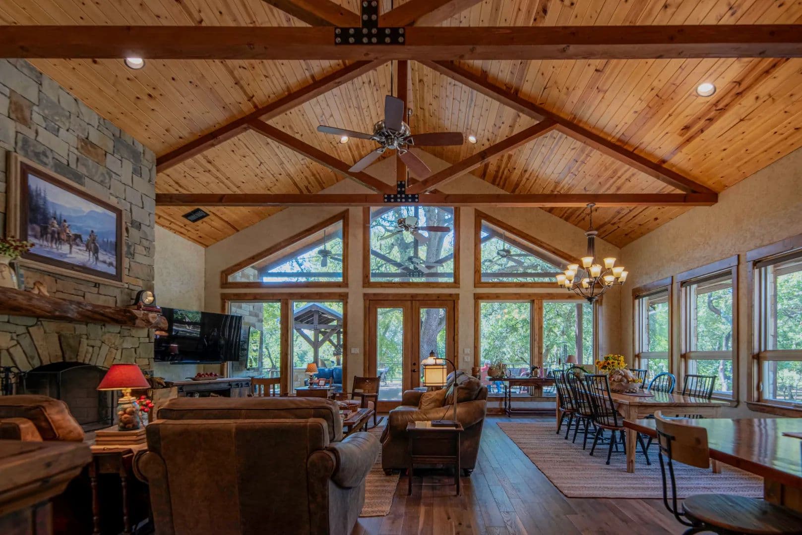 • True masonry stacked stone fireplace featuring a slabbed Red Oak mantle and piped with a propane log lighter