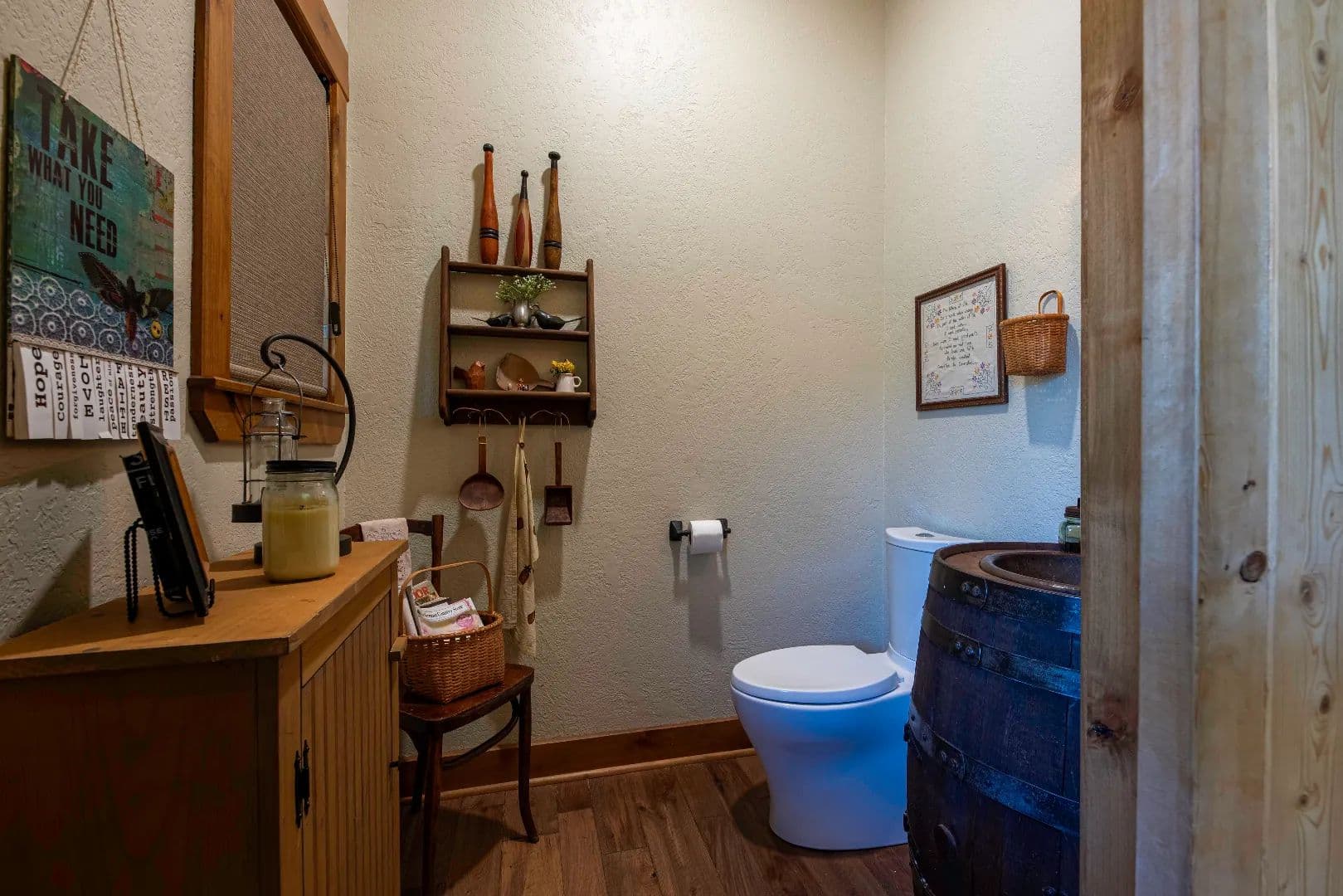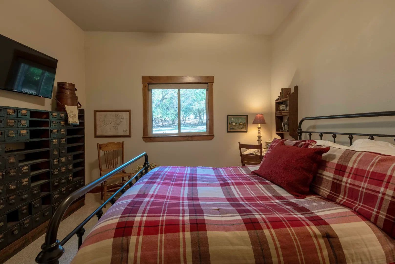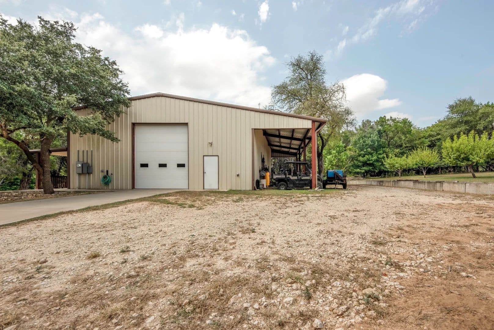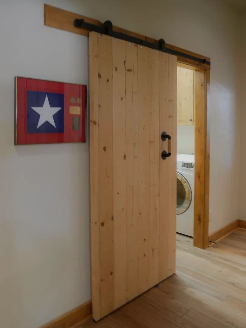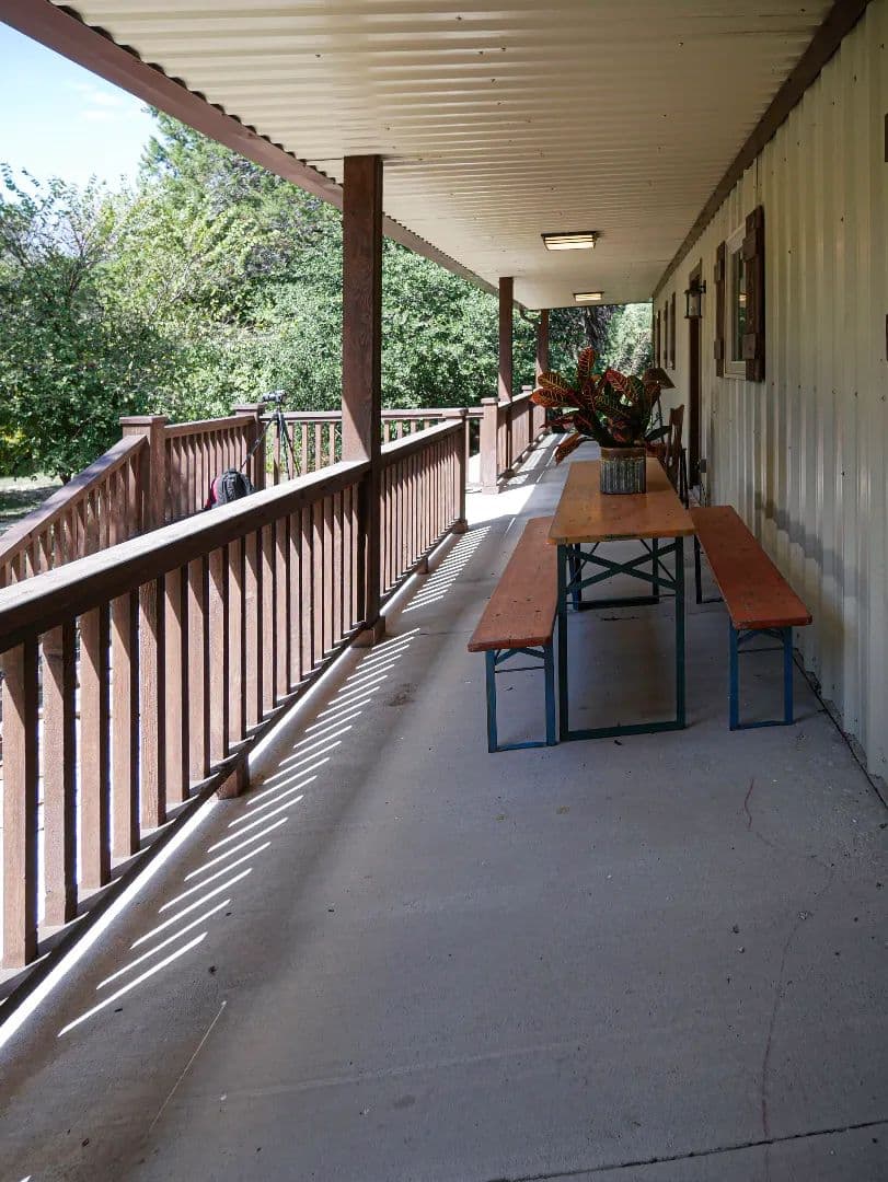 Water in the shop is supplied from the well house system for the main house and is conditioned water. Water is heated by means of an electric tankless water heater. Wastewater is treated by a septic system installed off the northeast corner of the building specifically to accommodate the living space addition. An elevated concrete front porch and a metal porch roof was added along the entire west side of the building. The railing for the porch is stained cedar and custom stone steps provide access to the Bunkhouse entrance.