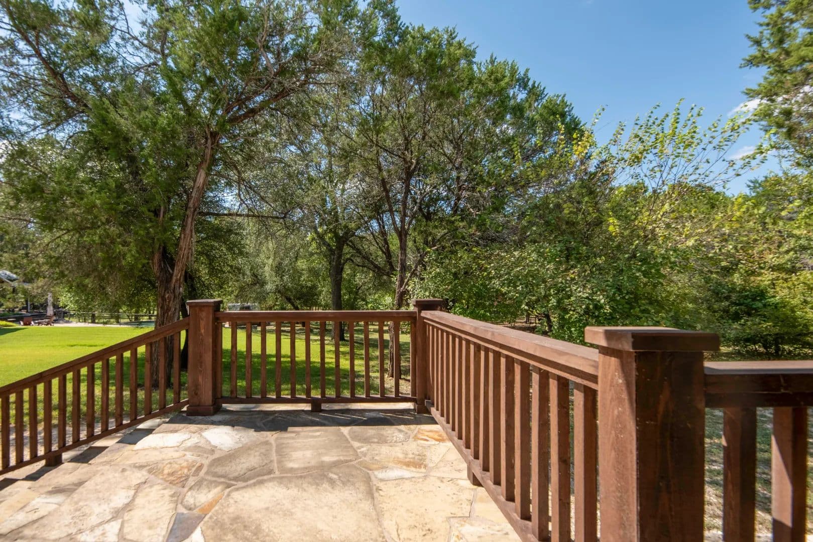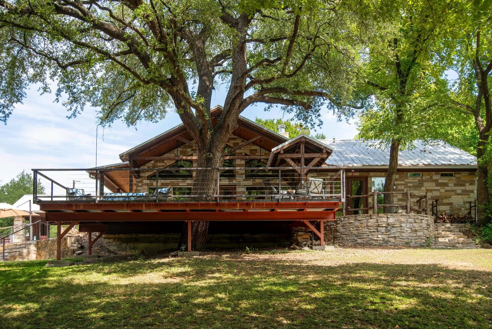 The 4th deck is an elevated, custom stone deck with rough cedar railing directly off the master bedroom, with stone steps leading down to the yard.